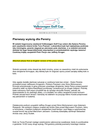 Pierwszy wyścig dla Pereiry W ostatni tegoroczny weekend Volkswagen Golf Cup celem dla Dylana Pereiry jest uzyskanie miana króla Toru Poznań. Luksemburczyk był najszybszy podczas obu treningów, pewnie sięgnął po pierwsze pole startowe, a w sobotni poranek dołożył do tego bezproblemowe zwycięstwo w przedostatnim wyścigu sezonu! Czołową trójkę uzupełnili Piotr Parys oaz Jeffrey Kruger. Attached please find an English version of the press release Sobotni poranek znów okazał się dość mroźny, przez co zawodnicy mieli do pokonania dwa okrążenia formujące, aby łatwiej było im dogrzać opony przed zaciętą walką koło w koło. Gdy zgasły światła startowe sytuacja w czołówce była bez zmian - Dylan Pereira prowadził przed Jeffreyem Krugerem, Piotrem Parysem oraz Simo Muhonenem. Emocje poszybowały w górę podczas czwartego okrążenia, kiedy Parys przeprowadził odważny atak na lidera klasyfikacji punktowej i przeskoczył na drugie miejsce. Później biało-czerwony Golf wręcz przykleił się do tylnego skrzydła Pereiry, jednak nie doprowadziło to do żadnego ataku, a w dodatku na cztery okrążenia przed końcem Piotrek zaczął tracić tempo i bardziej niż atakiem na pozycję lidera musiał przejmować się patrzeniem w lusterka. Ostatecznie podium uzupełnił Jeffrey Kruger przed Simo Muhonenem oraz Adamem Rzepecki. Na szóstym miejscu znalazł się Andre Gies przed Marcusem Fluchem, który w końcówce, z każdym kolejnym okrążeniem tracił tempo i pod flagą w szachownicę musiał bronić się przed Marcinem Jarosem. Czołową dziesiątkę zamknęli Sebastian Arriola oraz Jerzy Dudek. Dziś na Torze Poznań nastąpi zwieńczenie całorocznej rywalizacji, kiedy to punktualnie o godzinie 14:00 ruszy drugi wyścig. Pół godziny później poznamy trzeciego mistrza Volkswagen Golf Cup! Wypowiedzi po pierwszym wyścigu na Torze Poznań: Dylan Pereira: - Wyścig był bardzo fajny. Na pierwszych okrążeniach ostro walczyliśmy z Jeffreyem, więc starałem się utrzymać koncentrację i nie popełnić żadnych błędów. Kiedy zobaczyłem, że Parys wyprzedził Krugera wiedziałem, iż jest dobrze i starałem się na każdym kolejnym okrążeniu zrobić swoje i pojechać jak najlepiej. Jeffrey Kruger: - Wyścig wyszedł całkiem nieźle. Początkowo walczyłem z Dylanem, jednak później popełniłem błąd i dałem się wyprzedzić Piotrkowi Parysowi. Później jednak on jechał bardzo dobrze i nie byłem w stanie go do gonić, więc zasłużył na swoją pozycję. Gratuluje zarówno jemu, jak i Dylanowi, gdyż jechali bardzo dobrze. Piotr Parys: - Jestem bardzo zadowolony z pierwszego wyścigu. Dobrze wystartowałem i przez cały wyścig utrzymywałem świetne tempo, choć niestety nie wystarczyło to do pokonania Dylana Pereiry. Popołudniu czeka nas drugi wyścig i mam nadzieję, że wynik będzie co najmniej równie dobry. Lista startowa w sezonie 2015 1. ARRIOLA Sebastian GUATEMALA 2. ARTEMYEV Alexandr KAZAKHSTAN 3. DUDEK Jerzy POLAND 4. EGOROV Artur RUSSIA 5. STRZESAK Patryk POLAND 6. FLUCH Marcus SWEDEN 7. GADOMSKI Michał POLAND 8. GIES Andre GERMANY 9. HOFFMANN Pascal GERMANY 10. IBRAGIMOV Ilshat RUSSIA 11. JAROS Marcin POLAND 12. SZCZEŚNIAK Jędrzej POLAND 13. KRAMER Alfred AUSTRIA 14. KRUGER Jeffrey SOUTH AFRICA 15. LARSSON Simon SWEDEN 16. METZNER Kevin GERMANY 17. MUHONEN Simo FINLAND 18. PALUSKO Bartosz POLAND 19. PARYS Piotr POLAND 20. PEREIRA Dylan LUXEMBOURG 21. RDEST Gosia POLAND 22. RZEPECKI Adam POLAND 101. SZWAGIERCZAK Zbigniew (Gość) POLAND 102. JURECKI Jacek (Gość) POLAND 103. JANCAUSKAS Mantas (Gość) LITHUANIA www.volkswagengolfcup.pl – najświeższe informacje Na stronie internetowej pucharu www.volkswagengolfcup.pl dostępne są informacje dotyczące wszystkich rund, zawodników, torów wyścigowych oraz samochodu. W ciągu weekendu wyścigowego publikowane będą aktualne informacje o przebiegu treningów, kwalifikacji oraz wyścigów. W zakładce „Media” zamieszczane są komunikaty prasowe oraz zdjęcia. Zdjęcia w wysokiej rozdzielczości do pobrania: http://volkswagencastrolcup.pl/index.php/materialy-prasowe/