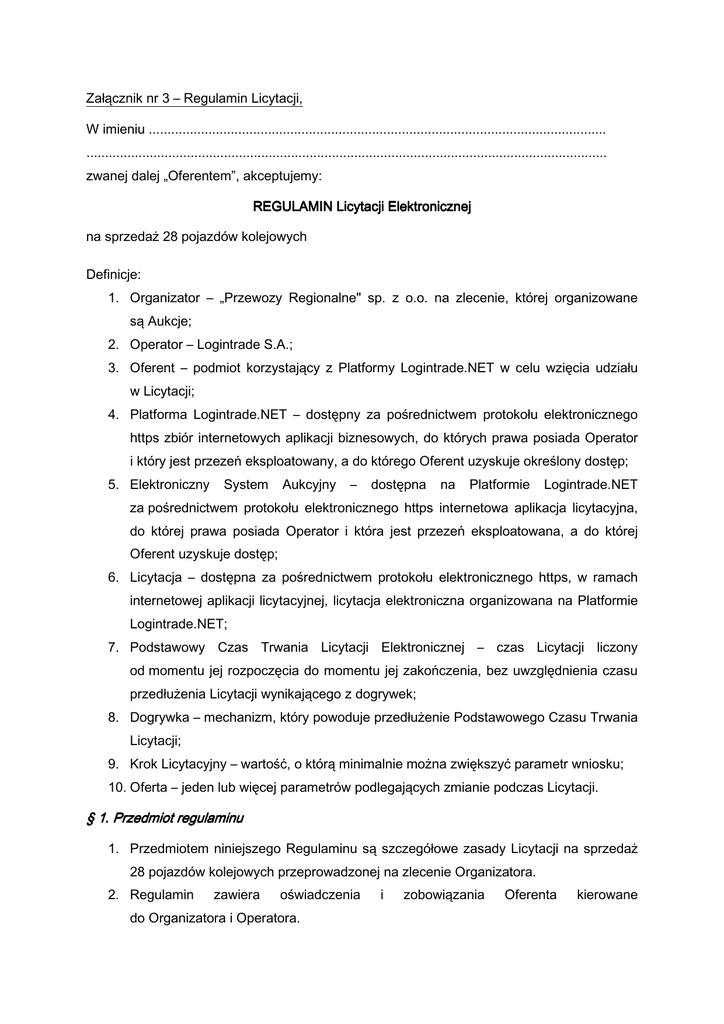 Załącznik nr 3 – Regulamin Licytacji, W imieniu ........................................................................................................................... ............................................................................................................................................ zwanej dalej „Oferentem”, akceptujemy: REGULAMIN Licytacji Elektronicznej na sprzedaż 28 pojazdów kolejowych Definicje: 1. Organizator – „Przewozy Regionalne" sp. z o.o. na zlecenie, której organizowane są Aukcje; 2. Operator – Logintrade S.A.; 3. Oferent – podmiot korzystający z Platformy Logintrade.NET w celu wzięcia udziału w Licytacji; 4. Platforma Logintrade.NET – dostępny za pośrednictwem protokołu elektronicznego https zbiór internetowych aplikacji biznesowych, do których prawa posiada Operator i który jest przezeń eksploatowany, a do którego Oferent uzyskuje określony dostęp; 5. Elektroniczny System Aukcyjny – dostępna na Platformie Logintrade.NET za pośrednictwem protokołu elektronicznego https internetowa aplikacja licytacyjna, do której prawa posiada Operator i która jest przezeń eksploatowana, a do której Oferent uzyskuje dostęp; 6. Licytacja – dostępna za pośrednictwem protokołu elektronicznego https, w ramach internetowej aplikacji licytacyjnej, licytacja elektroniczna organizowana na Platformie Logintrade.NET; 7. Podstawowy Czas Trwania Licytacji Elektronicznej – czas Licytacji liczony od momentu jej rozpoczęcia do momentu jej zakończenia, bez uwzględnienia czasu przedłużenia Licytacji wynikającego z dogrywek; 8. Dogrywka – mechanizm, który powoduje przedłużenie Podstawowego Czasu Trwania Licytacji; 9. Krok Licytacyjny – wartość, o którą minimalnie można zwiększyć parametr wniosku; 10. Oferta – jeden lub więcej parametrów podlegających zmianie podczas Licytacji. § 1. Przedmiot regulaminu 1. Przedmiotem niniejszego Regulaminu są szczegółowe zasady Licytacji na sprzedaż 28 pojazdów kolejowych przeprowadzonej na zlecenie Organizatora. 2. Regulamin zawiera oświadczenia do Organizatora i Operatora. i zobowiązania Oferenta kierowane § 2. Elektroniczny System Licytacyjny 1. Licytacja będzie przeprowadzana z użyciem Elektronicznego Systemu Licytacyjnego, którego szczegółowy opis jest dostępny pod adresem: https://pr.logintrade.net https://pr.logintrade.net 2. Zalogowanie się do systemu Logintrade.NET wyraża akceptację regulaminu licytacji. § 3. Zasady składania ofert 1. Parametry oferty ustalone w wyniku Licytacji będą parametrami ostatecznymi. Zostaną one uznane jako parametry do umowy, o ile oferta Oferenta zostanie wybrana. Strony mogą podjąć dodatkowe negocjacje. Inicjatywa podjęcia negocjacji przysługuje wyłącznie Organizatorowi, zaś Oferent do czasu zakończenia tych negocjacji związany jest cenami, podanymi przez niego podczas Licytacji. 2. Oferty złożone przez Oferenta podczas Licytacji wiążą Oferenta aż do dokonania ostatecznego wyboru przez Organizatora (nawet gdyby inni oferenci zgłosili korzystniejsze oferty),nie dłużej jednak niż 90 dni kalendarzowych, licząc od dnia składania wniosków o dopuszczenie do udziału w licytacji elektronicznej. 3. Organizator może odwołać licytację, a także ją zamknąć (w części lub w całości) bez wyboru oferty, bez podania przyczyny. § 4. Przedmiot Licytacji Przedmiotem Licytacji jest 28 pojazdów kolejowych, z podziałem na 28 odrębnych zadań opisanych w załączniku nr 1 do Ogłoszenia. § 5. Czas trwania Licytacji 1. Termin licytacji: o terminie Oferenci zostaną powiadomieni po upływie terminu składania wniosków o dopuszczenie do licytacji. 2. Podstawowy Czas Trwania Licytacji Elektronicznej to 5 minut. Podstawowy Czas Trwania może zostać wydłużony o ewentualne dogrywki. Zasady dogrywek zostały przedstawione w ust. 3. 3. Dogrywka będzie miała miejsce, jeśli w ciągu ostatniej minuty czasu trwania Licytacji zostanie złożona nowa oferta. W takim przypadku Licytacja zostanie przedłużona o 1 minutę. Maksymalna ilość dogrywek: 10. § 6. Ceny i licytacja 1. Wartością licytowaną będzie cena netto, licytowana odrębnie dla wszystkich przedmiotów licytacji. 2. Dostępna widoczność na konsoli ofert: 1) wartość oferty prowadzącej; 2) wartość własnej oferty. 3. Zamawiający podaje ceny wywoławcze w Licytacji. 4. Minimalny skok licytacyjny dla pojazdów kolejowych wynosi 1000,00 zł. § 7. Pomoc podczas Licytacji Podczas Licytacji Oferent może skorzystać z pomocy telefonicznej pod numerem: +48 71 787 37 27 § 8. Opłaty Oferent nie ponosi żadnych opłat z tytułu udziału w Licytacji. ………………………………………………… Podpis oferenta