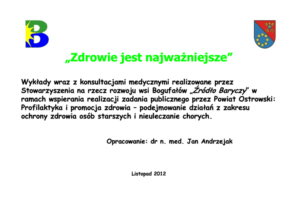 „Zdrowie jest najważniejsze” Wykłady wraz z konsultacjami medycznymi realizowane przez Stowarzyszenia na rzecz rozwoju wsi Bogufałów „Źródło Baryczy” w ramach wspierania realizacji zadania publicznego przez Powiat Ostrowski: Profilaktyka i promocja zdrowia – podejmowanie działań z zakresu ochrony zdrowia osób starszych i nieuleczanie chorych. chorych. Opracowanie: dr n. med. Jan Andrzejak Listopad 2012 Cukrzyca = podwyższony poziom cukru we krwi CUKRZYCA Zespół zaburzeń metabolicznych o różnorakiej etiologii, charakteryzujący się przewlekłą hiperglikemią z zaburzeniami metabolizmu węglowodanów, tłuszczów i białek. WHO 1999 Cukrzyca – problem osobisty i społeczny choroba przewlekła inwalidztwo powikłania cukrzycy rodzaj pracy wiedza i samokontrola wykształcenie stałe leczenie Epidemiologia cukrzycy typu 2 Prognozy 1994 2000 2010 IDDM 11,5 mln 18,1 mln 23,7 mln NIDDM 98,9 mln 157,3 mln 215,6 mln 110,4 mln 175,4 mln 239,3 mln Cukrzyca McCarty D, Zimmet P. 1994 to 2010 - Global estimates and projections. Diabetes. Cukrzyca w Polsce ~ 5% ludzi w wieku produkcyjnym = 1,2 mln Cukrzyca - kosztowny i narastający problem zdrowotny na całym świecie „W krajach rozwiniętych koszty leczenia cukrzycy stanowią ok. 8% całkowitych wydatków ponoszonych z tytułu opieki zdrowotnej.” Raport of WHO Consultation 1999. Definition, diagnosis and classification of Diabetes Mellitus and Complications. „Większość społecznych kosztów spowodowanych cukrzycą wynika z jej przewlekłych powikłań.” Home PD, BMJ. 1994; 308. Znaczenie glukozy dla organizmu Glukoza stanowi podstawowe „paliwo” dla wszystkich komórek organizmu Cukrzyca – rodzaje (typy) Typ 1 (młodzieńczy) – dzieci i młodzież Gwałtowny początek, początek, wzmożone pragnienie, wielomocz, wielomocz, chudnięcie Konieczne leczenie insuliną Typ 2 (dorosłych) – dorośli (po 40 r.ż.) i starzy Początek skryty, brak lub niewielkie objawy choroby Skuteczne leczenie dietą i tabletkami Insulina zwykle konieczna po kilku latach Cukrzyca - objawy Wzmożone pragnienie Oddawanie dużych ilości moczu Chudnięcie Osłabienie ogólne, senność Pogorszenie wzroku Nawracające infekcje Trudne gojenie ran CZĘSTO NIE MA ŻADNYCH OBJAWÓW LUB OBJAWY SĄ NIETYPOWE (DOROŚLI) BADANIE KRWI Czynniki ryzyka cukrzycy typu 2 • Dodatni wywiad rodzinny (pokrewieństwo 1 stopnia) • Wiek ≥ 45 roku życia • Otyłość, siedzący tryb życia • Upośledzona tolerancja glukozy w wywiadzie • Nadciśnienie tętnicze • Dyslipidemia • Cukrzyca ciężarnych • Urodzenie dziecka ≥ 4,5 kg The Expert Committee on the Diagnosis and Classification of Diabetes Mellitus. Diabetes Care Vol 20, No 2, July 1997. Charakterystyczne typy otyłości: „jabłka” i „gruszki” Obwód talii jest dobrym markerem ilości tłuszczu trzewnego i ryzyka powikłań Kobiety Mężczyźni cm 80 cm = wzrost ryzyka >88 cm = problemy zdrowotne 94 cm = wzrost ryzyka >102 cm = problemy zdrowotne 1Lean MEJ, et al. Lancet;1998:351:853–6 Powikłania naczyniowe cukrzycy Mikroangiopatia • Retinopatia cukrzycowa – Najczęstsza przyczyna ślepoty w krajach zachodnich • Nefropatia cukrzycowa – Główna przyczyna schyłkowej niewydolności nerek oraz dializoterapii • Neuropatia cukrzycowa – 50% pacjentów z cukrzycą typu 2 ma objawy neuropatii po 5 latach trwania cukrzycy Cukrzyca = podwy ższony podwyższony poziom cukru we krwi Powikłania naczyniowe cukrzycy Makroangiopatia • Choroba niedokrwienna serca – Przedwczesny rozwój ChNS – Podwojone ryzyko wystąpienia epizodu niedokrwienia w 55-letniej obserwacji – Gorsze rokowanie w przypadku zawału serca • Obwodowa choroba naczyniowa – 10,3 x większe ryzyko amputacji kończyny dolnej – 45% amputacji kończyny dolnej wykonywanych jest u pacjentów z cukrzycą Odkrywcy insuliny (nagroda Nobla*- 1923) - Frederick G. Banting* - Charles H. Best - James B. Collip - John J. R. Macleod* Uniwersytet w Toronto Historia • Do czasu odkrycia insuliny • cukrzyca była chorobą • śmiertelną. • Wprowadzenie leczenia • substytucyjnego insuliną • przedłużyło życie tysiącom • chorych na cukrzycę. Cukrzyca - leczenie Dieta tzw. cukrzycowa Odpowiednio dostosowany wysiłek fizyczny Insulina (zastrzyki, pompa insulinowa) Doustne leki pp-cukrzycowe (tabletki) SAMOKONTROLA Aktywność fizyczna - zalety • Aktywność fizyczna – zalety Czynnik niezbędny do prawidłowego rozwoju fizycznego i psychicznego psychicznego.. Nieodzowny element leczenia cukrzycy • DZIĘKUJĘ ZA UWAGĘ