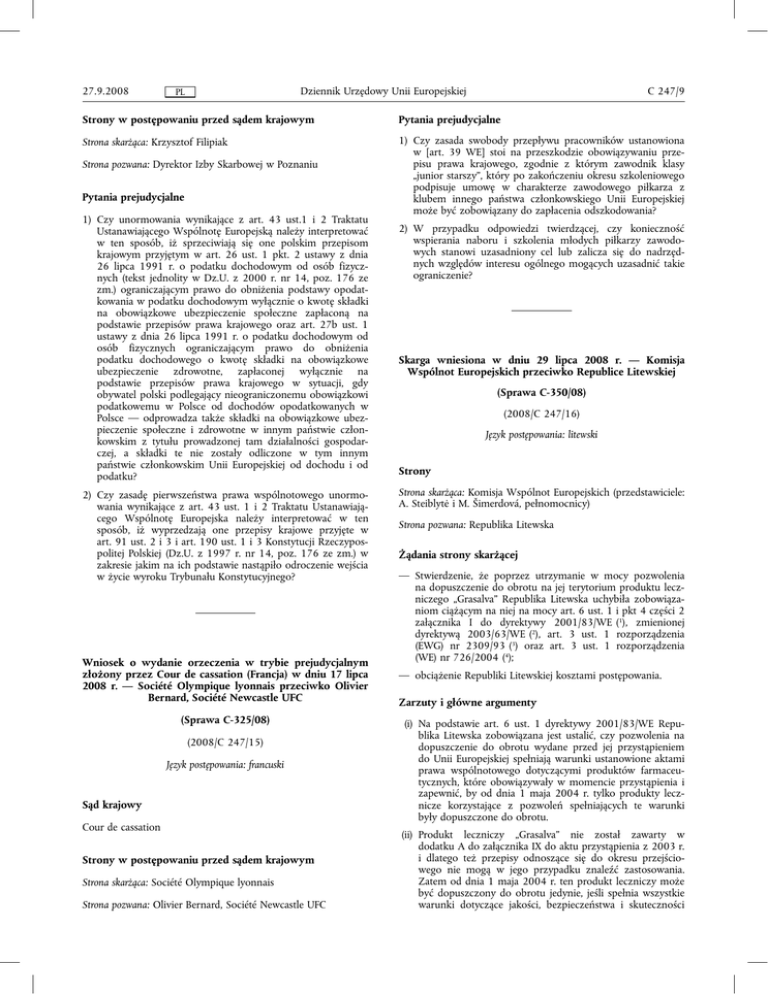 27.9.2008 Dziennik Urzędowy Unii Europejskiej PL C 247/9 Strony w postępowaniu przed sądem krajowym Pytania prejudycjalne Strona skarżąca: Krzysztof Filipiak 1) Czy zasada swobody przepływu pracowników ustanowiona w [art. 39 WE] stoi na przeszkodzie obowiązywaniu przepisu prawa krajowego, zgodnie z którym zawodnik klasy „junior starszy”, który po zakończeniu okresu szkoleniowego podpisuje umowę w charakterze zawodowego piłkarza z klubem innego państwa członkowskiego Unii Europejskiej może być zobowiązany do zapłacenia odszkodowania? Strona pozwana: Dyrektor Izby Skarbowej w Poznaniu Pytania prejudycjalne 1) Czy unormowania wynikające z art. 43 ust.1 i 2 Traktatu Ustanawiającego Wspólnotę Europejską należy interpretować w ten sposób, iż sprzeciwiają się one polskim przepisom krajowym przyjętym w art. 26 ust. 1 pkt. 2 ustawy z dnia 26 lipca 1991 r. o podatku dochodowym od osób fizycznych (tekst jednolity w Dz.U. z 2000 r. nr 14, poz. 176 ze zm.) ograniczającym prawo do obniżenia podstawy opodatkowania w podatku dochodowym wyłącznie o kwotę składki na obowiązkowe ubezpieczenie społeczne zapłaconą na podstawie przepisów prawa krajowego oraz art. 27b ust. 1 ustawy z dnia 26 lipca 1991 r. o podatku dochodowym od osób fizycznych ograniczającym prawo do obniżenia podatku dochodowego o kwotę składki na obowiązkowe ubezpieczenie zdrowotne, zapłaconej wyłącznie na podstawie przepisów prawa krajowego w sytuacji, gdy obywatel polski podlegający nieograniczonemu obowiązkowi podatkowemu w Polsce od dochodów opodatkowanych w Polsce — odprowadza także składki na obowiązkowe ubezpieczenie społeczne i zdrowotne w innym państwie członkowskim z tytułu prowadzonej tam działalności gospodarczej, a składki te nie zostały odliczone w tym innym państwie członkowskim Unii Europejskiej od dochodu i od podatku? 2) Czy zasadę pierwszeństwa prawa wspólnotowego unormowania wynikające z art. 43 ust. 1 i 2 Traktatu Ustanawiającego Wspólnotę Europejska należy interpretować w ten sposób, iż wyprzedzają one przepisy krajowe przyjęte w art. 91 ust. 2 i 3 i art. 190 ust. 1 i 3 Konstytucji Rzeczypospolitej Polskiej (Dz.U. z 1997 r. nr 14, poz. 176 ze zm.) w zakresie jakim na ich podstawie nastąpiło odroczenie wejścia w życie wyroku Trybunału Konstytucyjnego? Wniosek o wydanie orzeczenia w trybie prejudycjalnym złożony przez Cour de cassation (Francja) w dniu 17 lipca 2008 r. — Société Olympique lyonnais przeciwko Olivier Bernard, Société Newcastle UFC (Sprawa C-325/08) (2008/C 247/15) Język postępowania: francuski Sąd krajowy Cour de cassation Strony w postępowaniu przed sądem krajowym Strona skarżąca: Société Olympique lyonnais Strona pozwana: Olivier Bernard, Société Newcastle UFC 2) W przypadku odpowiedzi twierdzącej, czy konieczność wspierania naboru i szkolenia młodych piłkarzy zawodowych stanowi uzasadniony cel lub zalicza się do nadrzędnych względów interesu ogólnego mogących uzasadnić takie ograniczenie? Skarga wniesiona w dniu 29 lipca 2008 r. — Komisja Wspólnot Europejskich przeciwko Republice Litewskiej (Sprawa C-350/08) (2008/C 247/16) Język postępowania: litewski Strony Strona skarżąca: Komisja Wspólnot Europejskich (przedstawiciele: A. Steiblytė i M. Šimerdová, pełnomocnicy) Strona pozwana: Republika Litewska Żądania strony skarżącej — Stwierdzenie, że poprzez utrzymanie w mocy pozwolenia na dopuszczenie do obrotu na jej terytorium produktu leczniczego „Grasalva” Republika Litewska uchybiła zobowiązaniom ciążącym na niej na mocy art. 6 ust. 1 i pkt 4 części 2 załącznika I do dyrektywy 2001/83/WE (1), zmienionej dyrektywą 2003/63/WE (2), art. 3 ust. 1 rozporządzenia (EWG) nr 2309/93 (3) oraz art. 3 ust. 1 rozporządzenia (WE) nr 726/2004 (4); — obciążenie Republiki Litewskiej kosztami postępowania. Zarzuty i główne argumenty (i) Na podstawie art. 6 ust. 1 dyrektywy 2001/83/WE Republika Litewska zobowiązana jest ustalić, czy pozwolenia na dopuszczenie do obrotu wydane przed jej przystąpieniem do Unii Europejskiej spełniają warunki ustanowione aktami prawa wspólnotowego dotyczącymi produktów farmaceutycznych, które obowiązywały w momencie przystąpienia i zapewnić, by od dnia 1 maja 2004 r. tylko produkty lecznicze korzystające z pozwoleń spełniających te warunki były dopuszczone do obrotu. (ii) Produkt leczniczy „Grasalva” nie został zawarty w dodatku A do załącznika IX do aktu przystąpienia z 2003 r. i dlatego też przepisy odnoszące się do okresu przejściowego nie mogą w jego przypadku znaleźć zastosowania. Zatem od dnia 1 maja 2004 r. ten produkt leczniczy może być dopuszczony do obrotu jedynie, jeśli spełnia wszystkie warunki dotyczące jakości, bezpieczeństwa i skuteczności