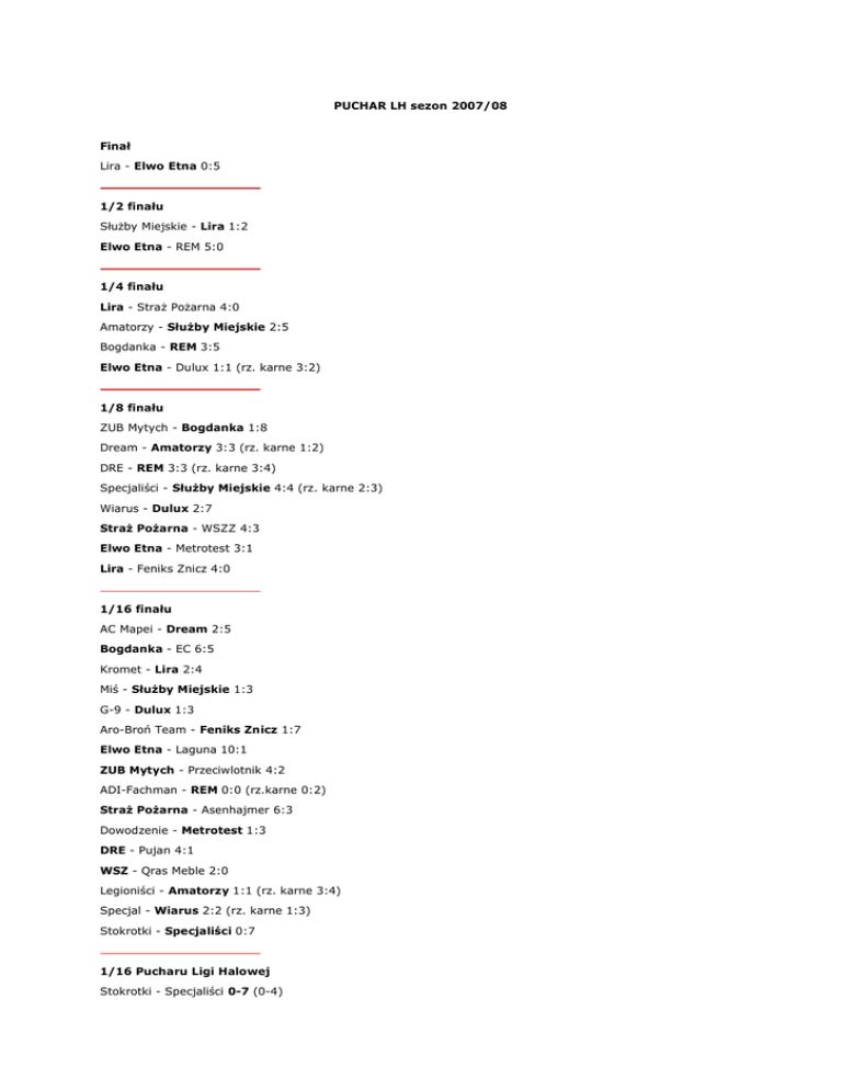 PUCHAR LH sezon 2007/08 Finał Lira - Elwo Etna 0:5 1/2 finału Służby Miejskie - Lira 1:2 Elwo Etna - REM 5:0 1/4 finału Lira - Straż Pożarna 4:0 Amatorzy - Służby Miejskie 2:5 Bogdanka - REM 3:5 Elwo Etna - Dulux 1:1 (rz. karne 3:2) 1/8 finału ZUB Mytych - Bogdanka 1:8 Dream - Amatorzy 3:3 (rz. karne 1:2) DRE - REM 3:3 (rz. karne 3:4) Specjaliści - Służby Miejskie 4:4 (rz. karne 2:3) Wiarus - Dulux 2:7 Straż Pożarna - WSZZ 4:3 Elwo Etna - Metrotest 3:1 Lira - Feniks Znicz 4:0 1/16 finału AC Mapei - Dream 2:5 Bogdanka - EC 6:5 Kromet - Lira 2:4 Miś - Służby Miejskie 1:3 G-9 - Dulux 1:3 Aro-Broń Team - Feniks Znicz 1:7 Elwo Etna - Laguna 10:1 ZUB Mytych - Przeciwlotnik 4:2 ADI-Fachman - REM 0:0 (rz.karne 0:2) Straż Pożarna - Asenhajmer 6:3 Dowodzenie - Metrotest 1:3 DRE - Pujan 4:1 WSZ - Qras Meble 2:0 Legioniści - Amatorzy 1:1 (rz. karne 3:4) Specjal - Wiarus 2:2 (rz. karne 1:3) Stokrotki - Specjaliści 0:7 1/16 Pucharu Ligi Halowej Stokrotki - Specjaliści 0-7 (0-4) Skład: Sebastian Piasecki (Piasek, bramkarz - debiut), Zenek, Kuba, Maciek, Zdzichu, Łysy, Martin, Włodek, Zdzichu, Leon, Bartek Nie zagrał: Bodzio II runda wstępna Bogdanka - Paters 11:4 Robto - Dowodzenie 2:6 Pomowiec - AC Mapei 3:4 Wolny los: Legioniści (32) Runda wstępna Hydralex - Dowodzenie 2:15 Bogdanka - BIG 3:2 Paters - ZUO 6:1 WOPAL - Pomowiec Gr. Elb. 1:6 Legioniści - Renault/PC Koni 3:1 AC Mapei - Fiat Auto-El 5:1 Wolny los: Robto