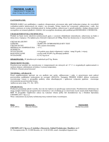 PRIMER SABLE CHROPOWATY PODKŁAD POD TYNKI PLASTYCZNE ZASTOSOWANIE: PRIMER-SABLE jest podkładem o aspekcie chropowatym używanym jako spód izolacyjno-wiążący do wszystkich wykładzin-tynków plastycznych do wnętrz i na zewnątrz. Ściany muszą być wysuszone, odtłuszczone i stałe. Jest bardzo cenionym za swoją wielofunkcyjność tj. Izoluje podłoże, zabarwia go w sposób jednolity i dodaje chropowatość szczególnie na ścianach gładkich i śliskich. Jest szczególnie doradzany jako podkład pod RESIMARM i CHEMICEM. CHARAKTERYSTYKA TECHNICZNA: Produkt na bazie żywic akrylowo-syntetycznych gęsty z czystymi składnikami mineralnymi, zabarwiony na biało o dużej mocy wiążącej. ( Na żądanie przy ilościach większych od 100kg. Może być dostarczony w innych kolorach). CIĘŻAR WŁAŚCIWY LEPKOŚĆ CIĘŻAR SUCHY MINIMALNA TEMPERATURA SCHNIĘCIA WYSYCHANIE ROZCIEŃCZANIE WYDAJNOŚĆ : 1,70 kg/dm3 : 30,000 CPS+20°BROOKFIELD RTV TEST : 70% ciężaru mieszaniny : +5° C. : 4-6 godzin; przy dużej wilgotności i niskiej temp.24 godz. i więcej. : czystą wodą 20-40% wg absorpcji podłoża : 0,1-0,3 kg na m2 OPAKOWANIE : W plastikowych wiaderkach po25 kg. Brutto. PRZECHOWYWANIE: Przechowywać produkt nie rozcieńczony w temperaturach nie niższych od +5° C w oryginalnych opakowaniach w suchym miejscu, odsłoniętym od słońca i wyższej temperatury. UWAGA :Chronić przed mrozem! TECHNIKA APLIKACJI : Przed zaaplikowaniem upewnić się czy podłoże jest suche, odtłuszczone i stałe, w przeciwnym razie pokryć powierzchnię podkładem izolacyjnym na zewnątrz (ISOLEX). Następnie PRIMER SABLE dobrze wymieszać, rozcieńczając więcej w przypadku podłoży silnie absorbujących i aplikować wyłącznie pędzlem rozcierając równomiernie po powierzchni ściany. Aplikować przy temp. 5°C. Do +40°C. GWARANCJA: Producent gwarantuje jakość wyrobu, lecz nie ma wpływu na sposób jego zastosowania. Przedstawione informacje nie mogą zastąpić fachowego przygotowania wykonawcy i nie zwalniają go ze stosowania się do zasad sztuki budowlanej i BHP. W przypadku wątpliwości zaleca się wykonać własne próby lub skontaktować się z Działem Sprzedaży CHEMIPLAST 1 Sp.z.o.o Wraz z ukazaniem się tej karty technicznej tracą ważność karty wcześniejsze. Data: 25.01.2011r. Opracował: Mleczko Renata Zatwierdził: Michał Zaczyński CHEMIPLAST 1 Sp.z.o.o Z siedzibą w Rzeszowie, Zakład Produkcyjno- Handlowy nr 2 Ul. Szczepanowska 39, 32-800 Brzesko, tel. 14 68 68 688, email: [email protected]