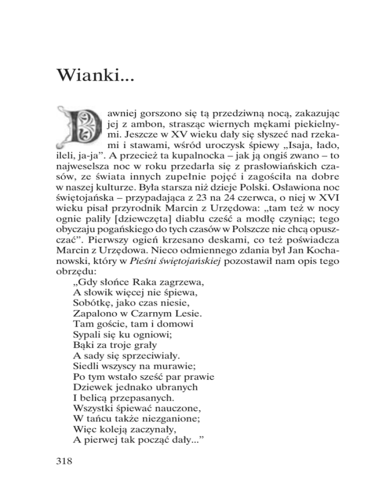 Wianki... awniej gorszono się tą przedziwną nocą, zakazując jej z ambon, strasząc wiernych mękami piekielnymi. Jeszcze w XV wieku dały się słyszeć nad rzekami i stawami, wśród uroczysk śpiewy „Isaja, łado, ileli, ja-ja”. A przecież ta kupalnocka – jak ją ongiś zwano – to najweselsza noc w roku przedarła się z prasłowiańskich czasów, ze świata innych zupełnie pojęć i zagościła na dobre w naszej kulturze. Była starsza niż dzieje Polski. Osławiona noc świętojańska – przypadająca z 23 na 24 czerwca, o niej w XVI wieku pisał przyrodnik Marcin z Urzędowa: „tam też w nocy ognie paliły [dziewczęta] diabłu cześć a modłę czyniąc; tego obyczaju pogańskiego do tych czasów w Polszcze nie chcą opuszczać”. Pierwszy ogień krzesano deskami, co też poświadcza Marcin z Urzędowa. Nieco odmiennego zdania był Jan Kochanowski, który w Pieśni świętojańskiej pozostawił nam opis tego obrzędu: „Gdy słońce Raka zagrzewa, A słowik więcej nie śpiewa, Sobótkę, jako czas niesie, Zapalono w Czarnym Lesie. Tam goście, tam i domowi Sypali się ku ogniowi; Bąki za troje grały A sady się sprzeciwiały. Siedli wszyscy na murawie; Po tym wstało sześć par prawie Dziewek jednako ubranych I belicą przepasanych. Wszystki śpiewać nauczone, W tańcu także niezganione; Więc koleją zaczynały, A pierwej tak począć dały...” 318 Obrzędy sobótkowe udało się Kościołowi schrystianizować, czego najlepszym dowodem związanie ich z kultem św. Jana Chrzciciela, który przecież ochrzcił Chrystusa w Jordanie. On to najlepiej nadawał się na patrona zwyczajów związanych z wodą. W sobótkowych bowiem obrzędach zespoliły się dwa kulty: wody i ognia. Pierwszy z nich dotrwał jako obrzęd wianków puszczanych na wodę. Kult zaś ognia to nic innego tylko zapalenie stosu sobótkowego. Jak przed laty – jeszcze w XIX wieku – pisał Władysław Ludwik Anczyc: „Rzecz szczególna, gdy w innych stronach Polski obrzęd ten odbywa się w wilię św. Jana, w krakowskiem palą sobótki w dniach Zielonych Świątek. Wieczorem od Ojcowa do Lanckorony, od wzgórz Chełmskich (nad Przemszą) aż poza mogiłę Wandy, cały widnokrąg goreje tysiącem ognisk po wzgórkach, jak nieprzejrzane obozowisko wśród nocy”. Na dobrą sprawę nazwa sobótka czy ogień sobótkowy wiąże się z zapalaniem ognisk w następujące po sobie soboty poczynając od Wielkanocy aż do Zielonych Świątek, czyli przez siedem sobót. Ognie palone w wigilię św. Jana Chrzciciela nazywano świętojańskimi, którym towarzyszy sobótka. A ogień świętojański rozpalano w rytualny sposób. Mianowicie z czterech stron – co symbolizowało cztery strony świata i ruch słońca. Ogień krzesano drewnem, co ongiś lud nazywał żywym rozpaleniem. Nieraz wrzucano doń zioła, takie jak bylica, ruta czy dziurawiec, mające znaczenie lecznicze, wspomagające siły magiczne. Ogień świętojański żegnano znakiem krzyża świętego, aby czart nie miał do niego żadnego przystępu. Wierzono, że przeskoczenie przez ten święty ogień oczyszcza z grzechów oraz, iż w tym dniu św. Jan chrzci wodę, przepędzając z niej złe moce, czyniąc ją tym samym nader bezpieczną dla ludzi. To kąpiel w świętojańskiej wodzie stała się rytuałem oczyszczenia, jak również magią płodności, wierzono, iż to właśnie w wodzie drzemią moce życia. Nad wodą też podejmowano zawsze próby poznania własnej przyszłości. Najbardziej popularne stało się puszczanie na wodę wianków, z których zachowań na wodzie wróżono przyszłość. Wedle wierzeń wianek, który pierwszy zatonął wieścił śmierć tego, kto go puścił. Właścicielka wianka, który nie utonął, rychło wychodziła za mąż. A gdy wianek długo się kręcił w jed319 nym miejscu, wróżyło to staropanieństwo. Wianek pleciono z ruty, rozmarynu albo mirtu i był najpopularniejszym symbolem dziewictwa. Oznaczał nienaruszalność cnoty dziewczyny, która korzystała w noc świętojańską z magii płodności. Koło wieńca symbolicznie zakreślało magiczną granicę wymagającą zabezpieczenia. Wianki, tak popularne wśród ludu wiejskiego, obchodzono i w miastach. Kiedy więc pojawiły się one w Krakowie i jak obchodzone były w naszym mieście? Znany dziewiętnastowieczny pamiętnikarz Józef WawelLouis wspomina, że już za czasów Wolnego Miasta Krakowa dziewczęta puszczały cichaczem wianki, ale nie Wisłą, lecz na Rudawie i Wildze. Z upływem lat, ta niemal prywatna uroczystość zaczęła się przekształcać w wielki nadwiślański festyn. Ambroży Grabowski pisał o tym z pewnym przekąsem: „Od lat może trzech (1850 r.) przeniknął do nas zwyczaj przybyły z Warszawy, gdzie od lat dawniejszych istniał, że dziewczęta z klasy służących, pragnące pójścia za mąż, celem dowiedzenia się, która prędzej do ołtarza ślubnego poprowadzoną będzie, puszczały na płynącą przy górnych młynach Rudawę deszczułki, na których wianek i niekiedy zapalona tkwiła świeczka łojówka. (...) Za lat kilka lub kilkanaście mniemać będą, że ten obyczaj puszczania wianków na Rudawę pochodzi z dawnych starożytnych czasów, kiedy tymczasem jest on tylko naśladowaniem i powtórzeniem zwyczaju, jaki panuje w Warszawie i jest tylko świeżo wprowadzoną nowością. Nic pewniejszego, że wiele później przypisałoby temu pochodzenie starożytne, jak to się stało już za mojej pamięci z obrzędem, zwanym Konik Zwierzyniecki”. Zatem w tych najstarszych wiankach – rodem z Warszawy – brały głównie udział służące i odbywały się one pierwotnie na Rudawie (właściwie Młynówce), która kiedyś płynęła ulicą Łobzowską zasilając wodą Górne Młyny, znajdujące się ongiś mniej więcej w okolicy obecnej ulicy Asnyka. Bardzo szybko wianki stały się –– i to jeszcze przed samą połową XIX stulecia – rodzajem patriotycznej manifestacji krakowskiej młod