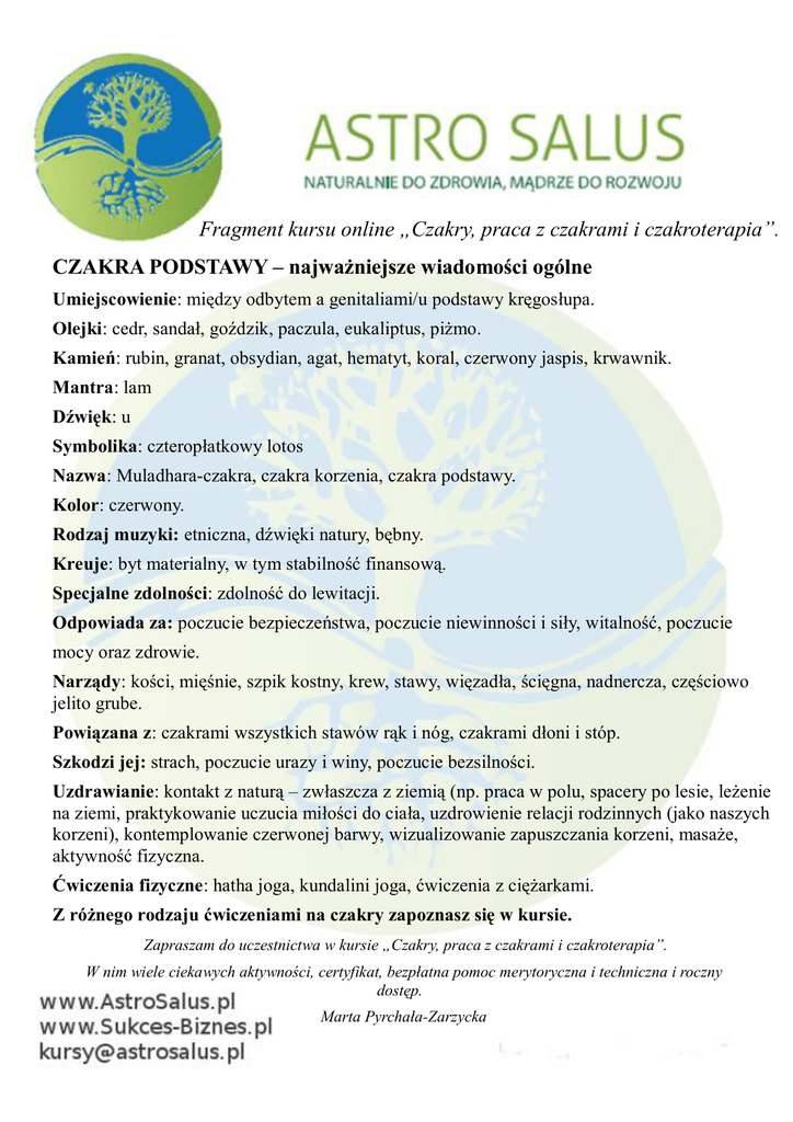 Fragment kursu online „Czakry, praca z czakrami i czakroterapia”. CZAKRA PODSTAWY – najważniejsze wiadomości ogólne Umiejscowienie: między odbytem a genitaliami/u podstawy kręgosłupa. Olejki: cedr, sandał, goździk, paczula, eukaliptus, piżmo. Kamień: rubin, granat, obsydian, agat, hematyt, koral, czerwony jaspis, krwawnik. Mantra: lam Dźwięk: u Symbolika: czteropłatkowy lotos Nazwa: Muladhara-czakra, czakra korzenia, czakra podstawy. Kolor: czerwony. Rodzaj muzyki: etniczna, dźwięki natury, bębny. Kreuje: byt materialny, w tym stabilność finansową. Specjalne zdolności: zdolność do lewitacji. Odpowiada za: poczucie bezpieczeństwa, poczucie niewinności i siły, witalność, poczucie mocy oraz zdrowie. Narządy: kości, mięśnie, szpik kostny, krew, stawy, więzadła, ścięgna, nadnercza, częściowo jelito grube. Powiązana z: czakrami wszystkich stawów rąk i nóg, czakrami dłoni i stóp. Szkodzi jej: strach, poczucie urazy i winy, poczucie bezsilności. Uzdrawianie: kontakt z naturą – zwłaszcza z ziemią (np. praca w polu, spacery po lesie, leżenie na ziemi, praktykowanie uczucia miłości do ciała, uzdrowienie relacji rodzinnych (jako naszych korzeni), kontemplowanie czerwonej barwy, wizualizowanie zapuszczania korzeni, masaże, aktywność fizyczna. Ćwiczenia fizyczne: hatha joga, kundalini joga, ćwiczenia z ciężarkami. Z różnego rodzaju ćwiczeniami na czakry zapoznasz się w kursie. Zapraszam do uczestnictwa w kursie „Czakry, praca z czakrami i czakroterapia”. W nim wiele ciekawych aktywności, certyfikat, bezpłatna pomoc merytoryczna i techniczna i roczny dostęp. Marta Pyrchała-Zarzycka
