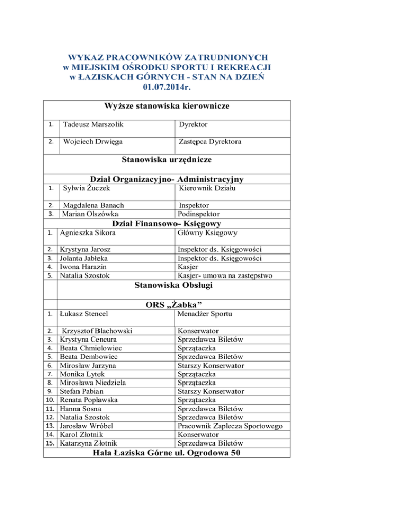WYKAZ PRACOWNIKÓW ZATRUDNIONYCH w MIEJSKIM OŚRODKU SPORTU I REKREACJI w ŁAZISKACH GÓRNYCH - STAN NA DZIEŃ 01.07.2014r. Wyższe stanowiska kierownicze 1. Tadeusz Marszolik Dyrektor 2. Wojciech Drwięga Zastępca Dyrektora Stanowiska urzędnicze Dział Organizacyjno- Administracyjny 1. Sylwia Żuczek Kierownik Działu 2. 3. Magdalena Banach Marian Olszówka Inspektor Podinspektor Dział Finansowo- Księgowy 1. Agnieszka Sikora Główny Księgowy 2. 3. 4. 5. Inspektor ds. Księgowości Inspektor ds. Księgowości Kasjer Kasjer- umowa na zastępstwo Krystyna Jarosz Jolanta Jabłeka Iwona Harazin Natalia Szostok Stanowiska Obsługi ORS „Żabka” 1. Łukasz Stencel Menadżer Sportu 2. 3. 4. 5. 6. 7. 8. 9. 10. 11. 12. 13. 14. 15. Konserwator Sprzedawca Biletów Sprzątaczka Sprzedawca Biletów Starszy Konserwator Sprzątaczka Sprzątaczka Starszy Konserwator Sprzątaczka Sprzedawca Biletów Sprzedawca Biletów Pracownik Zaplecza Sportowego Konserwator Sprzedawca Biletów Krzysztof Blachowski Krystyna Cencura Beata Chmielowiec Beata Dembowiec Mirosław Jarzyna Monika Lytek Mirosława Niedziela Stefan Pabian Renata Popławska Hanna Sosna Natalia Szostok Jarosław Wróbel Karol Złotnik Katarzyna Złotnik Hala Łaziska Górne ul. Ogrodowa 50 1. 2. 3. 4. 5. 6. 7. 8. 9. 10. 11. 12. 13. 14. 15. 16. 17. 18. 19. Marcin Chronowski Ewa Czardybon Daniel Czechelius Dorota Drwal Ryszard Jędrowski Krystyna Kosicka Zbigniew Kosicki Małgorzata Krasucka Błażej Lasia Dorota Loskot Małgorzata Masarczyk Damian Nowak Marek Piecha Izabela Porwolik Marieta Rybok Karolina Wiśniewska Jerzy Włoch Zbigniew Zalewski Tomasz Ziemian 1. Robert Janecki Menadżer Sportu 2. 3. 4. 5. 6. 7. 8. Horst Chierawalle Teresa Chierawalle Teresa Gersok Marian Markiewicz Danuta Odrovits Dawid Olszówka Jacek Rączka Starszy Konserwator Sprzątaczka Sprzątaczka Konserwator Sprzątaczka Konserwator Konserwator Konserwator Maszyn i Urządzeń Sprzątaczka Konserwator Maszyn i Urządzeń Pracownik Zaplecza Sportowego Konserwator Sprzątaczka Konserwator Sprzątaczka Konserwator Sprzątaczka Sprzątaczka Konserwator - Elektryk Konserwator Maszyn i Urządzeń Sprzątaczka Sprzątaczka Pracownik Zaplecza Sportowego Konserwator Pracownik Zaplecza Sportowego Konserwator Maszyn i Urządzeń Hala Łaziska Średnie ul. Staszica 31b + Domek WYKAZ PRACOWNIKÓW ZATRUDNIONYCH w MIEJSKIM OŚRODKU SPORTU I REKREACJI w ŁAZISKACH GÓRNYCH - STAN NA DZIEŃ 01.07.2014r. Wyższe stanowiska kierownicze 1. Tadeusz Marszolik Dyrektor 2. Wojciech Drwięga Zastępca Dyrektora Stanowiska urzędnicze Dział Organizacyjno- Administracyjny 1. Sylwia Żuczek Kierownik Działu 2. 3. Magdalena Banach Marian Olszówka Inspektor Podinspektor Dział Finansowo- Księgowy 1. Agnieszka Sikora Główny Księgowy 2. 3. 4. 5. Inspektor ds. Księgowości Inspektor ds. Księgowości Kasjer Kasjer- umowa na zastępstwo Krystyna Jarosz Jolanta Jabłeka Iwona Harazin Natalia Szostok Stanowiska Obsługi ORS „Żabka” 1. Łukasz Stencel Menadżer Sportu 2. 3. 4. 5. 6. 7. 8. 9. 10. 11. 12. 13. 14. 15. Konserwator Sprzedawca Biletów Sprzątaczka Sprzedawca Biletów Starszy Konserwator Sprzątaczka Sprzątaczka Starszy Konserwator Sprzątaczka Sprzedawca Biletów Sprzedawca Biletów Pracownik Zaplecza Sportowego Konserwator Sprzedawca Biletów Krzysztof Blachowski Krystyna Cencura Beata Chmielowiec Beata Dembowiec Mirosław Jarzyna Monika Lytek Mirosława Niedziela Stefan Pabian Renata Popławska Hanna Sosna Natalia Szostok Jarosław Wróbel Karol Złotnik Katarzyna Złotnik Hala Łaziska Górne ul. Ogrodowa 50 1. 2. 3. 4. 5. 6. 7. 8. 9. 10. 11. 12. 13. 14. 15. 16. 17. 18. 19. Marcin Chronowski Ewa Czardybon Daniel Czechelius Dorota Drwal Ryszard Jędrowski Krystyna Kosicka Zbigniew Kosicki Małgorzata Krasucka Błażej Lasia Dorota Loskot Małgorzata Masarczyk Damian Nowak Marek Piecha Izabela Porwolik Marieta Rybok Karolina Wiśniewska Jerzy Włoch Zbigniew Zalewski Tomasz Ziemian 1. Robert Janecki Menadżer Sportu 2. 3. 4. 5. 6. 7. 8. Horst Chierawalle Teresa Chierawalle Teresa Gersok Marian Markiewicz Danuta Odrovits Dawid Olszówka Jacek Rączka Starszy Konserwator Sprzątaczka Sprzątaczka Konserwator Sprzątaczka Konserwator Konserwator Konserwator Maszyn i Urządzeń Sprzątaczka Konserwator Maszyn i Urządzeń Pracownik Zaplecza Sportowego Konserwator Sprzątaczka Konserwator Sprzątaczka Konserwator Sprzątaczka Sprzątaczka Konserwator - Elektryk Konserwator Maszyn i Urządzeń Sprzątaczka Sprzątaczka Pracownik Zaplecza Sportowego Konserwator Pracownik Zaplecza Sportowego Konserwator Maszyn i Urządzeń Hala Łaziska Średnie ul. Staszica 31b + Domek WYKAZ PRACOWNIKÓW ZATRUDNIONYCH w MIEJSKIM OŚRODKU SPORTU I REKREACJI w ŁAZISKACH GÓRNYCH - STAN NA DZIEŃ 01.07.2014r. Wyższe stanowiska kierownicze 1. Tadeusz Marszolik Dyrektor 2. Wojciech Drwięga Zastępca Dyrektora Stanowiska urzędnicze Dział Organizacyjno- Administracyjny 1. Sylwia Żuczek Kierownik Działu 2. 3. Magdalena Banach Marian Olszówka Inspektor Podinspektor Dział Finansowo- Księgowy 1. Agnieszka Sikora Główny Księgowy 2. 3. 4. 5. Inspektor ds. Księgowości Inspektor ds. Księgowości Kasjer Kasjer- umowa na zastępstwo Krystyna Jarosz Jolanta Jabłeka Iwona Harazin Natalia Szostok Stanowiska Obsługi ORS „Żabka” 1. Łukasz Stencel Menadżer Sportu 2. 3. 4. 5. 6. 7. 8. 9. 10. 11. 12. 13. 14. 15. Konserwator Sprzedawca Biletów Sprzątaczka Sprzedawca Biletów Starszy Konserwator Sprzątaczka Sprzątaczka Starszy Konserwator Sprzątaczka Sprzedawca Biletów Sprzedawca Biletów Pracownik Zaplecza Sportowego Konserwator Sprzedawca Biletów Krzysztof Blachowski Krystyna Cencura Beata Chmielowiec Beata Dembowiec Mirosław Jarzyna Monika Lytek Mirosława Niedziela Stefan Pabian Renata Popławska Hanna Sosna Natalia Szostok Jarosław Wróbel Karol Złotnik Katarzyna Złotnik Hala Łaziska Górne ul. Ogrodowa 50 1. 2. 3. 4. 5. 6. 7. 8. 9. 10. 11. 12. 13. 14. 15. 16. 17. 18. 19. Marcin 