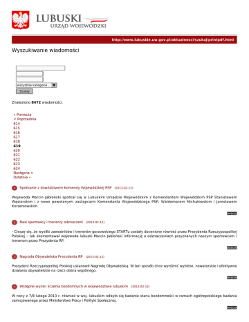 http://www.lubuskie.uw.gov.pl/aktualnosci/szukaj/printpdf.html Wyszukiwanie wiadomości wszystkie kategorie ... ▼ Szukaj Znaleziono 8472 wiadomości. « Pierwsza < Poprzednia 614 615 616 617 618 619 620 621 622 623 624 Następna > Ostatnia » Spotkanie z dowództwem Komendy Wojewódzkiej PSP (2013-02-12) Wojewoda Marcin Jabłoński spotkał się w Lubuskim Urzędzie Wojewódzkim z Komendantem Wojewódzkim PSP Stanisławem Węsierskim i z nowo powołanymi zastępcami Komendanta Wojewódzkiego PSP, Waldemarem Michałowskim i Jarosławem Korzeniowskim. więcej Nasi sportowcy i trenerzy odznaczeni (2013-02-12) - Cieszę się, że wysiłki zawodników i trenerów gorzowskiego STARTu zostały docenione również przez Prezydenta Rzeczypospolitej Polskiej – tak skomentował wojewoda lubuski Marcin Jabłoński informację o odznaczeniach przyznanych naszym sportowcom i trenerom przez Prezydenta RP. więcej Nagroda Obywatelska Prezydenta RP (2013-02-12) Prezydent Rzeczypospolitej Polskiej ustanowił Nagrodę Obywatelską. W ten sposób chce wyróżnić wybitne, nowatorskie i efektywne działania obywatelskie na rzecz dobra wspólnego. więcej Wstępne wyniki liczenia bezdomnych w województwie lubuskim (2013-02-12) W nocy z 7/8 lutego 2013 r. również w woj. lubuskim odbyło się badanie stanu bezdomności w ramach ogólnopolskiego badania zainicjowanego przez Ministerstwo Pracy i Polityki Społecznej. więcej Porozumienie z Radiem Zachód [wideo] (2013-02-11) Lubuski Urząd Wojewódzki nawiązuje współpracę z Radiem Zachód. Cel to poprawa bezpieczeństwa mieszkańców regionu. Radio wyprodukuje cykl audycji, których tematem będzie popularyzacja tematyki bezpieczeństwa i zarządzania kryzysowego. W poniedziałek 11.02 br. wojewoda lubuski Marcin Jabłoński podpisze porozumienie w tej sprawie z prezesem Radia Zachód Dariuszem Frejmanem. więcej Odwołany alarm i stan pogotowia przeciwpowodziowego dla mieszkańców Żagania (2013-02-11) Odwołanie alarmu i stanu pogotowia przeciwpowodziowego. więcej Program „Poprawa i lepsze dostosowanie ochrony zdrowia do trendów demograficzno - epidemiologicznych” (2013-02-11) Wojewoda Lubuski zachęca do wzięcia udziału we wdrażanym przez Ministerstwo Zdrowia w I kwartale 2013 r. programie PL 07 „Poprawa i lepsze dostosowanie ochrony zdrowia do trendów demograficzno - epidemiologicznych”. więcej Wnioskowanie o środki z rezerwy celowej budżetu państwa i budżetu środków europejskich dla programów na 2013 r. (2013-02-11) 29 stycznia 2013 r. Minister Rozwoju Regionalnego zaakceptował "Procedurę uruchamiania oraz przyznawania zapewnienia finansowania lub dofinansowania przedsięwzięcia ze środków rezerwy celowej budżetu państwa i budżetu środków europejskich więcej Przypadki cholery na Kubie (2013-02-11) Prof. Jerzy Marcinkowski Konsultant Wojewódzki w dziedzinie epidemiologii zwrócił uwagę na wystąpienie na Kubie przypadków zachorowania na cholerę. więcej Światowy Dzień Chorego (2013-02-11) 11 lutego obchodzony jest Światowy Dzień Chorego. Z tej okazji wicewojewody Jan Świrepo i doradca wojewody Halina Kunicka odwiedzili podopiecznych gorzowskiego hospicjum Św. Kamila. więcej « Pierwsza < Poprzednia 614 615 616 617 618 619 620 621 622 623 624 Następna > Ostatnia »