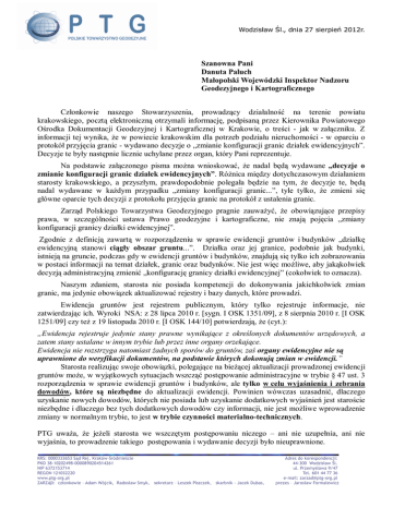 Wodzisław Śl., dnia 27 sierpień 2012r. Szanowna Pani Danuta Paluch Małopolski Wojewódzki Inspektor Nadzoru Geodezyjnego i Kartograficznego Członkowie naszego Stowarzyszenia, prowadzący działalność na terenie powiatu krakowskiego, pocztą elektroniczną otrzymali informację, podpisaną przez Kierownika Powiatowego Ośrodka Dokumentacji Geodezyjnej i Kartograficznej w Krakowie, o treści - jak w załączniku. Z informacji tej wynika, że w powiecie krakowskim dla potrzeb podziału nieruchomości - w oparciu o protokół przyjęcia granic - wydawano decyzje o „zmianie konfiguracji granic działek ewidencyjnych”. Decyzje te były następnie licznie uchylane przez organ, który Pani reprezentuje. Na podstawie załączonego pisma można wnioskować, że nadal będą wydawane „decyzje o zmianie konfiguracji granic działek ewidencyjnych”. Różnica między dotychczasowym działaniem starosty krakowskiego, a przyszłym, prawdopodobnie polegała będzie na tym, że decyzje te, będą nadal wydawane w każdym przypadku „zmiany konfiguracji granic...”, tyle tylko, że zmieni się główne oparcie tych decyzji z protokołu przyjęcia granic na protokół z ustalenia granic. Zarząd Polskiego Towarzystwa Geodezyjnego pragnie zauważyć, że obowiązujące przepisy prawa, w szczególności ustawa Prawo geodezyjne i kartograficzne, nie znają pojęcia „zmiany konfiguracji granicy działki ewidencyjnej”. Zgodnie z definicją zawartą w rozporządzeniu w sprawie ewidencji gruntów i budynków „działkę ewidencyjną stanowi ciągły obszar gruntu...”. Działka oraz jej granice, podobnie jak budynki, istnieją na gruncie, podczas gdy w ewidencji gruntów i budynków, znajdują się tylko ich zobrazowania w postaci informacji na temat działek, granic oraz budynków. Nie jest więc możliwe, aby jakąkolwiek decyzją administracyjną zmienić „konfigurację granicy działki ewidencyjnej” (cokolwiek to oznacza). Naszym zdaniem, starosta nie posiada kompetencji do dokonywania jakichkolwiek zmian granic, ma jedynie obowiązek aktualizować rejestry i bazy danych, które prowadzi. Ewidencja gruntów jest rejestrem publicznym, który tylko rejestruje informacje, nie zatwierdzając ich. Wyroki NSA: z 28 lipca 2010 r. [sygn. I OSK 1351/09], z 8 sierpnia 2010 r. [I OSK 1251/09] czy też z 19 listopada 2010 r. [I OSK 144/10] potwierdzają, że (cyt.): „Ewidencja rejestruje jedynie stany prawne wynikające z określonych dokumentów urzędowych, a zatem stany ustalane w innym trybie lub przez inne organy orzekające. Ewidencja nie rozstrzyga natomiast żadnych sporów do gruntów, zaś organy ewidencyjne nie są uprawnione do weryfikacji dokumentów, na podstawie których dokonują zmian w ewidencji.” Starosta realizując swoje obowiązki, polegające na bieżącej aktualizacji prowadzonej ewidencji gruntów może, w wyjątkowych sytuacjach wszcząć postępowanie administracyjne w trybie § 47 ust. 3 rozporządzenia w sprawie ewidencji gruntów i budynków, ale tylko w celu wyjaśnienia i zebrania dowodów, które są niezbędne do aktualizacji ewidencji. Powinien wówczas uzasadnić, dlaczego uzyskanie nowych dowodów, których nie posiada lub uzyskanie dodatkowych wyjaśnień jest staroście niezbędne i dlaczego bez tych dodatkowych dowodów czy informacji, nie jest możliwe wprowadzenie zmiany w normalnym trybie, to jest w trybie czynności materialno-technicznych. PTG uważa, że jeżeli starosta we wszczętym postępowaniu niczego – ani nie uzupełnia, ani nie wyjaśnia, to prowadzenie takiego postępowania i wydawanie decyzji było nieuprawnione. KRS: 0000333653 Sąd Rej. Kraków-Śródmieście PKO 38-10202498-0000890204514261 NIP 6372153714 REGON 121032220 www.ptg-org.pl ZARZĄD: członkowie – Adam Wójcik, Radosław Smyk, sekretarz – Leszek Piszczek, skarbnik - Jacek Dubas, Adres do korespondencji: 44-300 Wodzisław Śl. ul. Przemysława 9/47 Tel. 601 44 77 36 e-mail: [email protected] prezes – Jarosław Formalewicz Zdaniem PTG nie jest dopuszczalne prowadzenie postępowań administracyjnych w sprawie aktualizacji ewidencji gruntów bez uzasadnionego powodu, a jak wynika z informacji starosty krakowskiego, w powiecie krakowskim takie postępowania tj. w sprawie „zmiany konfiguracji granic działek ewidencyjnych” były i nadal będą prowadzone. Starosta krakowski - prawdopodobnie - przez „zmianę konfiguracji granicy działki ewidencyjnej” rozumie aktualizację baz danych, konieczną z powodu obliczenia współrzędnych punktów granicznych po ich uprzednim pomiarze, poprzedzonym ustaleniem przebiegu granic na podstawie § 37-39 rozporządzenia w sprawie ewidencji gruntów i budynków. W związku z tym, zapowiada każdorazowe (obligatoryjne) prowadzenie postępowania administracyjnego, i to w dodatku na wymuszony wniosek strony. Zdaniem naszego Stowarzyszenia praktyka ta, jest działaniem bardzo szkodliwym a co za tym idzie przez stworzenie praktyki obligatoryjności, niezgodnym z obowiązującym prawem. Szczegółowe stanowisko PTG w sprawie trybu wprowadzania zmian do ewidencji gruntów zostało zawarte w opinii, która została opublikowana na początku br. na łamach miesięcznika „Geodeta”. Analiza wniesionych odwołań od podobnych decyzji wykazuje, że są one inicjowane często niejasnymi i niejednoznacznymi sformułowaniami, powodującymi nieufność i przeróżne podejrzenia stron co do zamiarów starosty, który decyzją administracyjną „zmienia konfigurację granic”. Odwołania te, w szczególności wnoszone przez sąsiadów, na długi okres czasu blokują lub wręcz uniemożliwiają proces inwestycyjny. Należy również nadmienić, że zdaniem PTG, w nieuprawniony sposób bardzo często jest podważany autorytet uprawnionego geodety, który w wielu przypadkach ustalił w bezsporny sposób granice na gruncie co potwierdziły w protokole zainteresowane strony, a wydawana przez starostę decyzja „o zmianie konfiguracji działek”