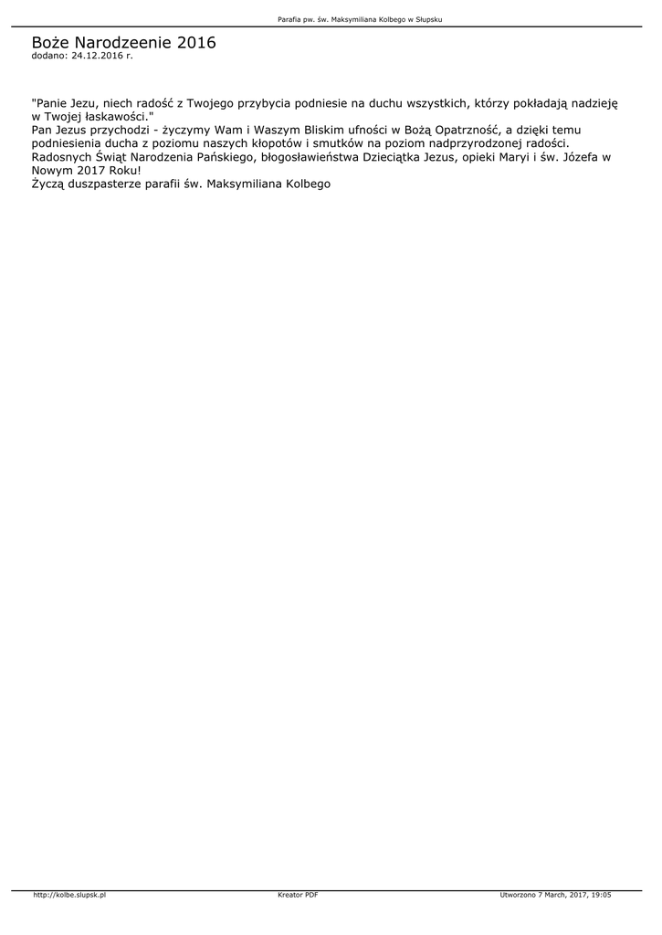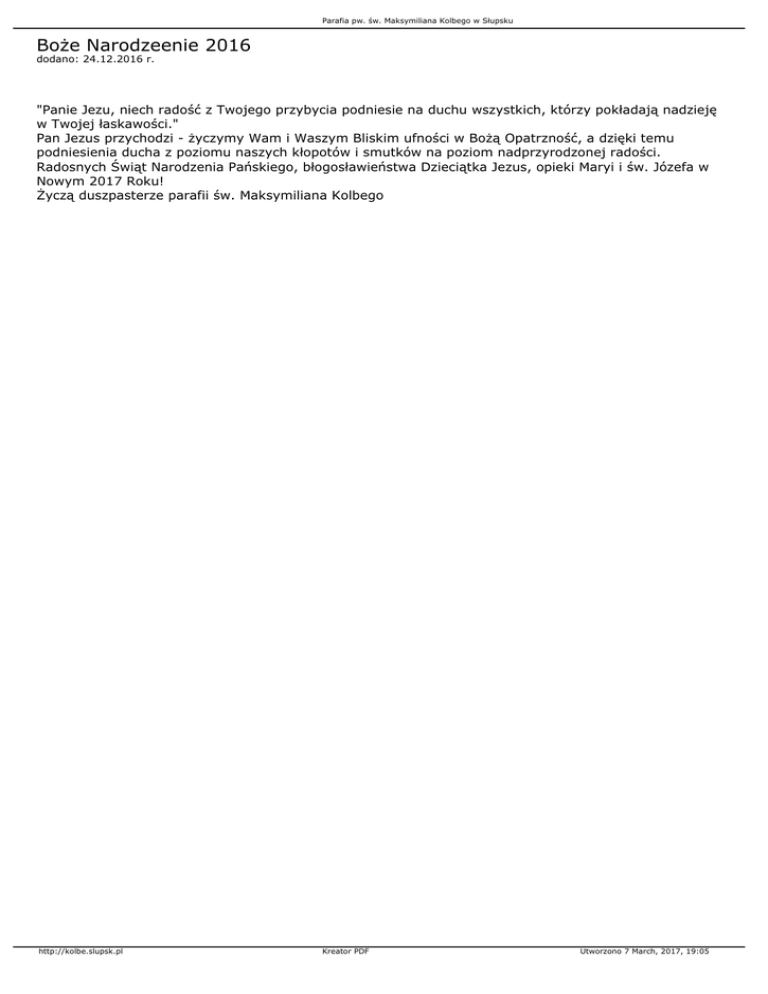 Parafia pw. św. Maksymiliana Kolbego w Słupsku Boże Narodzeenie 2016 dodano: 24.12.2016 r. "Panie Jezu, niech radość z Twojego przybycia podniesie na duchu wszystkich, którzy pokładają nadzieję w Twojej łaskawości." Pan Jezus przychodzi - życzymy Wam i Waszym Bliskim ufności w Bożą Opatrzność, a dzięki temu podniesienia ducha z poziomu naszych kłopotów i smutków na poziom nadprzyrodzonej radości. Radosnych Świąt Narodzenia Pańskiego, błogosławieństwa Dzieciątka Jezus, opieki Maryi i św. Józefa w Nowym 2017 Roku! Życzą duszpasterze parafii św. Maksymiliana Kolbego http://kolbe.slupsk.pl Kreator PDF Utworzono 7 March, 2017, 19:05