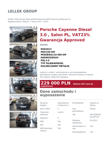 LELLEK GROUP Źródło: http://portal.lellek.pl/lel/komis/auto14437,Porsche.pdf?grupa=9 Wygenerowano: Wtorek, 7 marca 2017, 19:05 Porsche Cayenne Diesel 3.0 , Salon PL, VAT23% Gwarancja Approved Używany ROK2013 MOC258 KM PRZEBIEG110 000 KM NADWOZIESUV POJ.3.0 TYP SILNIKADIESEL KOLORCZARNY METALIK kupiony w polsce serwisowany w aso bezwypadkowy garażowany książka serwisowa I właściciel kupiony w salonie stan idealny właściciel niepalący 229 000 PLN faktura VAT cena do uzgodnienia Dane samochodu i wyposażenie Skrzynia biegów automatyczn a Tiptronic S Pochodzenie kupiony w Polsce Ilość miejsc 5 Polska Tapicerka skórzana czarna Kraj pochodzenia VIN Poduszki 6 WP1ZZZ92Z DLA35116 ABS Tak Pierwsza rejestracja 01-2013 ESP Tak Tak serwisowany w aso Tak ASR (kontrola trakcji) bezwypadkowy Tak Klimatyzacja automatyczna garażowany Tak książka serwisowa Tak I właściciel Tak kupiony w salonie Tak tunning homologacja stan idealny Tak właściciel niepalący Tak dwustrefowa Handlowiec Marcin Teske, Maciej Słobodowski +48 661 911 912 zapytaj mobile +48 515 000 911 Gwarancja Gwarancja dostępna Ubezpieczenie Ubezpieczenie dostępne Kredyt Kredyt dostępny Zeskanuj kod, aby zobaczyć ofertę online Xenony Tak Elektryczne szyby Tak Elektryczne lusterka Tak Wspomaganie kierownicy Tak Komputer Tak Radioodtwarza cz Tak Alarm Tak Immobilizer Tak Centralny zamek Tak Nawigacja satelitarna Tak Światła przeciwmgieln e Tak Czujnik deszczu Tak Czujniki parkowania Tak Kierownica wielofunkcyjna Tak Podgrzewane fotele Tak Tempomat Tak System Start-Stop Tak Asystent parkowania Tak Czujniki parkowania przód Tak Alufelgi 19 Cali Miejsce postoju Porsche Centrum Sopot / Approved Opis dodatkowy Porsche 92AAP1 Cayenne Diesel Tiptronic Samochód zakupiony w Porsche Centrum Sopot Istnieje możliwość przedłużenia gwarancji na zasadach Porsche Approved do 10 lat lub 200 000 km. Wyposażenie: Kolor: Jet Black Metallic Tapicerka: Standard interior Black 0TD Dywaniki welurowe przód i tył 1N3 Wspomaganie kierownicy progresywne 2ZM 3 ramienna kierownica skórzana 3S5 Relingi dachowe czarne 4A3 Podgrzewane fotele przednie 4E7 Klapa bagażnika otwierana zdalnie - elektryczna 7T1 PCM 3 - z opcją off road 7X2 Czujniki parkowania przód i tył 8EF Reflektory ksenonowe z funkcją doświetlania czarne 8SB Przyciemnione światła tylne QJ4 Pakiet aluminium (BLACKLINE) QR1 Kompas na desce rozdzielczej Zapraszamy! Nota prawna Informacja nie stanowi oferty w rozumieniu art. 66 Kodeksu Cywilnego. Podane dane mają charakter wyłącznie informacyjny. Pełna informacja dostępna jest u handlowca. Sprzedający nie odpowiada za ewentualne błędy lub nieaktualność ogłoszenia.