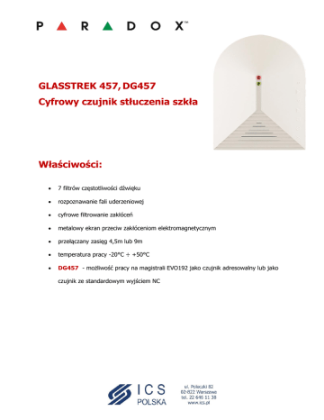 GLASSTREK 457, DG457 Cyfrowy czujnik stłuczenia szkła Właściwości: 7 filtrów częstotliwości dźwięku rozpoznawanie fali uderzeniowej cyfrowe filtrowanie zakłóceń metalowy ekran przeciw zakłóceniom elektromagnetycznym przełączany zasięg 4,5m lub 9m temperatura pracy -20°C ÷ +50°C DG457 - możliwość pracy na magistrali EVO192 jako czujnik adresowalny lub jako czujnik ze standardowym wyjściem NC