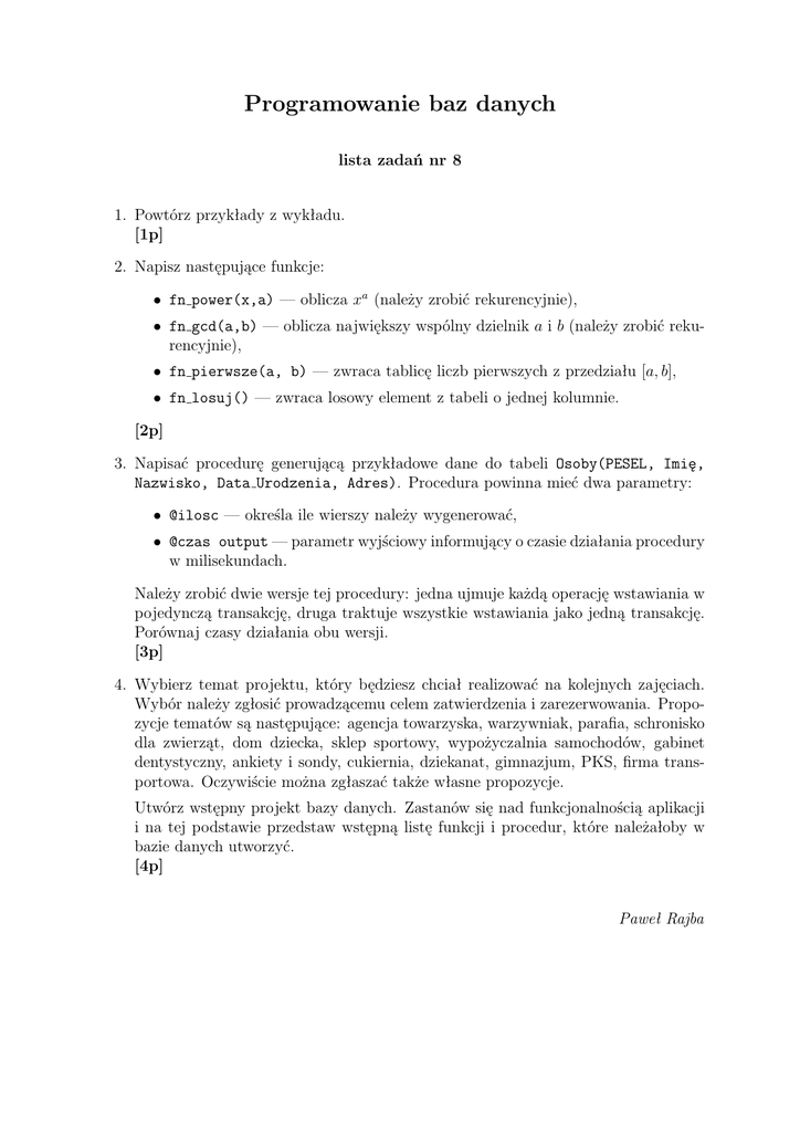 Programowanie baz danych lista zadań nr 8 1. Powtórz przykłady z wykładu. [1p] 2. Napisz następujące funkcje: • fn power(x,a) — oblicza xa (należy zrobić rekurencyjnie), • fn gcd(a,b) — oblicza największy wspólny dzielnik a i b (należy zrobić rekurencyjnie), • fn pierwsze(a, b) — zwraca tablicę liczb pierwszych z przedziału [a, b], • fn losuj() — zwraca losowy element z tabeli o jednej kolumnie. [2p] 3. Napisać procedurę generującą przykładowe dane do tabeli Osoby(PESEL, Imię, Nazwisko, Data Urodzenia, Adres). Procedura powinna mieć dwa parametry: • @ilosc — określa ile wierszy należy wygenerować, • @czas output — parametr wyjściowy informujący o czasie działania procedury w milisekundach. Należy zrobić dwie wersje tej procedury: jedna ujmuje każdą operację wstawiania w pojedynczą transakcję, druga traktuje wszystkie wstawiania jako jedną transakcję. Porównaj czasy działania obu wersji. [3p] 4. Wybierz temat projektu, który będziesz chciał realizować na kolejnych zajęciach. Wybór należy zgłosić prowadzącemu celem zatwierdzenia i zarezerwowania. Propozycje tematów są następujące: agencja towarzyska, warzywniak, parafia, schronisko dla zwierząt, dom dziecka, sklep sportowy, wypożyczalnia samochodów, gabinet dentystyczny, ankiety i sondy, cukiernia, dziekanat, gimnazjum, PKS, firma transportowa. Oczywiście można zgłaszać także własne propozycje. Utwórz wstępny projekt bazy danych. Zastanów się nad funkcjonalnością aplikacji i na tej podstawie przedstaw wstępną listę funkcji i procedur, które należałoby w bazie danych utworzyć. [4p] Paweł Rajba