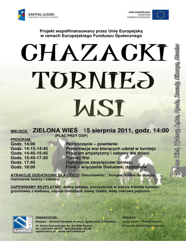Projekt współfinansowany przez Unię Europejską w ramach Europejskiego Funduszu Społecznego MIEJSCE: ZIELONA WIEŚ 15 sierpnia 2011, godz. 14:00 (PLAC PRZY OSP) PROGRAM: Godz. 14:00 Godz. 14:15-14:45 Godz. 14:45-15:45 Godz. 15:45-17:30 Godz. 17:45 Godz. 18:00 Rozpoczęcie – powitanie Prezentacja wsi biorących udział w turnieju Program artystyczny i zabawy dla dzieci Turniej Wsi Ogłoszenie zw ycięzców turnieju Finał – wręczenie Statuetek, dyplomów ATRAKCJE DODATKOWE DLA DZIECI: Dmuchawiec; ; bungee; krowa do dojenia; malowanie twarzy i zabawy. ZAPEWNIAMY BEZPŁATNIE: dobrą zabawę, poczęstunek w trakcie trwania turnieju: grochówkę z kiełbasą ,napoje chłodzące, kawę, ciasto, watę cukrową popcorn. ORGANIZATOR: PROJEKT: Miejsko - Gminny Ośrodek Pomocy Społecznej w Rawiczu Twój wybór – Twoja szansa ul. Grota Roweckiego 4a, 63-900 Rawicz tel.:(65)545-40-37 fax:(65)545-35-06 [email protected] www.ops.rawicz.pl Program Aktywności Lokalnej