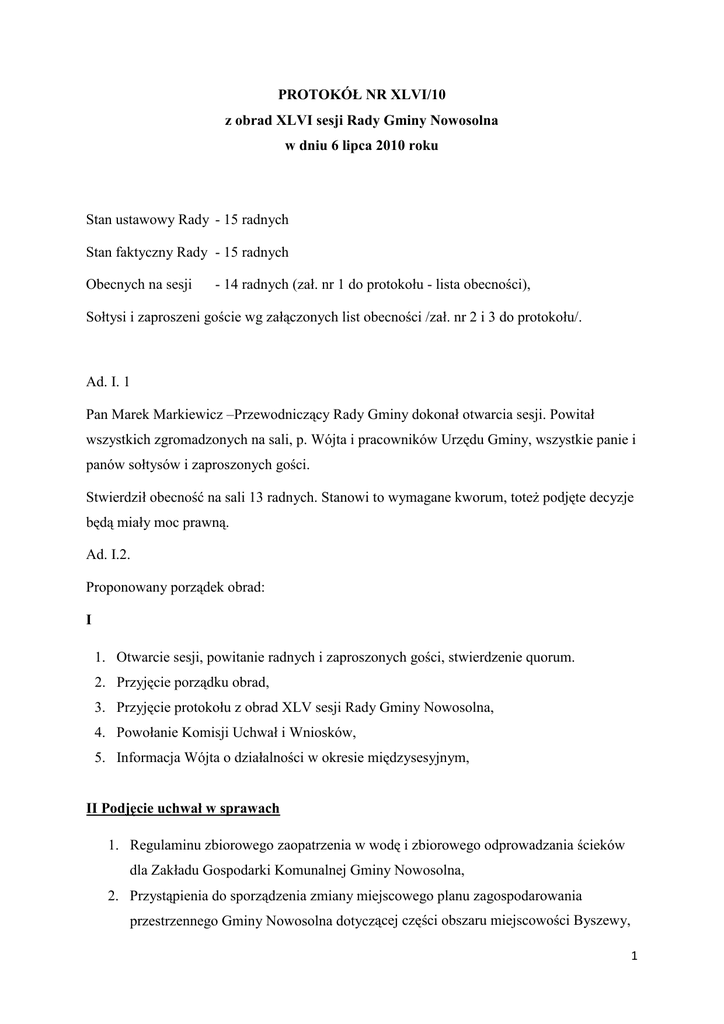 PROTOKÓŁ NR XLVI/10 z obrad XLVI sesji Rady Gminy Nowosolna w dniu 6 lipca 2010 roku Stan ustawowy Rady - 15 radnych Stan faktyczny Rady - 15 radnych Obecnych na sesji - 14 radnych (zał. nr 1 do protokołu - lista obecności), Sołtysi i zaproszeni goście wg załączonych list obecności /zał. nr 2 i 3 do protokołu/. Ad. I. 1 Pan Marek Markiewicz –Przewodniczący Rady Gminy dokonał otwarcia sesji. Powitał wszystkich zgromadzonych na sali, p. Wójta i pracowników Urzędu Gminy, wszystkie panie i panów sołtysów i zaproszonych gości. Stwierdził obecność na sali 13 radnych. Stanowi to wymagane kworum, toteŜ podjęte decyzje będą miały moc prawną. Ad. I.2. Proponowany porządek obrad: I 1. Otwarcie sesji, powitanie radnych i zaproszonych gości, stwierdzenie quorum. 2. Przyjęcie porządku obrad, 3. Przyjęcie protokołu z obrad XLV sesji Rady Gminy Nowosolna, 4. Powołanie Komisji Uchwał i Wniosków, 5. Informacja Wójta o działalności w okresie międzysesyjnym, II Podjęcie uchwał w sprawach 1. Regulaminu zbiorowego zaopatrzenia w wodę i zbiorowego odprowadzania ścieków dla Zakładu Gospodarki Komunalnej Gminy Nowosolna, 2. Przystąpienia do sporządzenia zmiany miejscowego planu zagospodarowania przestrzennego Gminy Nowosolna dotyczącej części obszaru miejscowości Byszewy, 1 3. Przystąpienia do sporządzenia zmiany miejscowego planu zagospodarowania przestrzennego Gminy Nowosolna dotyczącej części obszaru miejscowości Kopanka, 4. Przystąpienia do sporządzenia zmiany miejscowego planu zagospodarowania przestrzennego Gminy Nowosolna dotyczącej części obszaru miejscowości Stare Skoszewy, 5. Przystąpienia do sporządzenia zmiany miejscowego planu zagospodarowania przestrzennego Gminy Nowosolna dotyczącej części obszaru miejscowości Teolin, 6. Zmian do budŜetu Gminy Nowosolna na 2010 rok, 7. WyraŜenia zgody na zbycie akcji Spółki Akcyjnej Łódzkie Centrum Handlowe „Zjazdowa” w Łodzi, 8. Udzielenia pomocy finansowej Powiatowi Łódzkiemu Wschodniemu na opracowanie dokumentacji projektowo- kosztorysowej na przebudowę drogi powiatowej nr 1186E – m. Kalonka, gmina Nowosolna w powiecie łódzkim wschodnim, 9. Przekazania przez Gminę Nowosolna Miastu Łódź zadania publicznego w zakresie zbiorowego odprowadzania ścieków z terenu Gminy Nowosolna, 10. Zmian w składzie osobowym Komisji Rewizyjnej Rady Gminy Nowosolna, 11. Dokonania zmian w podziale gminy na okręgi wyborcze, 12. Zmian granic obwodów głosowania, 13. Aktu utworzenia samorządowej instytucji kultury Gminy Nowosolna- o nazwie Gminno Parkowe Centrum Kultury i Ekologii w Plichtowie. III. 1. Informacja o sposobie załatwienia interpelacji radnych i wolnych wniosków zgłoszonych na poprzedniej sesji, 2. Interpelacje radnych - udzielenie odpowiedzi, 3. Wolne wnioski i zapytania - udzielenie odpowiedzi, 4. Sprawy róŜne, 5. Zamknięcie obrad XLVI sesji. Przewodniczący poinformował o zmianach w porządku obrad: • Punkt II.8. zastąpiono punktami II.8. i 10 – tytuły projektów zgodne z tytułami uchwał podjętych przez Radę Powiatu. • Wprowadzono projekt uchwały o tytule zawartym w punkcie II. 9. 2 • Zgodnie z ustaleniami na wspólnym posiedzeniu Komisji zdjęto punkt II. 9 i punkty II. 11; II. 12./dotyczące okręgów i obwodów głosowania –Rada nie rezygnuje z rozpatrzenia tych projektów uchwał, jedynie przekłada celem szczegółowego dopracowania moŜliwości wprowadzenia zmian/. Radny Jackiewicz zgłosił wniosek o zdjęcie z porządku obrad punktu II. 13. Dotyczącego utworzenia instytucji kultury, uzasadniając tym, Ŝe inwestycja jest w trakcie budowy i generowanie kosztów w tym zakresie nie jest zasadne. Zaproponował powrócenie do tematu z chwilą opracowywania projektu budŜetu na 2011 rok. Wójt T. Bystroński odniósł się do wniosku radnego Jackiewicza- powołanie instytucji kultury łączy się z określonymi terminami wejścia w Ŝycie uchwały i procedurami rejestracyjnymi. Inwestycja realizowana jest pod GPCKiE w Plichtowie i taki wniosek został złoŜony o środki z UE. Odejście od powołania tej instytucji moŜe spowodować problemy z pozyskaniem tych środków. Wójt uwaŜa, Ŝe obawy radnego są nieuzasadnione, poniewaŜ środki na działalność kulturalną są zabezpieczone w budŜecie i nie ma obaw, Ŝe będą generowane większe skutki finansowe. Wójt zwrócił się do radnych o poparcie i nie zdejmowanie z obrad tego tematu. Przewodniczący odnosząc się do tematu powiedział, Ŝe nie tyle ma obawy, co chce mieć świadomość o celowości podejmowanych uchwał. Argumenty przywołane przez Wójta nie do końca przekonują, poniewaŜ jeŜeli chodzi o środki unijne, to nie ma niebezpieczeństwa, bo o środki unijne nie występuje instytucja kultury. Przewodniczący zgadza się z radnym Jackiewiczem, Ŝe będą generowane koszty osobowe, poniewaŜ przynajmniej 2 etaty trzeba zapewnić. Przewidziane środki na działalność kulturalną mogą się okazać niewystarczające na realizację tych zadań. Przemawia argument, Ŝeby skalkulować to w nowym budŜecie i wtedy powołać instytucję kultury. Przewodniczący dodał, Ŝe przepisy ustawy o instytucjach kultury są dość restrykcyjne i uwaŜa, Ŝe przesunięcie i racjonalne podjęcie uchwały jest w pełni uzasadnione. Wójt odniósł się do wypowiedzi Przewodniczącego- szanowni radni podejmą stosowną decyzję po przemyśleniu. Natomiast Wójt juŜ nie wystąpi z inicjatywą uchwałodawczą w tym temacie i będzie czekał na intencję uchwałodawczą radnych. Przewodniczący poddał pod głosowanie wniosek radnego Jackiewicza o zdjęcie tematu utworzenia instytucji kultury. „za” wnioskiem – 3 głosy, 3 „przeciw” wnioskowi – 8 głosów, „wstrzymało się” się od głosu 3 radnych. Wobec powyŜszego wniosek radnego przepadł. Porządek po zmianach został przyjęty 12 głosami „za” przy 2 głosach „wstrzymujących” /przybył radny Pietrzak/. Przyjęt