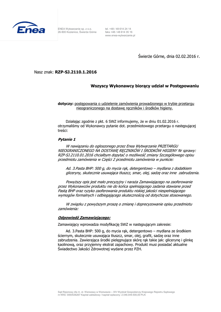 ENEA Wytwarzanie sp. z o.o. 26-900 Kozienice, Świerże Górne tel. +48 / 48 614 24 14 faks +48 / 48 614 35 16 www.enea-wytwarzanie.pl Świerże Górne, dnia 02.02.2016 r. Nasz znak: RZP-SJ.2110.1.2016 Wszyscy Wykonawcy biorący udział w Postępowaniu dotyczy: postępowania o udzielenie zamówienia prowadzonego w trybie przetargu nieograniczonego na dostawę ręczników i środków higieny. Działając zgodnie z pkt. 6 SWZ informujemy, że w dniu 01.02.2016 r. otrzymaliśmy od Wykonawcy pytanie dot. przedmiotowego przetargu o następującej treści: Pytanie 1 W nawiązaniu do ogłoszonego przez Enea Wytwarzanie PRZETARGU NIEOGRANICZONEGO NA DOSTAWĘ RĘCZNIKÓW I ŚRODKÓW HIGIENY Nr sprawy: RZP-SJ.2110.01.2016 chciałbym dopytać o możliwość zmiany Szczegółowego opisu przedmiotu zamówienia w Części 2 przedmiotu zamówienia w punkcie: Ad. 3.Pasta BHP: 500 g, do mycia rąk, detergentowo – mydlana z dodatkiem gliceryny, skutecznie usuwająca tłuszcz, smar, olej, sadzę oraz inne zabrudzenia. Powyższy opis jest mało precyzyjny i naraża Zamawiającego na zaoferowanie przez Wykonawców produktu nie do końca spełniającego zadania stawiane przed Pastą BHP oraz ryzyko zaoferowania produktu niskiej jakości niespełniającego wymogów formalnych i odbiegającego skutecznością od dotychczas stosowanego. W związku z powyższym proszę o zmianę i doprecyzowanie opisu przedmiotu zamówienia: Odpowiedź Zamawiającego: Zamawiający wprowadza modyfikację SWZ w następującym zakresie: Ad. 3.Pasta BHP: 500 g, do mycia rąk, detergentowo – mydlana ze środkiem ściernym, skutecznie usuwająca tłuszcz, smar, olej, grafit, sadzę oraz inne zabrudzenia. Zawierająca środki pielęgnujące skórę rąk takie jak: glicerynę i glinkę kaolinową, oraz przyjemny ekstrat zapachowy. Produkt musi posiadać aktualne Świadectwo Jakości Zdrowotnej wydane przez PZH. Sąd Rejonowy dla m. st. Warszawy w Warszawie – XIV Wydział Gospodarczy Krajowego Rejestru Sądowego nr KRS: 0000536267 Kapitał zakładowy / kapitał wpłacony: 2.046.049.500,00 PLN ENEA Wytwarzanie sp. z o.o. 26-900 Kozienice, Świerże Górne tel. +48 / 48 614 24 14 faks +48 / 48 614 35 16 www.enea-wytwarzanie.pl Uwaga! Przed złożeniem oferty należy zapoznać się na stronie internetowej, z załączonymi pod naszym ogłoszeniem o przetargu, odpowiedziami na zapytania do SWZ. Z poważaniem Otrzymują: 1 x strona internetowa 1 x RZP Sąd Rejonowy dla m. st. Warszawy w Warszawie – XIV Wydział Gospodarczy Krajowego Rejestru Sądowego nr KRS: 0000536267 Kapitał zakładowy / kapitał wpłacony: 2.046.049.500,00 PLN ENEA Wytwarzanie sp. z o.o. 26-900 Kozienice, Świerże Górne tel. +48 / 48 614 24 14 faks +48 / 48 614 35 16 www.enea-wytwarzanie.pl Sąd Rejonowy dla m. st. Warszawy w Warszawie – XIV Wydział Gospodarczy Krajowego Rejestru Sądowego nr KRS: 0000536267 Kapitał zakładowy / kapitał wpłacony: 2.046.049.500,00 PLN