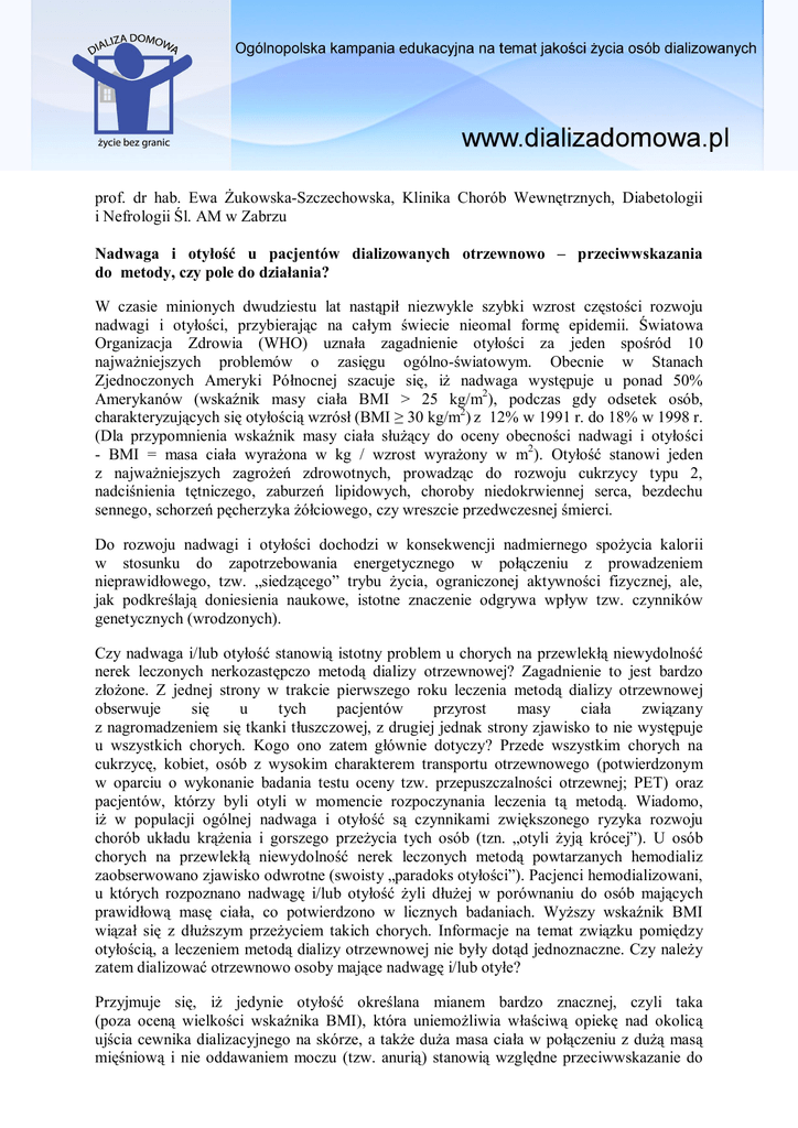 prof. dr hab. Ewa Żukowska-Szczechowska, Klinika Chorób Wewnętrznych, Diabetologii i Nefrologii Śl. AM w Zabrzu Nadwaga i otyłość u pacjentów dializowanych otrzewnowo – przeciwwskazania do metody, czy pole do działania? W czasie minionych dwudziestu lat nastąpił niezwykle szybki wzrost częstości rozwoju nadwagi i otyłości, przybierając na całym świecie nieomal formę epidemii. Światowa Organizacja Zdrowia (WHO) uznała zagadnienie otyłości za jeden spośród 10 najważniejszych problemów o zasięgu ogólno-światowym. Obecnie w Stanach Zjednoczonych Ameryki Północnej szacuje się, iż nadwaga występuje u ponad 50% Amerykanów (wskaźnik masy ciała BMI > 25 kg/m2), podczas gdy odsetek osób, charakteryzujących się otyłością wzrósł (BMI ≥ 30 kg/m2) z 12% w 1991 r. do 18% w 1998 r. (Dla przypomnienia wskaźnik masy ciała służący do oceny obecności nadwagi i otyłości - BMI = masa ciała wyrażona w kg / wzrost wyrażony w m2). Otyłość stanowi jeden z najważniejszych zagrożeń zdrowotnych, prowadząc do rozwoju cukrzycy typu 2, nadciśnienia tętniczego, zaburzeń lipidowych, choroby niedokrwiennej serca, bezdechu sennego, schorzeń pęcherzyka żółciowego, czy wreszcie przedwczesnej śmierci. Do rozwoju nadwagi i otyłości dochodzi w konsekwencji nadmiernego spożycia kalorii w stosunku do zapotrzebowania energetycznego w połączeniu z prowadzeniem nieprawidłowego, tzw. „siedzącego” trybu życia, ograniczonej aktywności fizycznej, ale, jak podkreślają doniesienia naukowe, istotne znaczenie odgrywa wpływ tzw. czynników genetycznych (wrodzonych). Czy nadwaga i/lub otyłość stanowią istotny problem u chorych na przewlekłą niewydolność nerek leczonych nerkozastępczo metodą dializy otrzewnowej? Zagadnienie to jest bardzo złożone. Z jednej strony w trakcie pierwszego roku leczenia metodą dializy otrzewnowej obserwuje się u tych pacjentów przyrost masy ciała związany z nagromadzeniem się tkanki tłuszczowej, z drugiej jednak strony zjawisko to nie występuje u wszystkich chorych. Kogo ono zatem głównie dotyczy? Przede wszystkim chorych na cukrzycę, kobiet, osób z wysokim charakterem transportu otrzewnowego (potwierdzonym w oparciu o wykonanie badania testu oceny tzw. przepuszczalności otrzewnej; PET) oraz pacjentów, którzy byli otyli w momencie rozpoczynania leczenia tą metodą. Wiadomo, iż w populacji ogólnej nadwaga i otyłość są czynnikami zwiększonego ryzyka rozwoju chorób układu krążenia i gorszego przeżycia tych osób (tzn. „otyli żyją krócej”). U osób chorych na przewlekłą niewydolność nerek leczonych metodą powtarzanych hemodializ zaobserwowano zjawisko odwrotne (swoisty „paradoks otyłości”). Pacjenci hemodializowani, u których rozpoznano nadwagę i/lub otyłość żyli dłużej w porównaniu do osób mających prawidłową masę ciała, co potwierdzono w licznych badaniach. Wyższy wskaźnik BMI wiązał się z dłuższym przeżyciem takich chorych. Informacje na temat związku pomiędzy otyłością, a leczeniem metodą dializy otrzewnowej nie były dotąd jednoznaczne. Czy należy zatem dializować otrzewnowo osoby mające nadwagę i/lub otyłe? Przyjmuje się, iż jedynie otyłość określana mianem bardzo znacznej, czyli taka (poza oceną wielkości wskaźnika BMI), która uniemożliwia właściwą opiekę nad okolicą ujścia cewnika dializacyjnego na skórze, a także duża masa ciała w połączeniu z dużą masą mięśniową i nie oddawaniem moczu (tzw. anurią) stanowią względne przeciwwskazanie do rozpoczęcia leczenia tą metodą (możemy się bowiem spodziewać występowania problemów z uzyskaniem odpowiedniego stopnia usuwania niektórych toksyn mocznicowych tzw. substancji drobnocząsteczkowych). Ta druga sytuacja nie stanowi bezwzględnej przeszkody do prowadzenia leczenia tą metodą. Osoba, która charakteryzuje się dużą masą ciała, w tym przede wszystkim masą mięśniową i oddaje stosunkowo dużo moczu (zachowała „resztkową funkcję nerek”) może być dializowana przy użyciu większej objętości płynów w trakcie leczenia ciągłą ambulatoryjną dializą otrzewnową (CADO; tzw. dializą ręczną) lub automatyczną dializą otrzewnową (ADO; przy użyciu cyklera), pamiętając jednocześnie o konieczności zastosowania dużych objętości płynów w nocy i pozostawieniu płynu w jamie otrzewnej w trakcie dnia). Pacjent, który cechuje się dużą masą ciała, a wyraża zainteresowanie i kwalifikuje się do zabiegu przeszczepienia nerki w krótkim okresie czasu od momentu rozpoznania schyłkowej niewydolności nerek (tj. wymagającej leczenia dializami), powinien z wyboru rozpoczynać leczenie metodą dializy otrzewnowej. Wraz z upływem czasu stosowanego leczenia u dializowanych otrzewnowo obserwuje się zmiany dotyczące składu ciała – polegające na zmniejszeniu zawartości tzw. beztłuszczowej masy ciała i nagromadzeniu się tkanki tłuszczowej. Wiąże się to z wchłanianiem glukozy z płynu dializacyjnego oraz brakiem aktywności fizycznej. Jak jednak wykazały badania dotyczące tych chorych, osoby, u których stwierdzono nadwagę (BMI ≥ 27,5 kg/m2) żyją dwukrotnie dłużej w porównaniu z pacjentami mającymi prawidłową masę ciała. Dalszy wzrost wagi i rozwój otyłości (BMI ≥ 30 kg/m2) prowadzi do wystąpienia większej liczby powikłań w trakcie leczenia dializą otrzewnową, niedodializowania (czyli tzw. niedostatecznego usuwania toksyn mocznicowych z organizmu i pojawienia się w związku z tym licznych objawów chorobowych), a przede wszystkim nie wpływa na poprawę przeżycia dializowanych otrzewnowo. Okazało się, iż u osób dializowanych otrzewnowo, podobnie jak u chorych hemodializowanych ważniejsze znaczenie dla ich przeżycia ma ocena stopnia niedożywienia. Na co należy w związku z tym zwrócić uwagę? Osoba dializowana otrzewnowo powinna spożywać od 1,2-1,3 g białka/kg masy ciała w zw