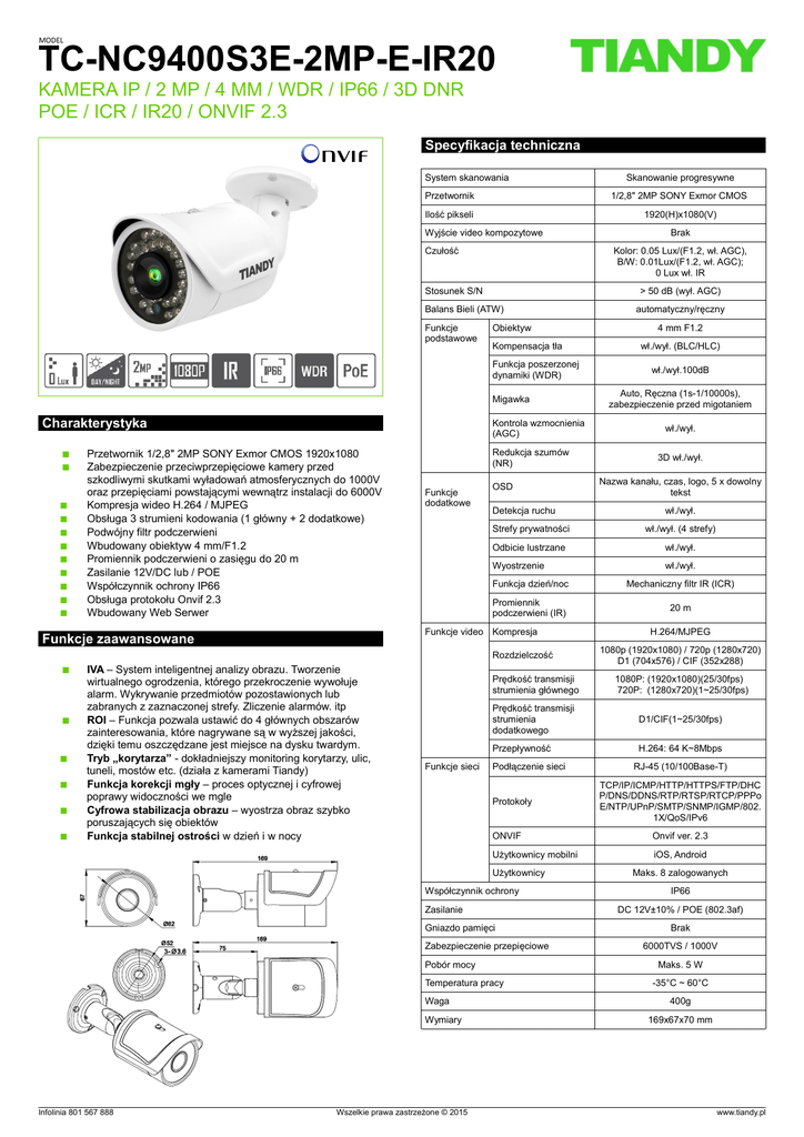 MODEL TC-NC9400S3E-2MP-E-IR20 KAMERA IP / 2 MP / 4 MM / WDR / IP66 / 3D DNR POE / ICR / IR20 / ONVIF 2.3 Specyfikacja techniczna System skanowania 1/2,8" 2MP SONY Exmor CMOS Ilość pikseli 1920(H)x1080(V) Wyjście video kompozytowe Czułość > 50 dB (wył. AGC) Balans Bieli (ATW) Funkcje podstawowe Obiektyw Kompensacja tła Funkcja poszerzonej dynamiki (WDR) Migawka Charakterystyka Kontrola wzmocnienia (AGC) Przetwornik 1/2,8" 2MP SONY Exmor CMOS 1920x1080 Zabezpieczenie przeciwprzepięciowe kamery przed szkodliwymi skutkami wyładowań atmosferycznych do 1000V oraz przepięciami powstającymi wewnątrz instalacji do 6000V Kompresja wideo H.264 / MJPEG Obsługa 3 strumieni kodowania (1 główny + 2 dodatkowe) Podwójny filtr podczerwieni Wbudowany obiektyw 4 mm/F1.2 Promiennik podczerwieni o zasięgu do 20 m Zasilanie 12V/DC lub / POE Współczynnik ochrony IP66 Obsługa protokołu Onvif 2.3 Wbudowany Web Serwer Redukcja szumów (NR) Funkcje dodatkowe OSD Detekcja ruchu IVA – System inteligentnej analizy obrazu. Tworzenie wirtualnego ogrodzenia, którego przekroczenie wywołuje alarm. Wykrywanie przedmiotów pozostawionych lub zabranych z zaznaczonej strefy. Zliczenie alarmów. itp ROI – Funkcja pozwala ustawić do 4 głównych obszarów zainteresowania, które nagrywane są w wyższej jakości, dzięki temu oszczędzane jest miejsce na dysku twardym. Tryb „korytarza” - dokładniejszy monitoring korytarzy, ulic, tuneli, mostów etc. (działa z kamerami Tiandy) Funkcja korekcji mgły – proces optycznej i cyfrowej poprawy widoczności we mgle Cyfrowa stabilizacja obrazu – wyostrza obraz szybko poruszających się obiektów Funkcja stabilnej ostrości w dzień i w nocy Nazwa kanału, czas, logo, 5 x dowolny tekst wł./wył. wł./wył. Promiennik podczerwieni (IR) 20 m H.264/MJPEG 1080p (1920x1080) / 720p (1280x720) D1 (704x576) / CIF (352x288) Prędkość transmisji strumienia głównego 1080P: (1920x1080)(25/30fps) 720P: (1280x720)(1~25/30fps) Prędkość transmisji strumienia dodatkowego D1/CIF(1~25/30fps) Podłączenie sieci H.264: 64 K~8Mbps RJ-45 (10/100Base-T) TCP/IP/ICMP/HTTP/HTTPS/FTP/DHC P/DNS/DDNS/RTP/RTSP/RTCP/PPPo E/NTP/UPnP/SMTP/SNMP/IGMP/802. 1X/QoS/IPv6 ONVIF Onvif ver. 2.3 Użytkownicy mobilni iOS, Android Użytkownicy Zasilanie Gniazdo pamięci Zabezpieczenie przepięciowe Pobór mocy Temperatura pracy Wszelkie prawa zastrzeżone © 2015 3D wł./wył. Mechaniczny filtr IR (ICR) Współczynnik ochrony Infolinia 801 567 888 wł./wył. Funkcja dzień/noc Protokoły Wymiary Auto, Ręczna (1s-1/10000s), zabezpieczenie przed migotaniem wł./wył. Przepływność Waga wł./wył.100dB Odbicie lustrzane Wyostrzenie Funkcje sieci 4 mm F1.2 wł./wył. (BLC/HLC) wł./wył. (4 strefy) Rozdzielczość automatyczny/ręczny Strefy prywatności Funkcje video Kompresja Funkcje zaawansowane Brak Kolor: 0.05 Lux/(F1.2, wł. AGC), B/W: 0.01Lux/(F1.2, wł. AGC); 0 Lux wł. IR Stosunek S/N Skanowanie progresywne Przetwornik Maks. 8 zalogowanych IP66 DC 12V±10% / POE (802.3af) Brak 6000TVS / 1000V Maks. 5 W -35°C ~ 60°C 400g 169x67x70 mm www.tiandy.pl