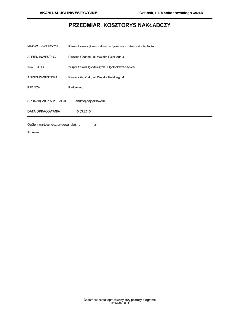 AKAM USŁUGI INWESTYCYJNE Gdańsk, ul. Kochanowskiego 39/9A PRZEDMIAR, KOSZTORYS NAKŁADCZY NAZWA INWESTYCJI : Remont elewacji wschodniej budynku warsztatów z dociepleniem ADRES INWESTYCJI : Pruszcz Gdański, ul. Wojska Polskiego 4 INWESTOR : zespół Szkół Ogrodniczych i Ogólnokształcących ADRES INWESTORA : Pruszcz Gdański, ul. Wojska Polskiego 4 BRANŻA : Budowlana SPORZĄDZIŁ KALKULACJE : Andrzej Zajączkowski DATA OPRACOWANIA 10.03.2010 : Ogółem wartość kosztorysowa robót : zł Słownie: Dokument został opracowany przy pomocy programu NORMA STD Elewacja ZSOiO Warsztaty PRZEDMIAR Lp. Podstawa Opis i wyliczenia j.m. 1 Elewacja wschodnia 1 KNR 4-01 Uzupełnienie ścian lub zamurowanie otworów w ścianach na zaprawie cemen- m3 d.1 0304-01 towo-wapiennej cegłami 2.25*0.90*0.38 m3 2 KNR 2-02 d.1 1604-01 3 KNR 4-01 d.1 0701-02 4 KNR 4-01 d.1 0725-02 5 KNR 4-01 d.1 0727-03 6 KNR 4-01 d.1 0535-03 7 KNR 4-01 d.1 0535-05 8 KNR 4-01 d.1 0535-08 9 KNR 0-17 d.1 2610-03 10 KNR 0-17 d.1 2610-08 Rusztowania zewnętrzne rurowe o wysokości do 10 m m2 38.50*3.90 m2 Odbicie tynków wewnętrznych z zaprawy cementowo-wapiennej na ścianach, filarach, pilastrach o powierzchni odbicia do 5 m2. Przyjęto odbicie tynku na 15% powierzchni 38.47*3.91*0.15 m2 m2 Uzupełnienie tynków zewnętrznych zwykłych kat. II o podłożach z cegły, pusta- m2 ków, gazo-i pianobetonów ( do 2 m2 w 1 miejscu ) 2.25*0.90*3+poz.3 m2 Uzupełnienie tynków zewnętrznych cementowych kat. II o podłożach z z cegły, m2 pustaków, gazo-i pianobetonów ( do 5 m2 w 1 miejscu ) 25*0.6 m2 Rozebranie rynien z blachy nadającej się do użytku m 39.20 m Rozebranie rur spustowych z blachy nadającej się do użytku m 3.80*5 m Rozebranie obróbek blacharskich murów ogniowych, okapów, kołnierzy, gzym- m2 sów itp. z blachy nie nadającej się do użytku. Rozebranie podokienników zewnętrznych. (2.11+2.30*3+1.76*2+0.8*4)*0.25 m2 Ocieplenie ścian budynków z betonupłytami styropianowymi metodą lekką-mo- m2 krą wraz z przyg. podłoża i ręczne wyk. wyprawy elewacyjnej cienkowarstwowej z got. suchej mieszanki 38.47*3.91-1.5*2.11-2.30*1.50*3-1.76*1.5*2-0.8*0.6*4 m2 Ocieplenie ościeży z cegły o szer. do 30 cm Ocieplenie ścian budynków płyta- m2 mi styropianowymi metodą lekką-mokrą wraz z przyg. podłoża i ręczne wyk. wyprawy elewacyjnej cienkowarstwowej z got. suchej mieszanki (1.50*12+2.11+2.30*3+1.76*2+0.60*8+0.85*4)*0.20 m2 11 Wkonanie opasek szerokości 15 cm z cegły klinkierowej formowanej ręcznie, m d.1 kalk. własna przecinanej do połowy grubości, mocowanej na styropianie za pomocą szpilek stalowych 1.50*12+2.11+2.30*3+1.76*2+0.60*8+0.85*4 m 12 TZKNBK IV - Obłożenie cokołu cegłą klinkierową kształtowaną ręcznie, przycinaną do połod.1 417 wy grubości. 38.47*0.45 13 KNR 2-01 d.1 0313-07 14 KNR 2-31 d.1 0502-04 15 KNR 2-02 d.1 0508-04 analogia 16 KNR 2-02 d.1 0510-03 17 KNR 2-31 d.1 0502-04 m2 Chodniki z płyt betonowych 50x50x7 cm na podsypce cementowo-piaskowej z m2 wypełnieniem spoin zaprawą cementową 27*1.5 m2 Rynny dachowe półokrągłe o śr. 15 cm uprzedmnio zdemontowane m poz.6 m Rury spustowe okrągłe o śr. 12 cm - z blachy ocynkowanej m poz.7 m Chodniki z płyt betonowych 50x50x7 cm na podsypce cementowo-piaskowej z m2 wypełnieniem spoin zaprawą cementową 27*1.5 m2 Norma STD Wersja 4.26 Licencja: 8705 dla Andrzej Zajączkowski Razem 0.770 RAZEM 0.770 150.150 RAZEM 150.150 22.563 RAZEM 22.563 28.638 RAZEM 28.638 15.000 RAZEM 15.000 39.200 RAZEM 39.200 19.000 RAZEM 19.000 3.933 RAZEM 3.933 129.703 RAZEM 129.703 7.746 RAZEM 7.746 38.730 RAZEM 38.730 17.312 RAZEM 17.312 10.000 RAZEM 10.000 40.500 RAZEM 40.500 39.200 RAZEM 39.200 19.000 RAZEM 19.000 40.500 RAZEM 40.500 m2 Ręczne formowanie nasypów z ziemi dowożonej samochodami skrzyniowymi z m3 otwieranymi tyłami i bokami (kat.gr.I-II). Zasypanie wykopów po fundamentach 25.0*0.5*0.8 m3 -1- Poszcz Elewacja ZSOiO Warsztaty Lp. Podstawa 1 1 KNR 4-01 d.1 0304-01 1* 2* 3* 4* 5* 6* 7* Opis jm Elewacja wschodnia Uzupełnienie ścian lub zamurowanie otworów m3 w ścianach na zaprawie cementowo-wapiennej cegłami obmiar = 2.25*0.90*0.38 = 0.770 m3 -- R -robocizna 15.37r-g/m3 -- M -cegła budowlana pełna 372szt./m3 cement portlandzki 35 bez dodatków 0.0618t/m3 wapno suchogaszone 0.0345t/m3 piasek do zapraw 0.322m3/m3 woda z rurociągu 0.152m3/m3 materiały pomocnicze 1.5%(od M) -- S -betoniarka wolnospadowa elektryczna 0.45m-g/m3 9* wyciąg jednomasztowy z napędem elektrycznym 0,5 t 2.11m-g/m3 Razem koszty bezpośrednie: Cena jednostkowa: 2 KNR 2-02 Rusztowania zewnętrzne rurowe o wysokości d.1 1604-01 do 10 m obmiar = 38.50*3.90 = 150.150 m2 8* 1* 2* 3* 4* 5* 6* 7* 8* 9* 10* Nakłady -- R -robocizna 0.5482r-g/m2 -- M -płyty pomostowe robocze 0.0141m2/m2 płyty komunikacyjne długie 0.0004m2/m2 płyty komunikacyjne krótkie 0.0002m2/m2 bale iglaste obrzynane gr. 50 mm kl.II 0.00003m3/m2 deski iglaste obrzynane gr. 25 mm kl.II 0.00018m3/m2 deski iglaste obrzynane gr.25 mm kl.III 0.00002m3/m2 haki do muru 0.012kg/m2 drut stalowy okrągły 3 mm 0.009kg/m2 materiały pomocnicze 1.5%(od M) r-g 11.8349 szt. 286.4400 t 0.0476 t 0.0266 m3 0.2479 m3 0.1170 % 1.5000 m-g 0.3465 m-g 1.6247 m2 r-g 82.3122 m2 2.1171 m2 0.0601 m2 0.0300 m3 0.0045 m3 0.0270 m3 0.0030 kg 1.8018 kg 1.3514 % 1.5000 -- S -rusztowanie rurowe m-g 0.156m-g/m2 Razem koszty bezpośrednie: Cena jednostkowa: 3 KNR 4-01 Odbicie tynków wewnętrznych z zaprawy cem2 d.1 0701-02 mentowo-wapiennej na ścianach, filarach, pilastrach o powierzchni odbicia do 5 m2. Przyjęto odbicie tynku na 15% powierzchni obmiar = 38.47*3.91*0.15 = 22.563 m2 11* -- R -robocizna 0.41r-g/m2 Razem koszty bezpośrednie: Cena jednostkowa: 1* r-g -2- Norma STD Wersja 4.26 Licencja: 8705 dla Andrzej Zajączkowski 23.4234 9.2508 Koszt jedn. R M S Elewacja ZSOiO Warsztaty Lp. Podstawa 4 KNR 4-01 d.1 0725-02 1* 2* 3* 4* 5* 6* Opis jm Uzupełnienie tynków zewnętrznych zwykłych kat. II o podłoż