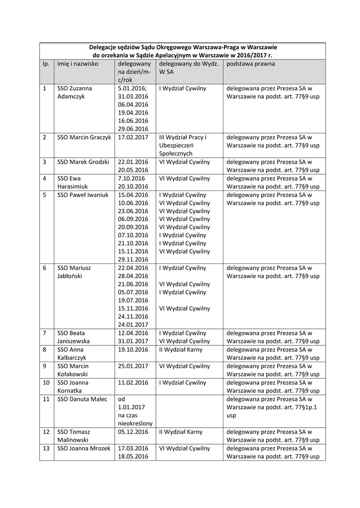 lp. 1 2 3 4 5 6 7 8 9 10 11 12 13 Delegacje sędziów Sądu Okręgowego Warszawa-Praga w Warszawie do orzekania w Sądzie Apelacyjnym w Warszawie w 2016/2017 r. imię i nazwisko delegowany delegowany do Wydz. podstawa prawna na dzień/m- W SA c/rok SSO Zuzanna 5.01.2016; I Wydział Cywilny delegowana przez Prezesa SA w Adamczyk 31.03.2016 Warszawie na podst. art. 77§9 usp 06.04.2016 19.04.2016 16.06.2016 29.06.2016 SSO Marcin Graczyk 17.02.2017 III Wydział Pracy i delegowany przez Prezesa SA w Ubezpieczeń Warszawie na podst. art. 77§9 usp Społecznych SSO Marek Grodzki 22.01.2016 VI Wydział Cywilny delegowany przez Prezesa SA w 20.05.2016 Warszawie na podst. art. 77§9 usp SSO Ewa 7.10.2016 VI Wydział Cywilny delegowana przez Prezesa SA w Harasimiuk 20.10.2016 Warszawie na podst. art. 77§9 usp SSO Paweł Iwaniuk 15.04.2016 I Wydział Cywilny delegowany przez Prezesa SA w 10.06.2016 VI Wydział Cywilny Warszawie na podst. art. 77§9 usp 23.06.2016 VI Wydział Cywilny 06.09.2016 VI Wydział Cywilny 20.09.2016 VI Wydział Cywilny 07.10.2016 I Wydział Cywilny 21.10.2016 I Wydział Cywilny 15.11.2016 VI Wydział Cywilny 29.11.2016 SSO Mariusz 22.04.2016 I Wydział Cywilny delegowany przez Prezesa SA w Jabłoński 28.04.2016 Warszawie na podst. art. 77§9 usp 21.06.2016 VI Wydział Cywilny 05.07.2016 I Wydział Cywilny 19.07.2016 15.11.2016 VI Wydział Cywilny 24.11.2016 24.01.2017 SSO Beata 12.04.2016 I Wydział Cywilny delegowana przez Prezesa SA w Janiszewska 31.01.2017 VI Wydział Cywilny Warszawie na podst. art. 77§9 usp SSO Anna 19.10.2016 II Wydział Karny delegowana przez Prezesa SA w Kalbarczyk Warszawie na podst. art. 77§9 usp SSO Marcin 25.01.2017 VI Wydział Cywilny delegowany przez Prezesa SA w Kołakowski Warszawie na podst. art. 77§9 usp SSO Joanna 11.02.2016 I Wydział Cywilny delegowana przez Prezesa SA w Kornatka Warszawie na podst. art. 77§9 usp SSO Danuta Malec od delegowana przez Prezesa SA w 1.01.2017 Warszawie na podst. art. 77§1p.1 na czas usp nieokreślony SSO Tomasz 05.12.2016 II Wydział Karny delegowany przez Prezesa SA w Malinowski Warszawie na podst. art. 77§9 usp SSO Joanna Mrozek 17.03.2016 VI Wydział Cywilny delegowana przez Prezesa SA w 18.05.2016 Warszawie na podst. art. 77§9 usp 18.10.2016 27.10.2016 24.11.2016 07.12.2016 14 SSO Katarzyna Sałaj - Alechno 15 SSO Anna 15.01.2016 Szymańska-Grodzka 03.03.2016 14.03.2016 06.05.2016 19.05.2016 22.07.2016 29.11.2016 SSO Paulina 17.01.2017 Wawrzynkiewicz SSO Agnieszka Wilk 23.11.2016 I Wydział Cywilny SSO Elżbieta WiatrzykWojciechowska I Wydział Cywilny 16 17 18 19 SSO Anna Wrembel-Woźniak 02.03.2016 10.06.2016 29.11.2016 12.12.2016 13.12.2016 12.01.2017 19.01.2017 21.01.2017 19.01.2016 I Wydział Cywilny VI Wydział Cywilny II Wydział Karny delegowana przez Prezesa SA w Warszawie na podst. art. 77§9 usp 15 De16legowana przez Prezesa SA w Warszawie na podst. art. 77§9 usp delegowana przez Prezesa SA w Warszawie na podst. art. 77§9 usp delegowana przez Prezesa SA w Warszawie na podst. art. 77§9 usp delegowana przez Prezesa SA w Warszawie na podst. art. 77§9 usp I Wydział Cywilny VI Wydział Cywilny I Wydział Cywilny VI Wydział Cywilny VI Wydział Cywilny delegowana przez Prezesa SA w Warszawie na podst. art. 77§9 usp