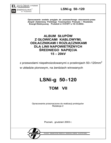 £-POZNAē ENERGOLINIA LSNi-g 50y120 W POZNANIU Opracowanie zostaáo przyjĊte do powszechnego stosowania przez Zespóá Zadaniowy Polskiego Towarzystwa Przesyáu i Rozdziaáu Energii Elektrycznej. Protokóá nr 31218T1 z 18.12.2003r. ALBUM SàUPÓW Z GàOWICAMI KABLOWYMI, ODàACZNIKAMI I ROZàĄCZNIKAMI DLA LINII NAPOWIETRZNYCH ĝREDNIEGO NAPIĉCIA 15 y 20kV z przewodami niepeánoizolowanymi o przekrojach 50y120mm2 w ukáadzie pionowym, na Īerdziach wirowanych LSNi-g 50y120 TOM VII Opracowanie przeznaczone do realizacji prototypów Redakcja 2 PoznaĔ, grudzieĔ 2003 r. POLSKIE TOWARZYSTWO PRZESYáU I ROZDZIAáU ENERGII ELEKTRYCZNEJ £-POZNAē ENERGOLINIA LSNi-o 50y120 W POZNANIU Oferta PTPiREE w zakresie opracowaĔ typizacyjnych 1. 2. 3. 4. 5. 6. 7. 8. 9. 10. 11. 12. 13. 14. 15. 16. 17. 18. 19. 20. Albumy linii napowietrznych niskiego napiĊcia z przewodami goáymi AL 25-95 mm2 na Īerdziach wirowanych Lnn Albumy linii napowietrznych wielotorowych niskiego napiĊcia z przewodami izolowanymi samonoĞnymi o przekroju 25-120 mm2 Lnni Album przyáączy napowietrznych i kablowych niskiego napiĊcia Lnn-pi Album linii napowietrznych niskiego napiĊcia Lnn + Lnni z przewodami izolowanymi samonoĞnymi AsXS i AsXSn na istniejących liniach niskiego napiĊcia z przewodami goáymi na sáupach z Īerdzi ĩN Albumy sáupowych stacji transformatorowych typu STSR na Īerdziach wirowanych Albumy sáupowych stacji transformatorowych typu STSd na Īerdziach drewnianych Albumy linii napowietrznych Ğredniego napiĊcia 15-20 kV z przewodami goáymi w ukáadzie trójkątnym na Īerdziach wirowanych typu E i ELV LSN 35(50) i 70(50) Albumy linii napowietrznych Ğredniego napiĊcia 15-20 kV z przewodami goáymi w ukáadzie páaskim na Īerdziach wirowanych LSN 70 (50) Albumy linii napowietrznych Ğredniego napiĊcia 15-20 kV z przewodami goáymi na Īerdziach wirowanych LSN 120 (70) - ukáad przewodów páaski i trójkątny Albumy linii dwutorowych Ğredniego napiĊcia 15-20 kV z przewodami goáymi na Īerdziach wirowanych LSN Albumy sáupów z rozáącznikami sterowanymi radiowo dla linii Ğredniego napiĊcia 15-20 kV Album linii napowietrznych Ğredniego napiĊcia 15-20 kV z przewodami goáymi w ukáadzie trójkątnym na Īerdziach drewnianych LSNd 35 (50) 70 Albumy linii napowietrznych Ğredniego napiĊcia 15-20 kV z przewodami goáymi na Īerdziach wirowanych LSN-PR Albumy linii napowietrznych Ğredniego napiĊcia 15-20 kV z przewodami niepeánoizolowanymi LSNi 50÷120 na Īerdziach wirowanych – ukáad przewodów páaski i pionowy Albumy linii napowietrznych dwutorowych Ğredniego napiĊcia 15-20 kV z przewodami niepeánoizolowanymi o przekrojach 2x70÷120 mm2 w ukáadzie pionowym na Īerdziach wirowanych Albumy linii napowietrznych dwunapiĊciowych Ğredniego napiĊcia z przewodami niepeánoizolowanych i peánoizolowanymi niskiego napiĊcia z przewodami izolowanymi na Īerdziach wirowanych LSNi + LnNi Albumy linii napowietrznych Ğredniego napiĊcia 15÷20 kV z przewodami niepeánoizolowanymi w ukáadzie pionowym na Īerdziach drewnianych LSNid 50÷120 Albumy linii napowietrznych izolowanych Ğredniego i niskiego napiĊcia LSNi / SAXKA + Lnni Katalog oĞwietlenia ulicznego Katalogi sáupów i fundamentów linii 110 kV Rozpowszechnianie: Polskie Towarzystwo Przemysáu i Rozdziaáu Energii Elektrycznej w Poznaniu ul. WoáyĔska 22, 60 – 637 PoznaĔ tel. +48 61 846-02-33, fax +48 61 846-02-09 Powielanie i rozpowszechnianie powyĪszych opracowaĔ bez zgody Polskiego Towarzystwa Przesyáu i Rozdziaáu Energii Elektrycznej oraz zespoáu autorskiego jest wzbronione. POLSKIE TOWARZYSTWO PRZESYáU I ROZDZIAáU ENERGII ELEKTRYCZNEJ LSNi-o 50y120 Wydawca opracowania Polskie Towarzystwo Przesyáu i Rozdziaáu Energii Elektrycznej ul. WoáyĔska 22, 60-637 PoznaĔ tel. +48 61 846-02-00, fax +28 61 846-02-09 www.ptpiree.pl Rozpowszechnianie albumów Biuro Polskiego Towarzystwa Przesyáu i Rozdziaáu Energii Elektrycznej ul. WoáyĔska 22, 60-637 PoznaĔ tel. +48 61 846-02-33, fax +48 61 846-02-09 e-mail: [email protected] Powielanie i rozpowszechnianie opracowania bez zgody Polskiego Towarzystwa Przesyáu i Rozdziaáu Energii Elektrycznej oraz zespoáu autorskiego jest wzbronione Autor opracowania POLSKIE TOWARZYSTWO PRZESYáU I ROZDZIAáU ENERGII ELEKTRYCZNEJ £-POZNAē ENERGOLINIA LSNi-g 50y120 W POZNANIU Spis tomów Tom I - Album linii napowietrznych Ğredniego napiĊcia 15 y 20kV z przewodami niepeánoizolowanymi o przekrojach 50 y 120 mm2 w ukáadzie páaskim na Īerdziach wirowanych LSNi 50y120 Tom II - Album sáupów z odáącznikami i rozáącznikami dla linii napowietrznych Ğredniego napiĊcia 15 y 20kV z przewodami niepeánoizolowanymi o przekrojach 50 y 120 mm2 w ukáadzie páaskim na Īerdziach wirowanych LSNi-o 50y120 Tom III - Album sáupów z gáowicami kablowymi, odáącznikami i rozáącznikami dla linii napowietrznych Ğredniego napiĊcia 15 y 20kV z przewodami niepeánoizolowanymi o przekrojach 50 y 120 mm2 w ukáadzie páaskim na Īerdziach wirowanych LSNi-g 50y120 Tom IV - Album linii napowietrznych Ğredniego napiĊcia 15 y 20kV z przewodami niepeánoizolowanymi o przekrojach 50 y 120 mm2 w ukáadzie páaskim na Īerdziach wirowanych LSNi 50y120 + LSNi-o 50y120 + LSNi-g 50y120 Konstrukcje stalowe do tomów I, II i III Tom V - Album linii napowietrznych Ğredniego napiĊcia 15 y 20kV z przewodami niepeánoizolowanymi o przekrojach 50 y 120 mm2 w ukáadzie pionowym na Īerdziach wirowanych LSNi 50y120 Tom VI - Album sáupów z odáącznikami i rozáącznikami dla linii napowietrznych Ğredniego napiĊcia 15 y 20kV z przewodami niepeánoizolowanymi o przekrojach 50 y 120 mm2 w ukáadzie pionowym na Īerdziach wirowanych LSNi-o 50y120 Tom VII - Album sáupów z gáowicami kablowymi, odáącznikami i rozáącznikami dla linii napowietrznych Ğredniego napiĊcia 15 y 20kV z przewodami niepeánoizolowanymi o przekrojach 50 y 120 mm2 w ukáadzie pionowym na Īerdziach wirowanych LSNi-g 50y120 Tom VI