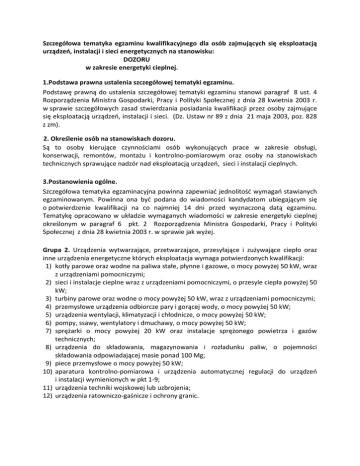 Szczegółowa tematyka egzaminu kwalifikacyjnego dla osób zajmujących się eksploatacją urządzeń, instalacji i sieci energetycznych na stanowisku: DOZORU w zakresie energetyki cieplnej. 1.Podstawa prawna ustalenia szczegółowej tematyki egzaminu. Podstawę prawną do ustalenia szczegółowej tematyki egzaminu stanowi paragraf 8 ust. 4 Rozporządzenia Ministra Gospodarki, Pracy i Polityki Społecznej z dnia 28 kwietnia 2003 r. w sprawie szczegółowych zasad stwierdzania posiadania kwalifikacji przez osoby zajmujące się eksploatacją urządzeń, instalacji i sieci. (Dz. Ustaw nr 89 z dnia 21 maja 2003, poz. 828 z zm). 2. Określenie osób na stanowiskach dozoru. Są to osoby kierujące czynnościami osób wykonujących prace w zakresie obsługi, konserwacji, remontów, montażu i kontrolno‐pomiarowym oraz osoby na stanowiskach technicznych sprawujące nadzór nad eksploatacją urządzeń, sieci i instalacji cieplnych. 3.Postanowienia ogólne. Szczegółowa tematyka egzaminacyjna powinna zapewniać jednolitość wymagań stawianych egzaminowanym. Powinna ona być podana do wiadomości kandydatom ubiegającym się o potwierdzenie kwalifikacji na co najmniej 14 dni przed wyznaczoną datą egzaminu. Tematykę opracowano w układzie wymaganych wiadomości w zakresie energetyki cieplnej określonym w paragraf 6 pkt. 2 Rozporządzenia Ministra Gospodarki, Pracy i Polityki Społecznej z dnia 28 kwietnia 2003 r. w sprawie jak wyżej. Grupa 2. Urządzenia wytwarzające, przetwarzające, przesyłające i zużywające ciepło oraz inne urządzenia energetyczne których eksploatacja wymaga potwierdzonych kwalifikacji: 1) kotły parowe oraz wodne na paliwa stałe, płynne i gazowe, o mocy powyżej 50 kW, wraz z urządzeniami pomocniczymi; 2) sieci i instalacje cieplne wraz z urządzeniami pomocniczymi, o przesyle ciepła powyżej 50 kW; 3) turbiny parowe oraz wodne o mocy powyżej 50 kW, wraz z urządzeniami pomocniczymi; 4) przemysłowe urządzenia odbiorcze pary i gorącej wody, o mocy powyżej 50 kW; 5) urządzenia wentylacji, klimatyzacji i chłodnicze, o mocy powyżej 50 kW; 6) pompy, ssawy, wentylatory i dmuchawy, o mocy powyżej 50 kW; 7) sprężarki o mocy powyżej 20 kW oraz instalacje sprężonego powietrza i gazów technicznych; 8) urządzenia do składowania, magazynowania i rozładunku paliw, o pojemności składowania odpowiadającej masie ponad 100 Mg; 9) piece przemysłowe o mocy powyżej 50 kW; 10) aparatura kontrolno‐pomiarowa i urządzenia automatycznej regulacji do urządzeń i instalacji wymienionych w pkt 1‐9; 11) urządzenia techniki wojskowej lub uzbrojenia; 12) urządzenia ratowniczo‐gaśnicze i ochrony granic. 4.Szczegółowa tematyka egzaminu Osoby zajmujące się eksploatacją urządzeń, instalacji i sieci na stanowiskach dozoru w celu uzyskania potwierdzenia posiadanych kwalifikacji, powinny wykazać się wiedzą z zakresu : a) przepisów dotyczących przyłączania urządzeń i instalacji do sieci, dostarczania paliw i energii oraz prowadzenia ruchu i eksploatacji urządzeń, instalacji i sieci, b) przepisów i zasad postępowania przy programowaniu pracy urządzeń, instalacji i sieci, z uwzględnieniem zasad racjonalnego użytkowania paliw i energii, c) przepisów dotyczących eksploatacji, wymagań w zakresie prowadzenia dokumentacji technicznej i eksploatacyjnej oraz stosowania instrukcji eksploatacji urządzeń, instalacji i sieci, d) przepisów dotyczących budowy urządzeń, instalacji i sieci oraz norm i warunków technicznych, jakim powinny odpowiadać te urządzenia, instalacje i sieci, e) przepisów dotyczących bezpieczeństwa i higieny pracy oraz ochrony przeciwpożarowej, z uwzględnieniem udzielania pierwszej pomocy oraz wymagań ochrony środowiska, f) zasad postępowania w razie awarii, pożaru lub innego zagrożenia bezpieczeństwa ruchu urządzeń przyłączonych do sieci, g) zasad dysponowania mocą urządzeń przyłączonych do sieci, dyspozytor sieci ciepłowniczej, h) zasad i warunków wykonywania prac kontrolno‐pomiarowych i montażowych. 4.1. Przepisy w zakresie przyłączania urządzeń i instalacji do sieci, dostarczania paliw i energii oraz prowadzenia ruchu i eksploatacji urządzeń, instalacji i sieci: Znajomość Rozporządzenia Ministra Gospodarki i Pracy z dnia 30.06.2004 r. w sprawie warunków przyłączania podmiotów do sieci cieplnych oraz eksploatacji tych sieci. Umowa o przyłączeniu, warunki przyłączenia i grupy przyłączeniowe ‐ Obowiązki dostawcy i odbiorcy energii cieplnych. Prowadzenie ruchu sieciowego i eksploatacja sieci. Standardy jakościowe obsługi odbiorców, programy pracy sieci. jakościowe obsługi odbiorców. Warunki wstrzymania dostawy energii cieplnej. Wymagania i zawartość dokumentacji technicznej ( projektowej ). Tryb uzgadniania rozwiązań technicznych. Sprawdzanie realizacji warunków przyłączania urządzeń, sieci i instalacji cieplnych oraz ich uruchomienie. Przepisy dotyczące poboru, regulowania i dysponowania mocą i energią. Kształtowanie dobowego poboru mocy. Pewność zasilania i zasady rezerwowania. Rodzaje i zasady doboru układów pomiarowych. Taryfy opłat. 4.2. Przepisy i zasady postępowania przy programowaniu pracy sieci, instalacji i urządzeń z uwzględnieniem zasad racjonalnego użytkowania energii: Znajomość ogólnych zasad wytwarzania, przesyłu, rozdziału i racjonalnego użytkowania energii. Znajomość zasad programowania pracy urządzeń i instalacji zmierzających do uzyskania wyrównanego przebiegu obciążenia i minimalizacji zużycia paliw i energii (harmonogram pracy urządzeń wykorzystania wydajności urządzeń, eliminowania biegu jałowego agregatów, ograniczenia pracy urządzeń energochłonnych i niskosprawnych). Bieżąca kontrola poboru mocy i zużycia paliw i energii w procesach produkcyjnych. Okresowa analiza energochłonności. Normowanie zużycia energii cieplnej. Analiza strat energii i ekonomicznego obciążenia urządzeń energetyczn