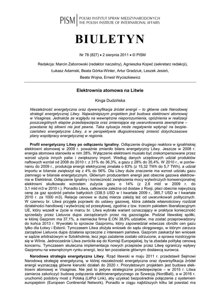 BIULETYN Nr 78 (827) 2 sierpnia 2011 © PISM Redakcja: Marcin Zaborowski (redaktor naczelny), Agnieszka Kopeć (sekretarz redakcji), Łukasz Adamski, Beata Górka-Winter, Artur Gradziuk, Leszek Jesień, Beata Wojna, Ernest Wyciszkiewicz Elektrownia atomowa na Litwie Kinga Dudzińska Niezależność energetyczna oraz dywersyfikacja źródeł energii – to główne cele Narodowej strategii energetycznej Litwy. Najważniejszym projektem jest budowa elektrowni atomowej w Visaginas. Jednakże ze względu na wewnętrzne nieporozumienia, opóźnienia w realizacji poszczególnych etapów przedsięwzięcia oraz zmieniające się uwarunkowania zewnętrzne – powstanie tej siłowni nie jest pewne. Taka sytuacja może negatywnie wpłynąć na bezpieczeństwo energetyczne Litwy, a w perspektywie długookresowej zmienić dotychczasowe plany współpracy energetycznej w regionie. Profil energetyczny Litwy po odłączeniu Ignaliny. Odłączenie drugiego reaktora w ignalińskiej elektrowni atomowej w 2009 r. poważnie zmieniło bilans energetyczny Litwy. Jeszcze w 2008 r. energia atomowa stanowiła w nim 28%. Wyłączenie elektrowni musiało być zrekompensowane przez wzrost użycia innych paliw i zwiększony import. Według danych urzędowych udział produktów naftowych wzrósł od 2008 do 2010 r. z 31% do 36,3%, a gazu z 28% do 35,4%. W 2010 r., w porównaniu do 2009 r., produkcja energii elektrycznej zmalała o 63% (z 15,32 TWh do 5,7 TWh), a udział importu w bilansie zwiększył się z 4% do 56%. Dla Litwy duże znaczenie ma wzrost udziału gazu ziemnego w bilansie energetycznym. Głównym producentem energii jest obecnie gazowa elektrownia w Elektrėnai. Odłączenie Ignaliny i konieczność zwiększenia mocy wytwórczych konwencjonalnej elektrowni skutkowało wzrostem zużycia gazu o 14% (z 2,6 mld w 2009 r. do 3,1 mld m3 w 2010 r.). Ponadto Litwa, całkowicie zależna od dostaw z Rosji, płaci obecnie najwyższą cenę za gaz spośród państw bałtyckich (338,5 USD w I kwartale 2009 r., 385,7 USD w I kwartale 2010 r. za 1000 m3). Relacje cenowe w dużej mierze zależą też od uwarunkowań politycznych. W czerwcu br. Litwa przyjęła poprawki do ustawy gazowej, która zakłada własnościowy rozdział działalności handlowej i wytwórczej od przesyłowej, zgodnie z tzw. trzecim pakietem liberalizacyjnym UE, który wszedł w życie w marcu br. Litwa wybrała wariant oznaczający w praktyce konieczność sprzedaży przez Lietuvos dujos zarządzanych przez nią gazociągów. Podział litewskiej spółki, w której Gazprom ma 37,1%, a niemiecka firma E.ON 38,9% udziałów, ma zostać przeprowadzony do końca 2013 r. Wywołało to sprzeciw Gazpromu, który zapowiedział wówczas obniżki cen gazu tylko dla Łotwy i Estonii. Tymczasem Litwa złożyła wniosek do sądu okręgowego, w którym zarzuca zarządowi Lietuvos dujos działania sprzeczne z interesem państwa. Gazprom zaskarżył ten wniosek w sądzie arbitrażowym w Sztokholmie, lecz jego zażalenie zostało odrzucone, a sprawa rozstrzygnie się w Wilnie. Jednocześnie Litwa zwróciła się do Komisji Europejskiej, by ta zbadała politykę cenową koncernu. Tymczasem skuteczna implementacja nowych przepisów przez Litwę ograniczy wpływy Gazpromu na wewnętrznym rynku energii, lecz ten pozostanie głównym dostawcą surowca. Narodowa strategia energetyczna Litwy. Rząd litewski w maju 2011 r. przedstawił Sejmowi Narodową strategię energetyczną, w której niezależność energetyczna oraz dywersyfikacja źródeł energii wyznaczają główne kierunki działań do 2020 r. Priorytetowym projektem jest budowa elektrowni atomowej w Visaginas. Nie jest to jedyne strategiczne przedsięwzięcie – w 2015 r. Litwa zamierza zakończyć budowę połączenia elektroenergetycznego ze Szwecją (NordBalt), a w 2016 r. uruchomić podobny most z Polską (LitPol Link), aby uzyskać bezpośrednie połączenie z systemem europejskim (European Continental Network). Ponadto w ciągu najbliższych kilku lat powstać ma 2499 Polski Instytut Spraw Międzynarodowych m.in. terminal LNG w Kłajpedzie, połączenia gazowe z Polską oraz gazociąg Jurbarkas – Kłajpeda. Litwa zakłada również rozbudowę elektrowni Elektrėnai (postawienie dziewiątego bloku) oraz elektrowni szczytowo-pompowej w Kruonis. Elektrownia atomowa w Visaginas. Nowa elektrownia w Visaginas to z założenia projekt regionalny. Oprócz inwestora strategicznego uczestniczyć miałyby w nim spółki z: Polski – Polska Grupa Energetyczna, Litwy – Lietuvos energija, Łotwy – Latvenergo i Estonii – Eesti energia. Pierwotnie zakładano uruchomienie elektrowni już w 2015 r. Tymczasem opóźnienia w realizacji projektu i zmieniające się uwarunkowania zewnętrzne zmniejszają szanse na jego powodzenie. Minister energetyki Arvydas Sekomokas wstępnie zapowiedział, że łączna moc elektrowni będzie wynosić 2200 MW. Umowa koncesyjna określająca warunki partycypacji w projekcie ma zostać opracowana do końca roku. Jednocześnie na Litwie od początku planom budowy siłowni w Visaginas towarzyszą zatargi polityczne. Nie bez znaczenia pozostają niejasne relacje między biznesem a polityką, o czym świadczy przypadek powołania w 2008 r. narodowego inwestora strategicznego do spraw budowy elektrowni jądrowej – spółki Leo Lt, w której 38,3% udziałów miała prywatna spółka NDX Energija. Ostatecznie Leo Lt została rozwiązana w 2009 r. Nie powiódł się też zeszłoroczny konkurs na nowego inwestora strategicznego, ponieważ koreańska firma KEPCO w ostatniej chwili wycofała się. Dopiero w lipcu br. rząd litewski poza procedurą przetargową wybrał firmę Hitachi GE Nuclear Energy, z którą konkurował koncern Westinghouse Electric Company. O wyborze Hitachi zadecydował zapewne zakres i sposób finansowania przedsięwzięcia. Litwa gwarantując sobie 34% udziałów zakłada, że inwestor poniesie do połowy kosztów budowy elektrowni szacowanych na ok. 3-5 mld euro, a