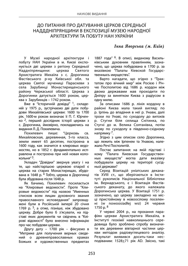 НАУКОВЕ ВИДАННЯ ДО ПИТАННЯ ПРО ДАТУВАННЯ ЦЕРКОВ СЕРЕДНЬОЇ НАДДДНІПРЯНЩИНИ В ЕКСПОЗИЦІЇ МУЗЕЮ НАРОДНОЇ АРХІТЕКТУРИ ТА ПОБУТУ НАН УКРАЇНИ ²ííà ßâîðñüêà (ì. Êè¿â) У Музеї народної архітект ури і побуту НАН України в м. Києві експо нується дві церкви з регіону Середньої Надд ніпр янщ ин и: церк ва Cвятого Архистратига Михаїла з с. Дорогинка Фастівського р-ну Київської обл. та церква Cвятої мучениці Параскеви з села Зарубинці Монастирищенського району Черкаської області. Церква з Дорогинки датується 1600 роком, цер ква з Зарубинців – 1742 роком. Вже в “Історичній довідці” 1, складе ній у 1975 р., зустрічаємо дві дати побу дови Михайлівської церкви: 1600 та 1700 рік. 1600-м роком визначає її П. Г. Юрчен ко 2, перший дослідник історії церкви з с. Дорогинка, ймовірно, покладаючись на видання Л. Д. Похилевича. Похилевич пише: “Церковь св. Михайловская, деревянная, 5-го класса, земли имеет 65 десятин, построена в 1600 году, как значится в клировых ведо мостях, но в 1852 г. фундаментально исп равлена и построена при ней новая коло кольня” 3. Укладач “Довідки” звернув увагу і на те, що найстарішою церквою єпархії є церква на старих Монастирищах, збудо вана в 1648 р. 4 Тобто, церква в Дорогинці була збудована після 1648 р. Як бачимо, Похилевич посилається на “Клировые ведомости”. Проте “Кли ровые ведомости” під назвою “Именных списков всем лицам духовного звания православного исповедания” запровад жені були в Російській імперії 20 січня 1769 р. 5, а отже, пізніше, ніж збудовано церкву. Добре було б з’ясувати, на під ставі яких документів чи свідчень в “Клі рові відомості” було внесено інформацію про час побудови церкви. Другу дату – 1700 рік – фіксуємо в “Метрике для получения верных сведе ний о древнеправославных храмах Божьих и художественных предметах 1887 года” 6. В описі, виданому Василь ківським духовним правлінням, зазна чено, що церква побудована в 1700 р. за вказівкою “Палаты Кіевской Государс твенныхъ имуществъ”. Варто нагадати, що згідно з “Трак татом про вічний мир” між Росією і Річ чю Посполитою від 1686 р. кордон між двома державами мав проходити по Дніпру за винятком Києва з радіусом в одну милю. За описами 1686 р. лінія кордону в районі Києва мала такий вигляд: по р. Ірпінь до впадіння в неї р. Унави, далі трохи по Унаві, по суходолу до витоків р. Стугни біля селища Снітинка, по Стугні до м. Велика Солтанівка, потім знову по суходолу в південно-східному напрямку 7. Згідно з цим описом село Дорогинка, що лежить між Ірпенем та Унавою, нале жало Речі Посполитій. Постає запитання: на якій підставі і кому “Палата Киевская Государствен ных имуществ” могла дати вказівку побудувати церкву на території сусід ньої держави? Серед Візитацій уніатських декана тів ХVІІІ ст., що зберігаються в Інсти туті рукописів Національної Бібліотеки ім. Вернадського, є і Візитація Фастів ського деканат у, до якого належала Дорогинська церква. У Візитації 1751 р. зазначено, що церкву закладено на міс ці пристойному в новоос ілому поселен ні (w nowoosiadej wsi) 24 червня 1750 р. 8 У червні 2004 р., на прохання пара фіян церкви Архистратига Михаїла, в Інституті геохімії навколишнього сере довища було зроблено спробу визначи ти вік деревини вівтарної частини цер кви методом радіовуглецевого аналізу. Результат виявився досить-таки нес подіваним: 1528+71 рік AD. Звісно, такі 253 І. Яворська дані не є історично достовірними, про