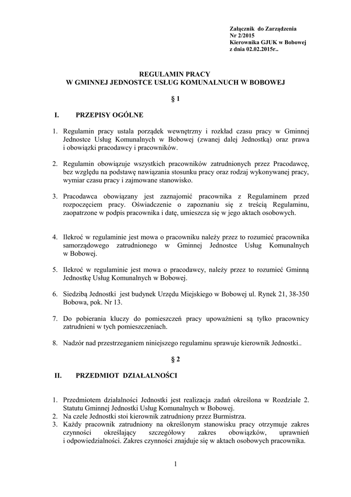 Załącznik do Zarządzenia Nr 2/2015 Kierownika GJUK w Bobowej z dnia 02.02.2015r.. REGULAMIN PRACY W GMINNEJ JEDNOSTCE USŁUG KOMUNALNUCH W BOBOWEJ §1 I. PRZEPISY OGÓLNE 1. Regulamin pracy ustala porządek wewnętrzny i rozkład czasu pracy w Gminnej Jednostce Usług Komunalnych w Bobowej (zwanej dalej Jednostką) oraz prawa i obowiązki pracodawcy i pracowników. 2. Regulamin obowiązuje wszystkich pracowników zatrudnionych przez Pracodawcę, bez względu na podstawę nawiązania stosunku pracy oraz rodzaj wykonywanej pracy, wymiar czasu pracy i zajmowane stanowisko. 3. Pracodawca obowiązany jest zaznajomić pracownika z Regulaminem przed rozpoczęciem pracy. Oświadczenie o zapoznaniu się z treścią Regulaminu, zaopatrzone w podpis pracownika i datę, umieszcza się w jego aktach osobowych. 4. Ilekroć w regulaminie jest mowa o pracowniku należy przez to rozumieć pracownika samorządowego zatrudnionego w Gminnej Jednostce Usług Komunalnych w Bobowej. 5. Ilekroć w regulaminie jest mowa o pracodawcy, należy przez to rozumieć Gminną Jednostkę Usług Komunalnych w Bobowej. 6. Siedzibą Jednostki jest budynek Urzędu Miejskiego w Bobowej ul. Rynek 21, 38-350 Bobowa, pok. Nr 13. 7. Do pobierania kluczy do pomieszczeń pracy upoważnieni są tylko pracownicy zatrudnieni w tych pomieszczeniach. 8. Nadzór nad przestrzeganiem niniejszego regulaminu sprawuje kierownik Jednostki.. §2 II. PRZEDMIOT DZIAŁALNOŚCI 1. Przedmiotem działalności Jednostki jest realizacja zadań określona w Rozdziale 2. Statutu Gminnej Jednostki Usług Komunalnych w Bobowej. 2. Na czele Jednostki stoi kierownik zatrudniony przez Burmistrza. 3. Każdy pracownik zatrudniony na określonym stanowisku pracy otrzymuje zakres czynności określający szczegółowy zakres obowiązków, uprawnień i odpowiedzialności. Zakres czynności znajduje się w aktach osobowych pracownika. 1 § 3 III. OBOWIĄZKI PRACODAWCY 1. Pracodawca powinien wykazywać troskę o poszanowanie osobistej godności pracownika, dbać o właściwą atmosferę wśród pracowników zachowując zasadę równomiernego obciążenia ich zadaniami. 2. Pracodawca obowiązany jest w szczególności: 1) organizować pracę w sposób zapewniający pełne i efektywne wykorzystanie czasu pracy, sprzyjać rozwijaniu inicjatyw i samodzielności pracowników w zakresie realizacji powierzonych zadań, 2) stosować efektywne i sprawiedliwe kryteria oceny pracy oraz wyników ich pracy, 3) ułatwić pracownikowi podnoszenie swoich kwalifikacji zawodowych. 3. Pracodawca ponosi odpowiedzialność za pracę podległego mu zespołu pracowników oraz dba o sprawne i terminowe załatwienie spraw w kierowanym przez siebie zespole. 4. Pracodawca powinien udzielać podległym mu pracownikom pomocy w wypełnianiu ich obowiązków służbowych. 5. Pracodawca obowiązany jest zapoznać nowo przyjętego pracownika z: 1) zakresem jego obowiązków służbowych, sposobem wykonywania pracy na wyznaczonym stanowisku, 2) z podstawowymi aktami prawnymi regulującymi działalność terenowych organów władzy i administracji samorządowej 3) przepisami prawnymi dotyczącymi odpowiedzialności za naruszenie tajemnicy państwowej i służbowej, 4) regulaminem organizacyjnym i wynagradzania Gminnej Jednostki Usług Komunalnych w Bobowej i statutem Jednostki. §4 IV. OBOWIĄZKI PRACOWNIKA 1. Do obowiązków pracownika Jednostki należy, w szczególności: 1) dbałość o wykonanie zadań zgodnie z przedmiotem działalności Jednostki 2) przestrzeganie przepisów prawa i zasad współżycia społecznego 3) wykonywanie zadań Jednostki, sumiennie, efektywnie, bezstronnie, sprawnie i rzetelnie. 4) przestrzeganie tajemnicy służbowej oraz innych tajemnic określonych w odrębnych przepisach jeżeli mają do nich dostęp na danym stanowisku 5) zachowanie uprzejmości i życzliwości w kontaktach ze zwierzchnikami, podwładnymi, współpracownikami, klientami 6) stałe podnoszenie umiejętności i kwalifikacje zawodowe, a w szczególności uczestniczyć w kursach i szkoleniach. 7) zachowanie się z godnością w miejscu pracy i poza nim. 2 8) stosowanie się do poleceń przełożonych, które dotyczą pracy i nie są sprzeczne z prawem lub aktem stanowiącym podstawę nawiązania stosunku pracy, 9) przestrzeganie ustalonego w Jednostce czasu pracy 10) Wykonywanie czynności przewidziane dla danego stanowiska zgodnie z zarządzeniami Kierownika Jednostki, poleceniami służbowymi zakresem czynności lub przydziałem zadań 11) dbanie o dobro Jednostki, chronienie jego mienia oraz używanie go zgodnie z przeznaczeniem, 2. Jeżeli wymagają tego potrzeby pracodawcy, może on powierzyć pracownikowi, na okres nie przekraczający 3 miesięcy w roku kalendarzowym, wykonywanie innej pracy niż określona w umowie o pracę, jeżeli nie powoduje to obniżenia wynagrodzenia i odpowiada kwalifikacjom pracownika. 3. Powierzenie obowiązków, o którym mowa w ust. 2, następuje na piśmie z podaniem potrzeby uzasadniającej powierzenie innej pracy i - o ile to możliwe - z wyprzedzeniem umożliwiającym pracownikowi przygotowanie się do pracy w nowym miejscu oraz nie może nosić znamion dyskryminacji czy mobbingu pracownika §5 V. CZAS PRACY 1. Czas pracy w Gminnej Jednostce Usług Komunalnych w Bobowej nie może przekraczać 40 godzin tygodniowo i 8 godzin na dobę. Pracownicy rozpoczynają pracę o godzinie 5.00 a kończą o godzinie 16.00. 2. Wymiar czasu pracy pracowników zatrudnionych w niepełnym wymiarze czasu pracy ustalają indywidualnie umowy o pracę. 3. Pracownikowi, którego dobowy wymiar czasu pracy wynosi co najmniej 6 godzin przysługuje 15 minutowa przerwa w pracy, wliczana do czasu pracy. 4. Każdy pracownik jest zobowiązany do punktualnego rozpoczynania pracy. Przyjście do pracy pracownicy potwierdzają podpisem na liście obecności . 5. Karty urlopowe oraz zwolnienia z pracy przekazuje się kierownikowi Jednostki. 6. Pracownik zobowiązany jest do zgłoszenia przełożon