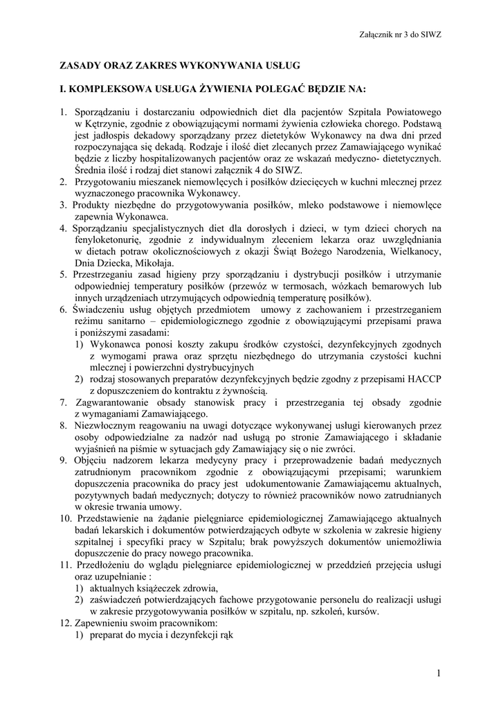 Załącznik nr 3 do SIWZ ZASADY ORAZ ZAKRES WYKONYWANIA USŁUG I. KOMPLEKSOWA USŁUGA ŻYWIENIA POLEGAĆ BĘDZIE NA: 1. Sporządzaniu i dostarczaniu odpowiednich diet dla pacjentów Szpitala Powiatowego w Kętrzynie, zgodnie z obowiązującymi normami żywienia człowieka chorego. Podstawą jest jadłospis dekadowy sporządzany przez dietetyków Wykonawcy na dwa dni przed rozpoczynająca się dekadą. Rodzaje i ilość diet zlecanych przez Zamawiającego wynikać będzie z liczby hospitalizowanych pacjentów oraz ze wskazań medyczno- dietetycznych. Średnia ilość i rodzaj diet stanowi załącznik 4 do SIWZ. 2. Przygotowaniu mieszanek niemowlęcych i posiłków dziecięcych w kuchni mlecznej przez wyznaczonego pracownika Wykonawcy. 3. Produkty niezbędne do przygotowywania posiłków, mleko podstawowe i niemowlęce zapewnia Wykonawca. 4. Sporządzaniu specjalistycznych diet dla dorosłych i dzieci, w tym dzieci chorych na fenyloketonurię, zgodnie z indywidualnym zleceniem lekarza oraz uwzględniania w dietach potraw okolicznościowych z okazji Świąt Bożego Narodzenia, Wielkanocy, Dnia Dziecka, Mikołaja. 5. Przestrzeganiu zasad higieny przy sporządzaniu i dystrybucji posiłków i utrzymanie odpowiedniej temperatury posiłków (przewóz w termosach, wózkach bemarowych lub innych urządzeniach utrzymujących odpowiednią temperaturę posiłków). 6. Świadczeniu usług objętych przedmiotem umowy z zachowaniem i przestrzeganiem reżimu sanitarno – epidemiologicznego zgodnie z obowiązującymi przepisami prawa i poniższymi zasadami: 1) Wykonawca ponosi koszty zakupu środków czystości, dezynfekcyjnych zgodnych z wymogami prawa oraz sprzętu niezbędnego do utrzymania czystości kuchni mlecznej i powierzchni dystrybucyjnych 2) rodzaj stosowanych preparatów dezynfekcyjnych będzie zgodny z przepisami HACCP z dopuszczeniem do kontraktu z żywnością. 7. Zagwarantowanie obsady stanowisk pracy i przestrzegania tej obsady zgodnie z wymaganiami Zamawiającego. 8. Niezwłocznym reagowaniu na uwagi dotyczące wykonywanej usługi kierowanych przez osoby odpowiedzialne za nadzór nad usługą po stronie Zamawiającego i składanie wyjaśnień na piśmie w sytuacjach gdy Zamawiający się o nie zwróci. 9. Objęciu nadzorem lekarza medycyny pracy i przeprowadzenie badań medycznych zatrudnionym pracownikom zgodnie z obowiązującymi przepisami; warunkiem dopuszczenia pracownika do pracy jest udokumentowanie Zamawiającemu aktualnych, pozytywnych badań medycznych; dotyczy to również pracowników nowo zatrudnianych w okresie trwania umowy. 10. Przedstawienie na żądanie pielęgniarce epidemiologicznej Zamawiającego aktualnych badań lekarskich i dokumentów potwierdzających odbyte w szkolenia w zakresie higieny szpitalnej i specyfiki pracy w Szpitalu; brak powyższych dokumentów uniemożliwia dopuszczenie do pracy nowego pracownika. 11. Przedłożeniu do wglądu pielęgniarce epidemiologicznej w przeddzień przejęcia usługi oraz uzupełnianie : 1) aktualnych książeczek zdrowia, 2) zaświadczeń potwierdzających fachowe przygotowanie personelu do realizacji usługi w zakresie przygotowywania posiłków w szpitalu, np. szkoleń, kursów. 12. Zapewnieniu swoim pracownikom: 1) preparat do mycia i dezynfekcji rąk 1 Załącznik nr 3 do SIWZ 2) ręczników jednorazowego użytku i papieru toaletowego, 3) środków ochrony osobistej (rękawiczki, fartuchy jednorazowe, okulary ochronne), 4) zunifikowanej odzieży roboczej i obuwia dla pracowników na każdym stanowisku pracy, 5) szafek BHP na odzież (osobista / robocza), 6) utrzymania w czystości odzieży roboczej 13. Zobowiązaniu zatrudnionych pracowników do: 1) zachowania tajemnicy zawodowej na temat wszystkich zdarzeń w związku z wykonywaniem pracy w szpitalu (zachowanie tajemnicy obowiązuje także po zakończeniu pracy na terenie szpitala), 2) poszanowaniu godności pacjentów, 3) zwrotu kierownikowi komórki organizacyjnej Zamawiającego wszystkich przedmiotów znalezionych w pomieszczeniach szpitalnych, 4) przestrzegania zasad higieny osobistej i estetycznego wyglądu, 14. Wykonawca ponosi odpowiedzialność za: 1) niewykonanie lub nienależyte wykonanie prac objętych przedmiotem zamówienia, 2) utrzymaniu w czystości narzędzi, urządzeń, wózków transportowych i pomieszczeń wykorzystywanych podczas realizacji usługi, 3) szkody w mieniu i na osobach powstałe z jego winy w trakcie wykonywania przedmiotu umowy, 4) nieprzestrzeganie przepisów sanitarno – epidemiologicznych, bhp, p/poż., 15. Ponoszenie kosztów mandatów za nieprzestrzeganie przepisów nakładanych przez zewnętrzne instytucje kontrolujące np. Państwową Inspekcję Sanitarną, Inspekcję Pracy. 16. Zapewnienie deratyzacji i dezynfekcji 17. Realizacja zaleceń Stacji Sanitarno – Epidemiologicznej, Państwowej Inspekcji Pracy, służb p/pożarowych oraz zaleceń służb kontroli wewnętrznej. 18. Pokrywanie kosztów zaleceń pokontrolnych wynikających z bieżącej ekpsolatacji urządzeń wyposażenia kuchni mlecznej i zmywalni. 19. Sprawowanie bieżącego nadzoru nad pracą peresonelu przez pracownika posiadającego kwalifikacje, które mają zastosowanie przy udzielaniu w/w świadczeń oraz posiadającego, doświadczenie zawodowe w żywieniu w placówkach służby zdrowia. 20. Ponoszenie kosztów eksploatacyjnych zgodnie z załączoną umową dzierżawy, stanowiącą zał. nr 9 do specyfikacji istotnych warunków zamówienia. 21. Dokonanie opomiarowania mediów- energia elektryczna, woda. 22. Centralnym zmywaniu naczyń, termosów oraz wózków w celu zachowania reżimu sanitarno-higienicznego. 23. Odbiorze, przechowywaniu i utylizacji we własnym zakresie resztek pokonsumpcyjnych, naczyń jednorazowego użytku i odpadów komunalnych 24. Utrzymaniu w czystości Punktu Żywieniowego i Kuchni Mlecznej, sprzętu, urządzeń, naczyń zastawy stołowej, butelek dla dzieci i niemowląt itp. 25. Pełnym wyżywieniu pacjentów polegającym na przygotowa