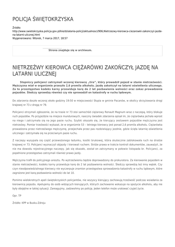 POLICJA ŚWIĘTOKRZYSKA Źródło: http://www.swietokrzyska.policja.gov.pl/kie/dzialania-policji/aktualnosci/906,Nietrzezwy-kierowca-ciezarowki-zakonczyl-jazdena-latarni-ulicznej.html Wygenerowano: Wtorek, 7 marca 2017, 18:57 Strona znajduje się w archiwum. NIETRZEŹWY KIEROWCA CIĘŻARÓWKI ZAKOŃCZYŁ JAZDĘ NA LATARNI ULICZNEJ Stopniccy policjanci zatrzymali wczoraj kierowcę „tira”, który prowadził pojazd w stanie nietrzeźwości. Mężczyzna miał w organizmie przeszło 2,6 promila alkoholu. Jazdę zakończył na latarni oświetlenia ulicznego. Za to przestępstwo kodeks karny przewiduje karę do 2 lat pozbawienia wolności oraz zakaz prowadzenia pojazdów. Śledczy sprawdzą również czy nie sprowadził on katastrofy w ruchu lądowym. Do zdarzenia doszło wczoraj około godziny 19:50 w miejscowości Słupia w gminie Pacanów, w okolicy skrzyżowania drogi krajowej nr 73 z drogą nr 79. Policjanci otrzymali zgłoszenie, że na trasie nr 73 stoi samochód ciężarowy Renault Magnum wraz z naczepą, który blokuje ruch pojazdów. Po przyjeździe na miejsce mundurowych, naoczny świadek zdarzenia opisał im, że ciężarówka jechała wprost na niego i zatrzymała się na jego pasie ruchu. Szybki okazało się, że kierujący zestawem pojazdów mężczyzna jest nietrzeźwy. Pomiar trzeźwości wykazał, że w organizmie 53 – letniego kierowcy jest ponad 2,6 promila alkoholu. Ciężarówka prowadzona przez nietrzeźwego mężczyznę, przejechała przez pas rozdzielający jezdnie, gdzie ścięła latarnię oświetlenia ulicznego i zatrzymała się na przeciwnym pasie ruchu. Z naczepy wysypała się część przewożonego ładunku, kostki brukowej, która skutecznie zablokowała ruch na drodze krajowej nr 73. Policjanci wyznaczyli objazdy i kierowali ruchem. Stróże prawa w trakcie kontroli dokumentów, zauważyli, że nie ma dowodu rejestracyjnego naczepy. Jak się okazało, został on zatrzymany w połowie listopada br. Policjanci, za popełnione przestępstwo zatrzymali również prawo jazdy. Mężczyzna trafił do policyjnego aresztu. Po wytrzeźwieniu będzie doprowadzony do prokuratora. Za kierowanie pojazdem w stanie nietrzeźwości, kodeks karny przewiduje karę do 2 lat pozbawienia wolności. Śledczy sprawdzą też inny wątek. Czy czyn nieodpowiedzialnego kierowcy nie wyczerpuje znamion przestępstwa sprowadzenia katastrofy w ruchu lądowym, które zagrożone jest karą pozbawienia wolności do lat 10. Pomimo wielokrotnych apeli świętokrzyskich policjantów, nie wszyscy kierujący zachowują trzeźwość podczas wsiadania za kierownicę pojazdu. Apelujemy do osób widzących kierujących, których zachowanie wskazuje na spożycie alkoholu, aby nie były obojętne w takiej sytuacji. Zareagujmy, zadzwońmy po policję. Jeden telefon może uratować czyjeś życie. Opr. TP Źródło: KPP w Busku-Zdroju Ocena: 0/5 (0) Tweetnij