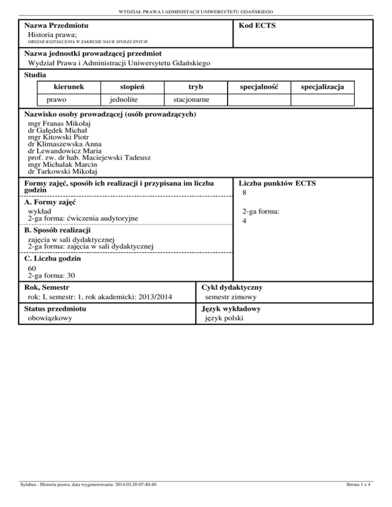 WYDZIAŁ PRAWA I ADMINISTACJI UNIWERSYTETU GDAŃSKIEGO Nazwa Przedmiotu Historia Historia prawa; prawa; Kod ECTS OBSZAR KSZTAŁCENIA W ZAKRESIE NAUK SPOŁECZNYCH Nazwa jednostki prowadzącej przedmiot Wydział Prawa i Administracji Uniwersytetu Gdańskiego Studia kierunek prawo prawo stopień jednolite jednolite tryb stacjonarne stacjonarne Nazwisko osoby prowadzącej (osób prowadzących) mgr Franas Mikołaj dr Gałędek Michał mgr Kitowski Piotr dr Klimaszewska Anna dr Lewandowicz Maria prof. zw. dr hab. Maciejewski Tadeusz mgr Michalak Marcin dr Tarkowski Mikołaj Formy godzin Formy zajęć, zajęć, sposób sposób ich ich realizacji realizacji ii przypisana przypisana im im liczba liczba godzin A. Formy zajęć wykład 2-ga forma: ćwiczenia audytoryjne wykład 2-ga forma: ćwiczenia audytoryjne B. Sposób realizacji zajęcia w dydaktycznej 2-ga forma: w sali dydaktycznej zajęcia w sali salizajęcia dydaktycznej 2-ga forma: zajęcia w sali dydaktycznej specjalność specjalizacja Liczba punktów ECTS 8 2-ga forma: 4 C. Liczba godzin 60 2-ga forma: 30 60 2-ga forma: 30 Rok, Semestr rok: I, semestr: 1, rok akademicki: 2013/2014 Cykl dydaktyczny semestr zimowy Status przedmiotu obowiązkowy Język wykładowy język polski Sylabus - Historia prawa, data wygenerowania: 2014.03.20 07:40:40 Strona 1 z 4 WYDZIAŁ PRAWA I ADMINISTACJI UNIWERSYTETU GDAŃSKIEGO Metody dydaktyczne wykład, wykład z prezentacją multimedialną 2-ga forma: ćwiczenia audytoryjne: analiza tekstów z dyskusją, ćwiczenia audytoryjne: analiza zdarzeń krytycznych (przypadków), ćwiczenia audytoryjne: dyskusja, ćwiczenia audytoryjne: metoda projektów (projekt badawczy, wdrożeniowy, praktyczny), ćwiczenia audytoryjne: praca w grupach, wykład, wykład konwersatoryjny, wykład problemowy Forma i sposób zaliczenia oraz podstawowe kryteria oceny lub wymagania egzaminacyjne A. Sposób zaliczenia egzamin 2-ga forma: zaliczenie z oceną B. Formy zaliczenia egzamin pisemny: dłuzsza wypowiedź pisemna (rozwiazanie problemu), wykonanie określonej pracy praktycznej, wykonanie pracy zaliczeniowej: przygotowanie projektu lub prezentacji, zaliczenie ustne C. Podstawowe kryteria Opanowaną wiedzę i umiejętności ocenia się wg. par. 4 ust. 1 Regulaminu Studiów UG (uchwała Senatu nr 4/07 z 22.02.2007 r., ze zmianami): a)bdb (5,0) - powyżej 90% wiedzy; b) db plus (4,5) - powyżej 80% wiedzy; c)db (4,0) - powyżej 70% wiedzy; d) dst plus (3,5) - powyżej 60% wiedzy; e) dst Określenie przedmiotów wprowadzających wraz z wymogami wstępnymi A. Wymagania formalne Brak. B. Wymagania wstępne Brak. Cele przedmiotu Zapewnienie studentowi wiedzy o źródłach i instytucjach historii prawa publicznego, począwszy od średniowiecza kończąc na czasach współczesnych, oraz o źródłach i instytucjach w zakresie historii prawa sądowego, w tym samym okresie czasu. Sylabus - Historia prawa, data wygenerowania: 2014.03.20 07:40:40 Strona 2 z 4 WYDZIAŁ PRAWA I ADMINISTACJI UNIWERSYTETU GDAŃSKIEGO Treści programowe Program przedmiotu zakłada przedstawienie I. Historii prawa publicznego: 1. ustrój państw protofeudalnych (germańskich i słowiańskich), w tym społeczno-gospodarczy, polityczny oraz wymiar sprawiedliwości; 2. jednolitej monarchii feudalnej w tym samym zakresie (w tym polskiej monarchii patrymonialnej); 3. rozdrobnionej monarchii feudalnej w tym samym zakresie; 4. monarchii stanowej (zakres identyczny, w tym polskiej monarchii stanowej, lata 1320-1454); 5. Rzeczpospolitej szlacheckiej (lata 1454-1764); 6. monarchii absolutnych; 7. republik wczesno nowożytnych; 8. zagadnień ogólnych konstytucjonalizmu; 9. liberalno-demokratycznych monarchii konstytucyjnych (w tym monarchii kształtowania się monarchii konstytucyjnej okresu stanisławowskiego); 10. monarchii postabsolutnych w XIX w.; 11. reżimów autorytarnych i totalitarnych pierwszej połowy XX w.; 12. ustroju ziem polskich pod zaborami; 13. ustroju II Rzeczpospolitej. II. Historii prawa sądowego: 1. Średniowiecze: a) Źródła prawa; b) Prawo prywatne; c) Prawo karne; d) Postępowanie sądowe; 2. Czasy wczesnonowożytne: a) Źródła prawa; b) Prawo prywatne; c) Prawo karne; d) Postępowanie cywilne; e) Postępowanie karne; 3. Czasy nowożytne: a) Zagadnienia kodyfikacji prawa; b) Prawo prywatne; c) Prawo karne; d) Postępowanie cywilne; e) Postępowanie karne. Wykaz literatury A. Literatura wymagana do ostatecznego zaliczenia zajęć (zdania egzaminu): A.1. wykorzystywana podczas zajęć Źródła prawa publicznego i sądowego zawarte w wydanych tekstach źródłowych do historii prawa. A.2. studiowana samodzielnie przez studenta 1. T. Maciejewski, Historia powszechna ustroju i prawa, Warszawa 2011, wyd. 4; 2. T. Maciejewski, Leksykon historii prawa i ustroju. 100 podstawowych pojęć, Warszawa 2010; 3. T. Maciejewski, Historia ustroju i prawa sądowego Polski, Warszawa 2011, wyd. 4. B. Literatura uzupełniająca 1. J. Bardach, B. Leśnodorski, M. Pietrzak, Historia ustroju i prawa polskiego, Warszawa 1994; 2. K. Sójka-Zielińska, Historia prawa, Warszawa 2011, wyd. 14; 3. K. Kamińska, A. Gaca, Powszechna historia ustrojów państwowych, Toruń 2011, wyd. 2; 4. M. Wąsowicz, Historia ustroju państw Zachodu, Warszawa 2011, wyd. 3. Sylabus - Historia prawa, data wygenerowania: 2014.03.20 07:40:40 Strona 3 z 4 WYDZIAŁ PRAWA I ADMINISTACJI UNIWERSYTETU GDAŃSKIEGO Efekty uczenia się Wiedza Student zna: 1. istotę rozwoju historii prawa publicznego i sądowego na przestrzeni dziejów, 2. źródła prawa od średniowiecza do czasów współczesnych, 3. prawno-porównawcze aspekty ewolucji prawa w czasie, 4. ustrój i prawa obowiązujące obecnie, oparte na wcześniejszych konstytucjach i kodeksach, 5. wybrane instytucje. Umiejętności Student potrafi: kwalifikować różne formy historii prawa publicznego i sądowego na przestrzeni dziejów, 2. dokonać za pomocą metody prawno-porównawczej ewolucyjnego rozwoju prawa światowego, 3. zastosować pod