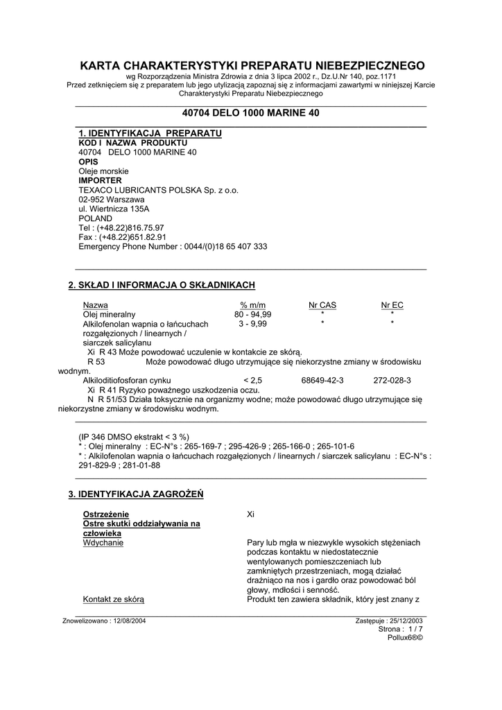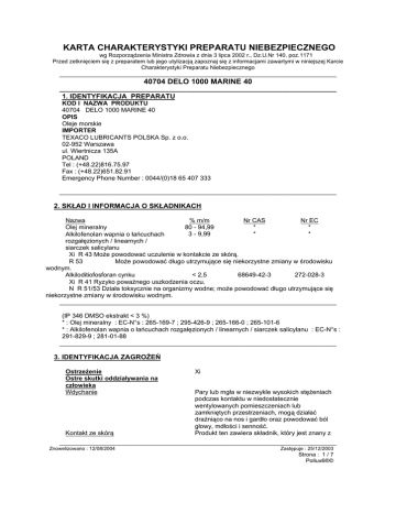 KARTA CHARAKTERYSTYKI PREPARATU NIEBEZPIECZNEGO wg Rozporządzenia Ministra Zdrowia z dnia 3 lipca 2002 r., Dz.U.Nr 140, poz.1171 Przed zetknięciem się z preparatem lub jego utylizacją zapoznaj się z informacjami zawartymi w niniejszej Karcie Charakterystyki Preparatu Niebezpiecznego _____________________________________________________________________________ 40704 DELO 1000 MARINE 40 _____________________________________________________________________________ 1. IDENTYFIKACJA PREPARATU KOD I NAZWA PRODUKTU 40704 DELO 1000 MARINE 40 OPIS Oleje morskie IMPORTER TEXACO LUBRICANTS POLSKA Sp. z o.o. 02-952 Warszawa ul. Wiertnicza 135A POLAND Tel : (+48.22)816.75.97 Fax : (+48.22)651.82.91 Emergency Phone Number : 0044/(0)18 65 407 333 _____________________________________________________________________________ 2. SKŁAD I INFORMACJA O SKŁADNIKACH Nazwa % m/m Nr CAS Nr EC Olej mineralny 80 - 94,99 * * 3 - 9,99 * * Alkilofenolan wapnia o łańcuchach rozgałęzionych / linearnych / siarczek salicylanu Xi R 43 Może powodować uczulenie w kontakcie ze skórą. R 53 Może powodować długo utrzymujące się niekorzystne zmiany w środowisku wodnym. Alkiloditiofosforan cynku < 2,5 68649-42-3 272-028-3 Xi R 41 Ryzyko poważnego uszkodzenia oczu. N R 51/53 Działa toksycznie na organizmy wodne; może powodować długo utrzymujące się niekorzystne zmiany w środowisku wodnym. _____________________________________________________________________________ (IP 346 DMSO ekstrakt < 3 %) * : Olej mineralny : EC-N°s : 265-169-7 ; 295-426-9 ; 265-166-0 ; 265-101-6 * : Alkilofenolan wapnia o łańcuchach rozgałęzionych / linearnych / siarczek salicylanu : EC-N°s : 291-829-9 ; 281-01-88 _____________________________________________________________________________ 3. IDENTYFIKACJA ZAGROŻEŃ Ostrzeżenie Ostre skutki oddziaływania na człowieka Wdychanie Kontakt ze skórą Xi Pary lub mgła w niezwykle wysokich stężeniach podczas kontaktu w niedostatecznie wentylowanych pomieszczeniach lub zamkniętych przestrzeniach, mogą działać drażniąco na nos i gardło oraz powodować ból głowy, mdłości i senność. Produkt ten zawiera składnik, który jest znany z _____________________________________________________________________________ Znowelizowano : 12/08/2004 Zastępuje : 25/12/2003 Strona : 1 / 7 Pollux6®© KARTA CHARAKTERYSTYKI PREPARATU NIEBEZPIECZNEGO wg Rozporządzenia Ministra Zdrowia z dnia 3 lipca 2002 r., Dz.U.Nr 140, poz.1171 Przed zetknięciem się z preparatem lub jego utylizacją zapoznaj się z informacjami zawartymi w niniejszej Karcie Charakterystyki Preparatu Niebezpiecznego _____________________________________________________________________________ 40704 DELO 1000 MARINE 40 _____________________________________________________________________________ potencjalnego uczulającego działania na skórę ludzką. Przedłużający i powtarzający się kontakt z tym produktem może powodować alergiczną reakcję skórną u narażonych, wrażliwych osób. Może powodować nieznaczne podrażnienie, Kontakt z oczami doświadczane jako czasowy dyskomfort. Żadne ujemne oddziaływania nie są Spożycie oczekiwane. Jeśli zostanie połknięty więcej niż jeden łyk mogą wystąpić kłopoty brzuszne, mdłości i biegunka. Przewlekłe skutki oddziaływania na człowieka Z powodu właściwości odtłuszczających, Pogorszenie stanu zdrowia wskutek oddziaływania przedłużający się i powtarzający się kontakt ze skórą może pogorszyć istniejący stan zapalny skóry ( stan skóry). Skutki oddziaływania na Może tworzyć film olejowy, powodujący środowisko niedobór tlenu w wodzie, przez co może zagrażać życiu w wodzie. _____________________________________________________________________________ 4. PIERWSZA POMOC Drogi narażenia Wdychanie Jeśli wystąpią: podrażnienie, ból głowy, mdłości lub zawroty głowy, wyprowadzić na świeże powietrze. Zapewnić opiekę medyczną Jeśli wystąpią trudności w oddychaniu lub symptomy będą się utrzymywać. Kontakt ze skórą Umyć skórę dużą ilością wody z mydłem dopóki wszystkie żlady produktu nie zostaną usunięte. Zdjąć i umyć zanieczyszczone ubranie i buty. Zapewnić opiekę medyczną Jeśli podrażnienie skóry utrzymuje się lub kontakt ze skórą przedłuża się. Płukać oczy dużą ilością wody przez kilka Kontakt z oczami minut. Zapewnić opiekę medyczną Jeśli podrażnienie oka utrzymuje się. Nie wywoływać wymiotów. Zapewnić opiekę Spożycie medyczną. Nie podawać nigdy nic doustnie osobie nieprzytomnej lub w konwulsjach. _____________________________________________________________________________ 5. POSTĘPOWANIE W PRZYPADKU POŻARU Właściwe środki gaśnicze Stosować mgłę wodną, suchy proszek, pianę lub dwutlenek węgla. Wodą chłodzić opakowania narażone na pożar. Jeśli rozlanie nie uległo zapaleniu stosować mgłę wodną do _____________________________________________________________________________ Znowelizowano : 12/08/2004 Zastępuje : 25/12/2003 Strona : 2 / 7 Pollux6®© KARTA CHARAKTERYSTYKI PREPARATU NIEBEZPIECZNEGO wg Rozporządzenia Ministra Zdrowia z dnia 3 lipca 2002 r., Dz.U.Nr 140, poz.1171 Przed zetknięciem się z preparatem lub jego utylizacją zapoznaj się z informacjami zawartymi w niniejszej Karcie Charakterystyki Preparatu Niebezpiecznego _____________________________________________________________________________ 40704 DELO 1000 MARINE 40 _____________________________________________________________________________ rozproszenia par i zabezpieczenia ludzi próbujących zatrzymać przeciek. Strumień wody środki gaśnicze, których nie wolno używać ze względów bezpieczeństwa Szczególne zagrożenia związane z narażeniem wynikającym z właściwości samej substancji, produktów spalania, powstających Brak gazów Rodzaj stosowanych środków ochronnych środki ochrony indywidualnej dla strażaków będzie zależeć od wielkości poża