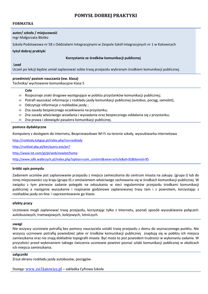 POMYSŁ DOBREJ PRAKTYKI FORMATKA autor/ szkoła / miejscowość mgr Małgorzata Blotko Szkoła Podstawowa nr 58 z Oddziałami Integracyjnymi w Zespole Szkół Integracyjnych nr 1 w Katowicach tytuł dobrej praktyki Korzystanie ze środków komunikacji publicznej Lead Uczeń po lekcji będzie umiał zaplanować sobie trasę przejazdu wybranym środkiem komunikacji publicznej. przedmiot/ poziom nauczania (ew. klasa) Technika/ wychowanie komunikacyjne klasa 5 • • • • • • Cele Rozpoznaje znaki drogowe występujące w pobliżu przystanków komunikacji publicznej; Potrafi wyszukać informacje z rozkładu jazdy komunikacji publicznej (autobus, pociąg, samolot); Odczytuje informacje z rozkładów jazdy ; Zna zasady bezpiecznego oczekiwania na przystanku; Zna zasady właściwego wsiadania i wysiadania oraz bezpiecznego oddalania się z przystanku; Zna prawa i obowiązki pasażera komunikacji publicznej. pomoce dydaktyczne Komputery z dostępem do Internetu, Bezprzewodowe WI Fi na terenie szkoły, wyszukiwarka internetowa http://rozklady.kzkgop.pl/index.php?co=rozklady http://rozklad-pkp.pl/bin/query.exe/pn? http://www.lot.com/pl/pl/web/newlot/home http://www.zdik.walbrzych.pl/index.php?option=com_content&view=article&id=92&Itemid=95 krótki opis pomysłu Zadaniem uczniów jest zaplanowanie przejazdu z miejsca zamieszkania do centrum miasta na zakupy. (grupa I) lub do innej miejscowości czy kraju (grupa II) z omówieniem właściwego zachowania się w środkach komunikacji publicznej. W związku z tym pierwsze zadanie polegało na odszukaniu w sieci regulaminów przejazdu środkami komunikacji publicznej a następnie wyszukanie i rozpisanie godzinowe zaplanowanej trasy tam i z powrotem, korzystając z rozkładów jazdy on-line. I zaprezentowanie go klasie. efekty pracy Uczniowie mogli zaplanować trasę przejazdu, korzystając tylko z Internetu, poznali sposób wyszukiwania połączeń: autobusowych, tramwajowych, kolejowych, lotniczych. uwagi Nie wszyscy uczniowie potrafią bez pomocy nauczyciela ustalić trasę przejazdu z domu do wyznaczonego punktu. Nie wszyscy uczniowie potrafią powiedzieć jakie nr środków komunikacji publicznej znajdują się w pobliżu ich miejsca zamieszkania oraz nie znają dokładnie topografii miasta. Być może to jest powodem trudności w wykonaniu zadania. W przyszłości przed wykonaniem takiego ćwiczenia uczniowie powinni poznać szlaki komunikacji publicznej w okolicach ich miejsca zamieszkania. załączniki Zrzut ekranu rozkładu jazdy autobusów, pociągów. Dostęp: www.zsi1katowice.pl – zakładka Cyfrowa Szkoła
