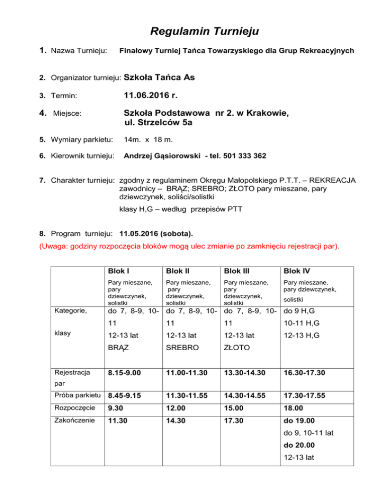 Regulamin Turnieju Finałowy Turniej Tańca Towarzyskiego dla Grup Rekreacyjnych 1. Nazwa Turnieju: 2. Organizator turnieju: Szkoła Tańca As 3. Termin: 11.06.2016 r. 4. Miejsce: Szkoła Podstawowa nr 2. w Krakowie, ul. Strzelców 5a 5. Wymiary parkietu: 14m. x 18 m. 6. Kierownik turnieju: Andrzej Gąsiorowski - tel. 501 333 362 7. Charakter turnieju: zgodny z regulaminem Okręgu Małopolskiego P.T.T. – REKREACJA zawodnicy – BRĄZ; SREBRO; ZŁOTO pary mieszane, pary dziewczynek, soliści/solistki klasy H,G – według przepisów PTT 8. Program turnieju: 11.05.2016 (sobota). (Uwaga: godziny rozpoczęcia bloków mogą ulec zmianie po zamknięciu rejestracji par). Kategorie, Blok I Blok II Blok III Blok IV Pary mieszane, pary dziewczynek, solistki Pary mieszane, pary dziewczynek, solistki Pary mieszane, pary dziewczynek, solistki Pary mieszane, pary dziewczynek, solistki do 7, 8-9, 10- do 7, 8-9, 10- do 7, 8-9, 10- do 9 H,G 11 11 11 10-11 H,G 12-13 lat 12-13 lat 12-13 lat 12-13 H,G BRĄZ SREBRO ZŁOTO 8.15-9.00 11.00-11.30 13.30-14.30 16.30-17.30 Próba parkietu 8.45-9.15 11.30-11.55 14.30-14.55 17.30-17.55 Rozpoczęcie 9.30 12.00 15.00 18.00 Zakończenie 11.30 14.30 17.30 do 19.00 klasy Rejestracja par do 9, 10-11 lat do 20.00 12-13 lat 9. Skład Komisji Sędziowskiej Sędzia Główny: Maria Nowak I ,II, III blok Sędzia Główny: Agnieszka Gąsiorowska IV blok Andrzej Gąsiorowski Piotr Nawara Gabriel Skiba Instruktorzy zgodnie przepisami Okręg Małopolski PTT Piotr Górnikiewicz Dorota Thomas Instruktorzy i sędziowie sędziujący 1-3 kategorii Bohacki Adrian Filipczak Agnieszka Golc Jan Igielska Małgorzata Migacz Dariusz Mróz Kamil Myśliwiec Bogdan Ożóg Krzysztof Pletty-Zyznar Małgorzata Poślednik Dorota Putz Marek Skalski Marcin Smarzyński Tomasz Stasica Michał Szczęśniak Paweł Wiewiórka Małgorzata Wiśniewski Łukasz Turski Sławomir 10. Skład Komisji Skrutacyjnej Paweł Łyczko Artur Drąg Maryla Kowalik 11. Termin zgłoszenia par: BRĄZ, SREBRO, ZŁOTO do 6.06.2016 [email protected], [email protected] Klasy H,G zgłoszenie przez CBD do 9.06.2016 12. Warunki uczestnictwa w turnieju zgodnie z Przepisami Okręgu Małopolskiego PTT – REKREACJA oraz klasy H,G zgodnie z przepisami PTT wniesie opłatę startowa w wysokości: 15 zł. od osoby bilety wstępu w wysokości: 15 zł. od osoby; 5 zł. bilet szkolny, dzieci-widzowie do 6 lat wstęp gratis. 13. Dodatkowe informacje Organizatora: Bufet: całodzienny Opieka medyczna: lekarz medycyny Stoisko: Gabriel Skiba 14. Nagrody medale, dyplomy, upominki 15. Wszelkie sprawy sporne nie ujęte w niniejszym regulaminie rozstrzyga Kierownik Turnieju w porozumieniu z Sędzią Głównym. 16. Uwagi: pary przyjeżdżają na koszt własny lub instytucji delegującej, organizator nie ubezpiecza zawodników, organizator nie odpowiada za rzeczy pozostawione na terenie obiektu, organizatorzy nie wysyłają potwierdzeń. Serdecznie zapraszamy Andrzej i Agnieszka Gąsiorowscy
