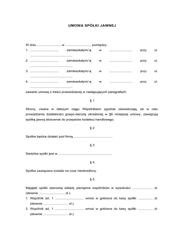 UMOWA SPÓŁKI JAWNEJ W dniu .......................... w ............................ pomiędzy: 1. ............................... zamieszkałym/-ą w ......................... przy ul. w ......................... przy ul. w ......................... przy ul. w ......................... przy ul. .............................................. 2. ............................... zamieszkałym/-ą .............................................. 3. ............................... zamieszkałym/-ą .............................................. 4. ............................... zamieszkałym/-ą .............................................. zawarto umowę o treści przewidzianej w następujących paragrafach: §1 Strony, zwane w dalszym ciągu Wspólnikami zgodnie oświadczają, że w celu prowadzenia działalności gospo-darczej określonej w §6 niniejszej umowy, zawiązują spółkę jawną stosownie do przepisów kodeksu handlowego. §2 Spółka będzie działać pod firmą .......................................... §3 Siedziba spółki jest w .......................................................... §4 Spółka zawiązana została na czas nieokreślony. §5 Majątek spółki stanowią wkłady pieniężne wspólników w wysokości ...................... zł. (słownie ............................ zł.). 1. Wspólnik ad. 1 ............................... wnosi w gotówce do kasy spółki ................ zł. (słownie ........................... zł.). 2. Wspólnik ad. 1 ............................... wnosi w gotówce do kasy spółki ................ zł. (słownie ........................... zł.). 3. Wspólnik ad. 1 ............................... wnosi w gotówce do kasy spółki ................ zł. (słownie ........................... zł.). 4. Wspólnik ad. 1 ............................... wnosi w gotówce do kasy spółki ................ zł. (słownie ........................... zł.). §6 Przedmiotem umowy spółki jest .......................................... §7 Każdy Wspólnik ma prawo reprezentować spółkę, z tym że do składania oświadczeń woli i podpisów w imieniu spółki uprawnieni są dwaj spośród Wspólników lub jeden z nich łącznie z prokurentem, co nie uchybia możliwości ustanowienia prokury samoistnej. §8 Za zaniechanie czynności odpowiedzialność ponoszą wszyscy Wspólnicy. Ale za czynności dokonane odpowie-dzialność ponoszą tylko ci wspólnicy, którzy brali w nich udział. §9 Każdy ze wspólników ma prawo i obowiązek do dokonywania wszelkich czynności w zakresie zwykłego zarządu majątkiem spółki, w tym do przyjmowania oświadczeń woli oraz kwitowania odbioru towarów. § 10 Udziały Wspólników w majątku spółki są równe. Również udziały w zyskach i stratach spółki są równe. § 11 Rok obrachunkowy spółki pokrywa się z rokiem kalenda-rzowym. § 12 Wszyscy wspólnicy są zobowiązani do świadczenia pracy na rzecz spółki, ze starannością wymaganą w sprawach danego rodzaju oraz do niepodejmowania innej pracy zarobkowej. Za świadczoną na rzecz spółki pracę wspól-nikom nie przysługuje wynagrodzenie. § 13 Środki pieniężne spółki umieszczone będą w Banku w ...................................................... na rachunku bieżącym spółki. Do dysponowania tym rachunkiem są upoważnieni wspólnicy spółki w taki sam sposób, jak do reprezento-wania spółki, o czym jest mowa w §7 niniejszej umowy. § 14 Wspólnikom nie wolno zajmować się interesami konkurencyjnymi. Nie wolno im też uczestniczyć w spółce konkurencyjnej w charakterze wspólników lub członków jej władz pod rygorem wydania pozostałym wspólnikom na rzecz spółki korzyści z działalności konkurencyjnej i odszkodowania. Wspólnicy mogą również zażądać ustą-pienia wspólnika, który przekroczył zakaz konkurencji. § 15 Stosunki wewnętrzne i zewnętrzne wspólnicy regulują zgodnie z podjętymi jednomyślnie uchwałami. W przypadku braku jednomyślności lub udziału w głosowaniu choćby tylko jednego ze wspólników, powzięta decyzja nie wiąże ani wspólnika, który nie brał udziału w głosowaniu lub głosował przeciw, ani spółki. § 16 Wszyscy wspólnicy łącznie zatrudniają pracowników w spółce oraz ustalają dla nich warunki pracy i płacy. Każdy ze wspólników jednak ma prawo jednoosobowo wypowiedzieć pracownikowi warunki pracy i płacy. § 17 Wspólnicy zobowiązani są proporcjonalnie do posiadanych udziałów do dokonywania dopłat w gotówce, jeśli okaże się to niezbędne dla dalszego funkcjonowania spółki, ewentu-alnie podjęcia działań zmierzających do pozyskania kredytu bankowego dla spółki. § 18 Wspólnicy odpowiadają solidarnie całym majątkiem i spółki za wszystkie zobowiązania spółki wobec osób trzecich. § 19 Bilans spółki należy sporządzać zgodnie z wymogami księgowości najpóźniej na koniec I kwartału po upływie roku obrotowego. Zyski do podziału wynikające z bilansu powinny być wypłacone wspólnikom bez osobnej zatwierdzającej bilans uchwały. Przy czym ................... % z czystego zysku spółki należy co roku przeznaczyć na jej fundusz rezerwowy. § 20 Zysk przypadający wspólnikowi nie podjęty przez nikogo w ciągu roku obrotowego przypada spółce, nie powiększając udziału wspólników. Jeśli jednak udział został zmniejszony wskutek strat w stosunku do swej pierwotnej wysokości, wówczas zysk należy przeznaczyć na jego uzupełnienie. § 21 Udziały wspólników nie są oprocentowane. Natomiast wszelkie wkłady, pożyczki lub kredyty udzielane spółce przez wspólników są oprocentowane, na taki procent, jak kwoty pochodzące od osób trzecich. § 22 Bezskuteczne wobec spółki są: 1. przelewy na osoby trzecie dokonane przez wspólników czy w części, czy w całości oraz przekazywanie praw wynikających z umowy spółki - z wyjątkiem prawa skuteczności roszczeń wobec spółki - o ile następuje to bez zgod