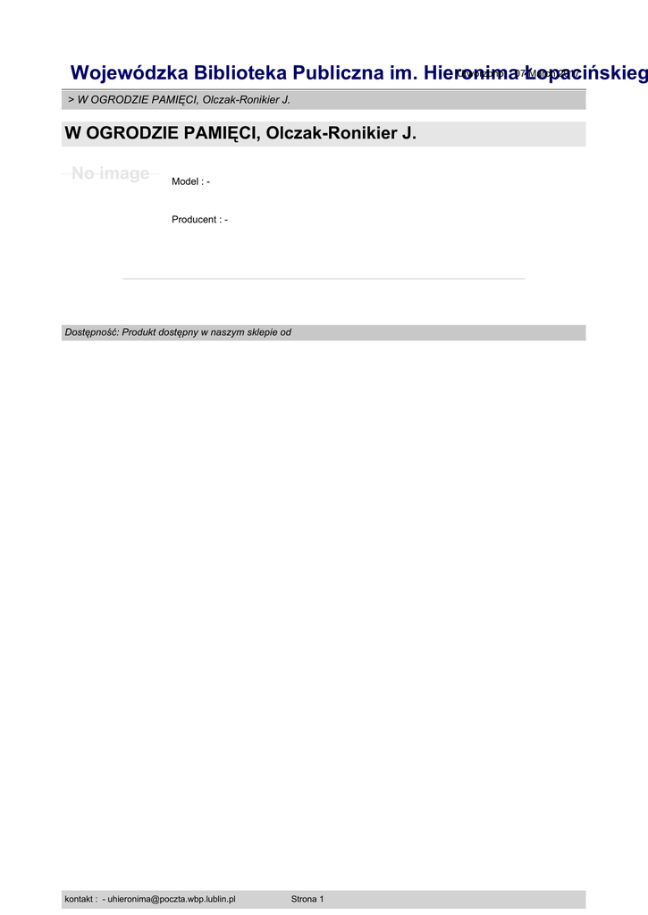 Utworzono : 07Łopacińskieg March 2017 Wojewódzka Biblioteka Publiczna im. Hieronima > W OGRODZIE PAMIĘCI, Olczak-Ronikier J. W OGRODZIE PAMIĘCI, Olczak-Ronikier J. No image Model : - Producent : - Dostępność: Produkt dostępny w naszym sklepie od kontakt : - [email protected] Strona 1
