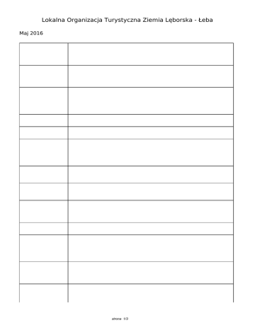 Lokalna Organizacja Turystyczna Ziemia Lęborska - Łeba Maj 2016 1 maja XIV OTWARTY RAJD TURYSTYCZNY CYKLISTÓW JESTE?MY W UNII – impreza sportowa; start na dziedzi?cu Starostwa Powiatowego w L?borku; udzia? bezp?atny (Starostwo Powiatowe w L?borku, Gminny O?rodek Kultury w Nowej Wsi L?borskiej) 2 maja ?WI?TO FLAGI RZECZYPOSPOLITEJ POLSKIEJ – uroczyste podniesienie flagi, wyst?pienie Starosty L?borskiego, kola? s?owno-muzyczny w wykonaniu MDK L?bork, koncert melodii patriotycznych w wykonaniu Orkiestry D?tej Ziemia L?borska; dziedziniec Starostwa Powiatowego w L?borku (Starostwo Powiatowe w L?borku) 3 maja OBCHODY ROCZNICY UCHWALENIA KONSTYTUCJI 3 MAJA – uroczysto?? patriotyczna; msza ?w. w Sanktuarium ?w. Jakuba Ap., przemarsz pod Obelisk Niepodleg?o?ci (Urz?d Miejski w L?borku, Centrum Sportu i Rekreacji w L?borku) L?BORSKA MAJÓWKA – festyn plenerowy; wst?p wolny; park przy Starostwie Powiatowym w L?borku (Centrum Sportu i Rekreacji w L?borku) MAJOWY TURNIEJ PI?KI NO?NEJ – boisko ze sztuczn? nawierzchni? przy Gimnazjum nr 2 (Centrum Sportu i Rekreacji w L?borku) 14 maja W RAMACH MAJÓWKI WILKOWSKIEJ RAJD NORDIC WALKING PARK NOWA WIE? L?BORSKA – w?drówka tras? Obliwice – Wilkowo – Obliwice, 8,2 km, czas przej?cia ok. 1 godz. 30 min.; miejsce rekreacyjne GOK-u (Rada So?ecka Wilkowo, Gminny O?rodek Kultury w Nowej Wsi L?borskiej) (1800 – 22 NOC MUZEÓW – impreza cykliczna; bezp?atne udost?pnianie zwiedzaj?cym ekspozycji muzealnych w budynku Muzeum w L?borku oraz basztach nr 24 i 27 (Muzeum w L?borku, L?borskie Bractwo Historyczne, Urz?d Miejski w L?borku) 15 maja MAJÓWKA WILKOWSKA – wyst?py zespo?ów ludowych, konkursy, zlot motocykli itd.; Wilkowo Nowowiejskie (Rada So?ecka Wilkowo, Gminny O?rodek Kultury w Nowej Wsi L?borskiej, Auto „Buniks” z Mostów) 19 maja MISTRZ i UCZE? – KONCERT PEDAGOGÓW i ABSOLWENTÓW – sala koncertowa Pa?stwowej Szko?y Muzycznej (Pa?stwowa Szko?a Muzyczna 00) I st. w L?borku) 22 maja NIEZAPOMINAJKA – festyn (Ko?o Gospody? Wiejskich Le?nice, Rada So?ecka, Gminny O?rodek Kultury w Nowej Wsi L?borskiej) 23 maja KONCERT DLA MAMY – koncert uczniów Pa?stwowej Szko?y Muzycznej I st. w L?borku oraz Powiatowego Ogniska Artystycznego; sala koncertowa PSM (Pa?stwowa Szko?a Muzyczna I st. w L?borku) 28 maja V DRU?YNOWY TURNIEJ SIATKÓWKI PLA?OWEJ – TURYSTYCZNY DZIE? GMINY NOWA WIE? L?BORSKA W OBLIWICACH (Komisja Sportowa przy Radzie Gminy, Fundacja Ekologiczno-Sportowa im. Tomasza Hopfera w Nowej Wsi L?borskiej, Gminny O?rodek Kultury w Nowej Wsi L?borskiej) RAJD NORDIC WALKING NOWA WIE? L?BORSKA – TURYSTYCZNY DZIE? GMINY NOWA WIE? L?BORSKA – w?drówka tras? Obliwice – Garczegorze – Obliwice, 7,7 km, czas przej?cia ok. 1 godz. 20 min. strona 1/3 (Rada So?ecka Obliwice, Fundacja Ekologiczno-Sportowa im. Tomasza Hopfera w Nowej Wsi L?borskiej, Polskie Towarzystwo Turystyczno-Krajoznawcze, Gminny O?rodek Kultury w Nowej Wsi L?borskiej) 29 maja 1. XXXIV OGÓLNOPOLSKI BIEG PRZE?AJOWY O PUCHAR LE?NY pam. T. Hopfera w Obliwicach 2. IX MI?DZYNARODOWA MILA ROL LAND OBLIWICE pami?ci Piotra G?adkiego 3. XV OGÓLNOPOLSKI BIEG SO?TYSÓW pami?ci Jana Paw?a II (Fundacja Ekologiczno-Sportowa im. Tomasza Hopfera w Nowej Wsi L?borskiej, Gminny O?rodek Kultury w Nowej Wsi L?borskiej) maj BEZPIECZNA MAJÓWKA Z RADIEM ZET, MORZE, GÓRY i MAZURY – ?EBA, SZCZYRK i MIKO?AJKI – imprezy towarzysz?ce na terenie Kapitanatu Portu ?eba, Skweru Rybaka w ?ebie (Burmistrz Miasta ?eby, Centrum Informacji Turystycznej w ?ebie, Radio ZET) KONKURS SPORTOWO-ZABAWOWY KTO Z NAS LEPIEJ i PR?DZEJ – impreza sportowa; wst?p wolny; Miejska Hala Sportowa (Centrum Sportu i Rekreacji w L?borku) TURNIEJ KARCIANY L?BORSKA BA?KA – wst?p wolny; sala okoliczno?ciowa stacji paliw Arkada (Centrum Sportu i Rekreacji w L?borku) WEEKENDOWE SP?YWY KAJAKOWE RZEK? ?EB? Z L?BORKA DO PORAJU (Lokalna Organizacja Turystyczna „Ziemia L?borska - ?eba”) DZIE? ANIMATORA KULTURY (Rada So?ecka Dziechlino, Gminny O?rodek Kultury w Nowej Wsi L?borskiej) VII MI?DZYNARODOWY RAJD POJAZDÓW SOCJALISTYCZNYCH (Komitet Organizacyjny, Gminny O?rodek Kultury w Nowej Wsi L?borskiej) ?PIEWAJ i TA?CZ – wiosenny Talent Show dla Mamy (Gminny O?rodek Kultury w Nowej Wsi L?borskiej) AMATORSKA LIGA SIATKÓWKI – impreza sportowa; wst?p wolny; Miejska Hala Sportowa (Centrum Sportu i Rekreacji w L?borku) INDYWIDUALNE MISTRZOSTWA L?BORKA SZKÓ? W TENISIE ZIEMNYM – korty tenisowe CSiR-u przy ul. 9 Maja (Centrum Sportu i Rekreacji w L?borku) DZIE? MAMY W MDK-u – impreza dla dzieci i rodziców, wspólne gry i zabawy (M?odzie?owy Dom Kultury w L?borku) ELIMINACJE POWIATOWE L?BORK 2016 W RAMACH 45. KONKURSU RECYTATORSKIEGO LITERATURY KASZUBSKIEJ RODNO MOWA –konkurs skierowany do dzieci i m?odzie?y w wieku od 4 do 21 lat, regulamin na stronie www.mdklebork.tivi.net.pl oraz www.facebook.com/MDKLebork; M?odzie?owy Dom Kultury w L?borku (Starostwo Powiatowe w L?borku, M?odzie?owy Dom Kultury w L?borku) DZIE? MATKI – wyst?py podopiecznych Gminnego O?rodka Kultury i Sportu w strona 2/3 Wicku; sala widowiskowa GOKiS-u (Gminny O?rodek Kultury i Sportu w Wicku) maj – czerwiec CERTYFIKAT PROMOCJI ZIEMI L?BORSKIEJ – wst?p wolny; wydarzenie o charakterze biznesowym, naukowym, kulturowym; Zespó? Szkó? MechanicznoInformatycznych w L?borku – sala audiowizualna (NOT L?bork, Starostwo Powiatowe w L?borku) maj (lub czerwiec) RAJD ROWEROWY DWA KO?A (PTTK, Centrum Sportu i Rekreacji w L?borku) strona 3/3 Powered by TCPDF (www.tcpdf.org)