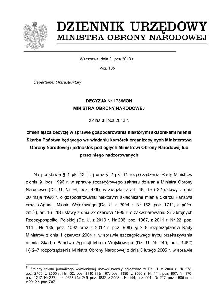 Warszawa, dnia 3 lipca 2013 r. Poz. 165 Departament Infrastruktury DECYZJA Nr 173/MON MINISTRA OBRONY NARODOWEJ z dnia 3 lipca 2013 r. zmieniająca decyzję w sprawie gospodarowania niektórymi składnikami mienia Skarbu Państwa będącego we władaniu komórek organizacyjnych Ministerstwa Obrony Narodowej i jednostek podległych Ministrowi Obrony Narodowej lub przez niego nadzorowanych Na podstawie § 1 pkt 13 lit. j oraz § 2 pkt 14 rozporządzenia Rady Ministrów z dnia 9 lipca 1996 r. w sprawie szczegółowego zakresu działania Ministra Obrony Narodowej (Dz. U. Nr 94, poz. 426), w związku z art. 18, 19 i 22 ustawy z dnia 30 maja 1996 r. o gospodarowaniu niektórymi składnikami mienia Skarbu Państwa oraz o Agencji Mienia Wojskowego (Dz. U. z 2004 r. Nr 163, poz. 1711, z późn. zm.1)), art. 16 i 18 ustawy z dnia 22 czerwca 1995 r. o zakwaterowaniu Sił Zbrojnych Rzeczypospolitej Polskiej (Dz. U. z 2010 r. Nr 206, poz. 1367, z 2011 r. Nr 22, poz. 114 i Nr 185, poz. 1092 oraz z 2012 r. poz. 908), § 2–8 rozporządzenia Rady Ministrów z dnia 1 czerwca 2004 r. w sprawie szczegółowego trybu przekazywania mienia Skarbu Państwa Agencji Mienia Wojskowego (Dz. U. Nr 140, poz. 1482) i § 2–7 rozporządzenia Ministra Obrony Narodowej z dnia 3 lutego 2005 r. w sprawie 1) Zmiany tekstu jednolitego wymienionej ustawy zostały ogłoszone w Dz. U. z 2004 r. Nr 273, poz. 2703, z 2005 r. Nr 132, poz. 1110 i Nr 167, poz. 1398, z 2006 r. Nr 141, poz. 997, Nr 170, poz. 1217, Nr 227, poz. 1658 i Nr 249, poz. 1832, z 2008 r. Nr 144, poz. 901 i Nr 227, poz. 1505 oraz z 2012 r. poz. 707. trybu przekazania mienia Wojskowej Agencji Mieszkaniowej (Dz. U. Nr 27, poz. 223 oraz z 2010 r. Nr 87, poz. 569) ustala się, co następuje: § 1. W decyzji nr 230/MON Ministra Obrony Narodowej z dnia 20 czerwca 2011 r. w sprawie gospodarowania niektórymi składnikami mienia Skarbu Państwa będącego we władaniu komórek organizacyjnych Ministerstwa Obrony Narodowej i jednostek podległych Ministrowi Obrony Narodowej lub przez niego nadzorowanych (Dz. Urz. Min. Obr. Nar. Nr 13, poz. 185) wprowadza się następujące zmiany: 1) w § 1: a) w pkt 2 dodaje się lit. f w brzmieniu: „f) sprzętu, wyposażenia oraz materiałów kartograficzno-poligraficznych, topograficznych i geodezyjnych.”, b) uchyla się pkt 5, c) w pkt 6: – wprowadzenie do wyliczenia otrzymuje brzmienie: „Szef Służby Kontrwywiadu Wojskowego i Szef Służby Wywiadu Wojskowego, w zakresie:”, – lit. a otrzymuje brzmienie: „a) trwale lub czasowo zbędnego albo nie nadającego się do remontu lub dalszego bezpiecznego użytkowania mienia ruchomego: etatowego, tabelarycznego, naliczeniowego i należnościowego, wyposażenia i części zamiennych do tego mienia, określonych w decyzji Ministra Obrony Narodowej w sprawie określenia funkcji gestorów i centralnych organów logistycznych uzbrojenia i sprzętu wojskowego w resorcie obrony narodowej, a także mienia będącego odpadem - niezależnie od ich wartości, będącego w ewidencji organizacyjnych im podległych,”; ilościowo-wartościowej jednostek 2) w § 2 pkt 1 i 2 otrzymują brzmienie: „1) dowódcy rodzajów Sił Zbrojnych i szefowie rejonowych (Stołecznego, Wojskowego) zarządów infrastruktury - zgłaszają Szefowi Inspektoratu Wsparcia Sił Zbrojnych propozycje do planu w zakresie określonym w § 1 pkt 9 - w terminie do dnia 10 stycznia roku poprzedzającego przekazanie mienia; 2) komórki i jednostki nie sporządzające planów, prowadzące ewidencję ilościowo-wartościową mienia ruchomego trwale lub czasowo zbędnego zgłaszają odpowiednio: Dyrektorowi Generalnemu Ministerstwa Obrony Narodowej, Szefowi Inspektoratu Wsparcia Sił Zbrojnych, Dyrektorowi Departamentu Administracyjnego, Szefowi Inspektoratu Wojskowej Służby Zdrowia, Dowódcy Wojsk Specjalnych, Dowódcy Garnizonu Warszawa, Komendantowi Głównemu Żandarmerii Wojskowej, Szefowi Służby Kontrwywiadu Wojskowego i Szefowi Służby Wywiadu Wojskowego, propozycje do planów w zakresie określonym w § 1 pkt 1, pkt 2 lit. a-d oraz pkt 3-6, natomiast szefom rejonowych organów infrastruktury propozycje do planów, w zakresie określonym w § 1 pkt 8;”; 3) w § 4: a) w ust. 1 wprowadzenie do wyliczenia otrzymuje brzmienie: „Organ, o którym mowa w § 1 pkt 2 i 7, w terminie do dnia 15 lutego roku poprzedzającego przekazanie mienia, przesyła plany, o których mowa w § 1 pkt 7, do uzgodnienia:”, b) w ust. 2: – uchyla się pkt 2, – dodaje się pkt 3 i 4 w brzmieniu: „3. Organy, o których mowa w ust. 2 pkt 1, uzgadniają plany w terminie do dnia 15 marca roku poprzedzającego przekazanie mienia. 4. Wersje elektroniczne planów, o których mowa w § 1 pkt 1, pkt 2 lit. a–d, pkt 3–6 oraz pkt 8 są przesyłane do wiadomości Dyrektora Departamentu Wychowania i Promocji Obronności.”; 4) § 8 i 9 otrzymują brzmienie: „§ 8. Organy, o których mowa w § 1, po dokonaniu uzgodnień i uzyskaniu opinii, o których mowa w § 4 i 5, uwzględniając stanowisko Prezesa AMW, w terminie do dnia 30 czerwca roku poprzedzającego przekazanie mienia, przedstawiają plany do zatwierdzenia organom wymienionym w § 11, załączając stanowisko Prezesa AMW i pozostałe uzgodnienia (opinie), z zastrzeżeniem § 9. § 9. Dyrektor Departamentu Infrastruktury, po uzyskaniu opinii Prezesa AMW i Prezesa WAM w terminie do dnia 31 marca roku poprzedzającego przekazanie mienia, przedstawia plany, o których mowa w § 1 pkt 9, z uwzględnieniem podziału na nieruchomości przekazywane do AMW i WAM, do zatwierdzenia Podsekretarzowi Stanu w Ministerstwie Obrony Narodowej do Spraw Infrastruktury, załączając opinie Prezesa AMW i Prezesa WAM oraz pozostałe uzgodnienia (opinie).”; 5) § 11 otrzymuje brzmienie: „§ 11. Do zatwierdzania planów upoważniony jest: 1) Podsekretarz Stanu w Ministerstwie Obrony Narodowej do Spraw Infrastruktury – w zakresie planów, o których mowa w § 1 pkt 1–7 a także pkt 9 oraz w