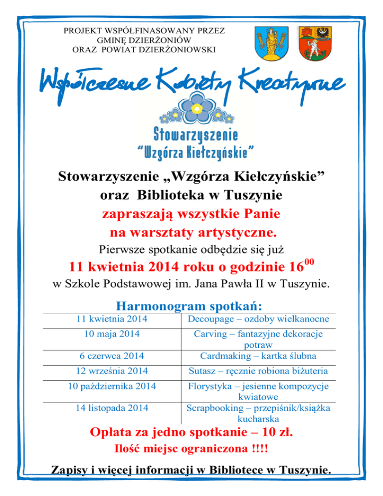 PROJEKT WSPÓŁFINASOWANY PRZEZ GMINĘ DZIERŻONIÓW ORAZ POWIAT DZIERŻONIOWSKI Współczesne Kobiety Kreatywne Stowarzyszenie „Wzgórza Kiełczyńskie” oraz Biblioteka w Tuszynie zapraszają wszystkie Panie na warsztaty artystyczne. Pierwsze spotkanie odbędzie się już 11 kwietnia 2014 roku o godzinie 1600 w Szkole Podstawowej im. Jana Pawła II w Tuszynie. Harmonogram spotkań: 11 kwietnia 2014 Decoupage – ozdoby wielkanocne 10 maja 2014 6 czerwca 2014 Carving – fantazyjne dekoracje potraw Cardmaking – kartka ślubna 12 września 2014 Sutasz – ręcznie robiona biżuteria 10 października 2014 Florystyka – jesienne kompozycje kwiatowe Scrapbooking – przepiśnik/książka kucharska 14 listopada 2014 Opłata za jedno spotkanie – 10 zł. Ilość miejsc ograniczona !!!! Zapisy i więcej informacji w Bibliotece w Tuszynie.