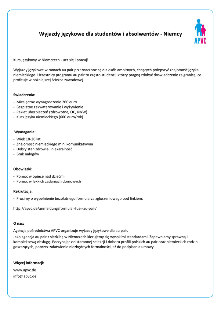 Wyjazdy językowe dla studentów i absolwentów - Niemcy Kurs językowy w Niemczech - ucz się i pracuj! Wyjazdy językowe w ramach au pair przeznaczone są dla osób ambitnych, chcących polepszyć znajomość języka niemieckiego. Uczestnicy programu au pair to często studenci, którzy pragną zdobyć doświadczenie za granicą, co profituje w późniejszej ścieżce zawodowej. Świadczenia: - Miesięczne wynagrodzenie 260 euro Bezpłatne zakwaterowanie i wyżywienie Pakiet ubezpieczeń (zdrowotne, OC, NNW) Kurs języka niemieckiego (600 euro/rok) Wymagania: - Wiek 18-26 lat Znajomość niemieckiego min. komunikatywna Dobry stan zdrowia i niekaralność Brak nałogów Obowiązki: - Pomoc w opiece nad dziećmi - Pomoc w lekkich zadaniach domowych Rekrutacja: - Prosimy o wypełnienie bezpłatnego formularza zgłoszeniowego pod linkiem: http://apvc.de/anmeldungsformular-fuer-au-pair/ O nas: Agencja pośrednictwa APVC organizuje wyjazdy językowe dla au pair. Jako agencja au pair z siedzibą w Niemczech kierujemy się wysokimi standardami. Zapewniamy sprawną i kompleksową obsługę. Poczynając od starannej selekcji i doboru profili polskich au pair oraz niemieckich rodzin goszczących, poprzez załatwienie niezbędnych formalności, aż do podpisania umowy. Więcej informacji: www.apvc.de [email protected]