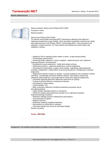 Taniewozki.NET Utworzono: sobota, 14 styczeń 2012 Nianie elektroniczne Niania Avent Philips SCD 510/00 Nazwa produktu: Niania Avent Philips SCD 510/00 Producent: Avent Model produktu: Niania Avent Philips SCD 510/00 Ta cyfrowa niania dzięki technologi DECT gwarantuje całkowity brak zakłoceń i zapewnia krystalicznie czysty dźwięk. Ciesz się pełnym komfortem psychicznym dzięki serii elektronicznych niań Philips AVENT z technologią DECT, ktore pomogą Ci się odprężyć i zyskać pewność, że Twoje dziecko jest bezpieczne nawet wtedy, gdy wyjdziesz z pokoju. Zasięg do 330 m zapewnia dobry odbior w domu i w jego okolicy, Technologia cyfrowa DECT, Gwarancja braku zakłoceń z innych urządzeń - elektronicznych niań, telefonow bezprzewodowych i komorkowych, Krystalicznie czyste połączenie - dzięki technologii cyfrowej, Szyfrowanie danych - zapewnia bezpieczne i poufne połączenie, Automatyczne ostrzeżenie o wyjściu poza zasięg - sygnalizuje stałe połączenie pomiędzy nadajnikiem i odbiornikiem za pomocą wizualnych i dźwiękowych wskazań połączenia, Regulowana funkcja czułości na dźwięk - pozwala zwiększyć lub zmniejszyć czułość mikrofonu, umożliwiając słuchanie oddechu dziecka. Gdy dziecko odzywa się, wskaźniki uaktywniają się i zaczynają świecić nawet przy wyłączonej głośności. Umożliwia regulację głośności odbiornika stosownie do sytuacji, Funkcje słuchania dziecka i mowienia do dziecka, Automatyczny wybor kanału, Liczba kanałow 120, Mały, przenośny odbiornik umożliwia swobodne poruszanie się po domu , Ciepłe światło uspokaja dziecko po obudzeniu, Odbiornik zasilany akumulatorowo pozwala na co najmniej 24 godziny bezprzewodowego działania, Wskaźnik niskiego poziomu naładowania akumulatora, Czas ładowania 8 godzin, Zasilacz sieciowy, Możliwość zasilania nadajnika bateriami, Akumulatory do odbiornika w zestawie, Instrukcja obsługi oraz skrocona instrukcja obsługi, Zaczep na pasek, Cena: 369.00zł Dostępność: Ten produkt został dodany do sklepu w dniu niedziela, 10 październik 2010 http://www.taniewozki.net | [email protected] | | Strona 1/1
