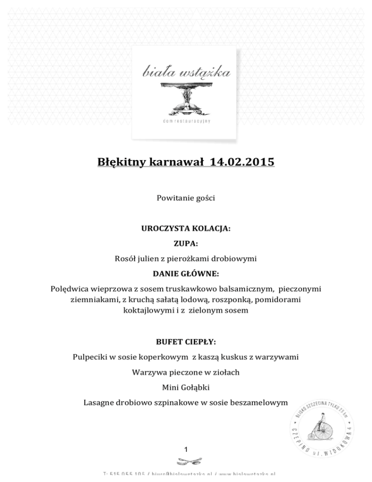 Błękitny karnawał 14.02.2015 Powitanie gości UROCZYSTA KOLACJA: ZUPA: Rosół julien z pierożkami drobiowymi DANIE GŁÓWNE: Polędwica wieprzowa z sosem truskawkowo balsamicznym, pieczonymi ziemniakami, z kruchą sałatą lodową, roszponką, pomidorami koktajlowymi i z zielonym sosem BUFET CIEPŁY: Pulpeciki w sosie koperkowym z kaszą kuskus z warzywami Warzywa pieczone w ziołach Mini Gołąbki Lasagne drobiowo szpinakowe w sosie beszamelowym 1 BUFET ZIMNY: Śledź z cebulką Mus z pstrąga w pucharkach Pieczony schab na różowo Baleron z kurczaka Tortilla z kurczaka Pieczywo i masło Sosy: czosnkowy, chrzanowy BUFET SŁODKI: Deser Pana Cotta z musem truskawkowym Ciasta NAPOJE: Kawa z ekspresu przelewowego, wybór herbat Napoje gazowane (Coca Cola, Fanta, Sprite) Soki owocowe ( Tymbark, Hortex) Wódka Żołądkowa Gorzka Deluxe bez ograniczeń Open bar ( drinki ) bez ograniczeń Woda mineralna Cena menu 170 zł /os 2 Bal będzie trwał od 20:00 do godziny 4:00 Dodatkowe możliwości: Nocleg w hotelu z śniadaniem 100 zł/ os 3