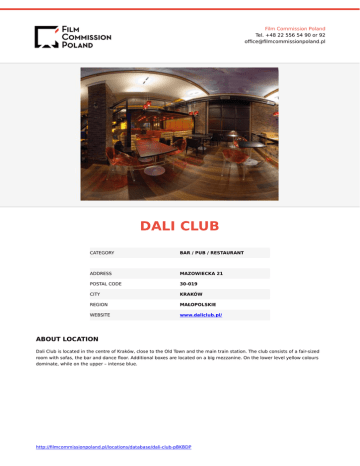 Film Commission Poland Tel. +48 22 556 54 90 or 92 office@filmcommissionpoland.pl DALI CLUB CATEGORY BAR / PUB / RESTAURANT ADDRESS MAZOWIECKA 21 POSTAL CODE 30-019 CITY KRAKÓW REGION MAŁOPOLSKIE WEBSITE www.daliclub.pl/ ABOUT LOCATION Dali Club is located in the centre of Kraków, close to the Old Town and the main train station. The club consists of a fair-sized room with sofas, the bar and dance floor. Additional boxes are located on a big mezzanine. On the lower level yellow colours dominate, while on the upper – intense blue. http://filmcommissionpoland.pl/locations/database/dali-club-pBKBDP