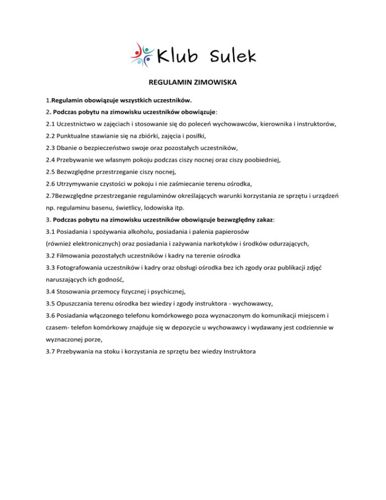 REGULAMIN ZIMOWISKA 1.Regulamin obowiązuje wszystkich uczestników. 2. Podczas pobytu na zimowisku uczestników obowiązuje: 2.1 Uczestnictwo w zajęciach i stosowanie się do poleceń wychowawców, kierownika i instruktorów, 2.2 Punktualne stawianie się na zbiórki, zajęcia i posiłki, 2.3 Dbanie o bezpieczeństwo swoje oraz pozostałych uczestników, 2.4 Przebywanie we własnym pokoju podczas ciszy nocnej oraz ciszy poobiedniej, 2.5 Bezwzględne przestrzeganie ciszy nocnej, 2.6 Utrzymywanie czystości w pokoju i nie zaśmiecanie terenu ośrodka, 2.7Bezwzględne przestrzeganie regulaminów określających warunki korzystania ze sprzętu i urządzeń np. regulaminu basenu, świetlicy, lodowiska itp. 3. Podczas pobytu na zimowisku uczestników obowiązuje bezwzględny zakaz: 3.1 Posiadania i spożywania alkoholu, posiadania i palenia papierosów (również elektronicznych) oraz posiadania i zażywania narkotyków i środków odurzających, 3.2 Filmowania pozostałych uczestników i kadry na terenie ośrodka 3.3 Fotografowania uczestników i kadry oraz obsługi ośrodka bez ich zgody oraz publikacji zdjęć naruszających ich godność, 3.4 Stosowania przemocy fizycznej i psychicznej, 3.5 Opuszczania terenu ośrodka bez wiedzy i zgody instruktora - wychowawcy, 3.6 Posiadania włączonego telefonu komórkowego poza wyznaczonym do komunikacji miejscem i czasem- telefon komórkowy znajduje się w depozycie u wychowawcy i wydawany jest codziennie w wyznaczonej porze, 3.7 Przebywania na stoku i korzystania ze sprzętu bez wiedzy Instruktora
