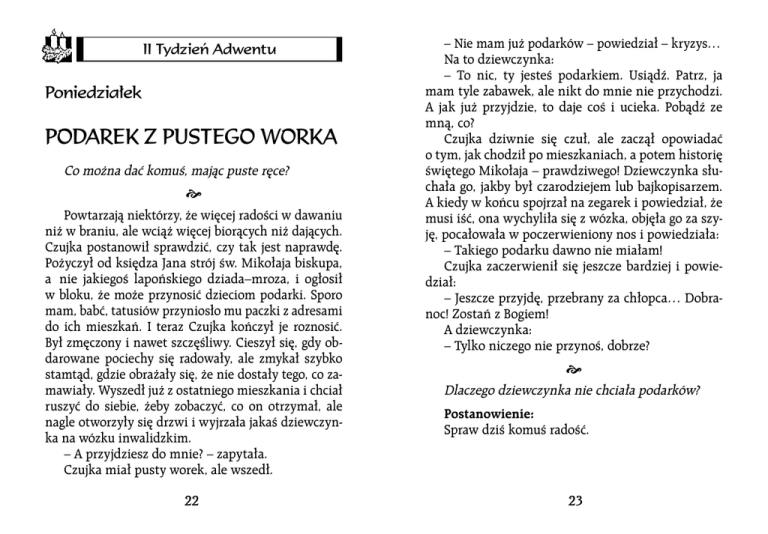 II Tydzień Adwentu Poniedziałek PODAREK Z PUSTEGO WORKA Co można dać komuś, mając puste ręce? [ Powtarzają niektórzy, że więcej radości w dawaniu niż w braniu, ale wciąż więcej biorących niż dających. Czujka postanowił sprawdzić, czy tak jest naprawdę. Pożyczył od księdza Jana strój św. Mikołaja biskupa, a nie jakiegoś lapońskiego dziada–mroza, i ogłosił w bloku, że może przynosić dzieciom podarki. Sporo mam, babć, tatusiów przyniosło mu paczki z adresami do ich mieszkań. I teraz Czujka kończył je roznosić. Był zmęczony i nawet szczęśliwy. Cieszył się, gdy obdarowane pociechy się radowały, ale zmykał szybko stamtąd, gdzie obrażały się, że nie dostały tego, co zamawiały. Wyszedł już z ostatniego mieszkania i chciał ruszyć do siebie, żeby zobaczyć, co on otrzymał, ale nagle otworzyły się drzwi i wyjrzała jakaś dziewczynka na wózku inwalidzkim. – A przyjdziesz do mnie? – zapytała. Czujka miał pusty worek, ale wszedł. 22 – Nie mam już podarków – powiedział – kryzys… Na to dziewczynka: – To nic, ty jesteś podarkiem. Usiądź. Patrz, ja mam tyle zabawek, ale nikt do mnie nie przychodzi. A jak już przyjdzie, to daje coś i ucieka. Pobądź ze mną, co? Czujka dziwnie się czuł, ale zaczął opowiadać o tym, jak chodził po mieszkaniach, a potem historię świętego Mikołaja – prawdziwego! Dziewczynka słuchała go, jakby był czarodziejem lub bajkopisarzem. A kiedy w końcu spojrzał na zegarek i powiedział, że musi iść, ona wychyliła się z wózka, objęła go za szyję, pocałowała w poczerwieniony nos i powiedziała: – Takiego podarku dawno nie miałam! Czujka zaczerwienił się jeszcze bardziej i powiedział: – Jeszcze przyjdę, przebrany za chłopca… Dobranoc! Zostań z Bogiem! A dziewczynka: – Tylko niczego nie przynoś, dobrze? [ Dlaczego dziewczynka nie chciała podarków? Postanowienie: Spraw dziś komuś radość. 23