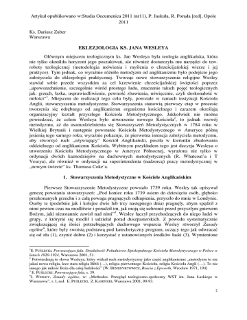 Artykuł opublikowano w:Studia Oecumenica 2011 (nr11), P. Jaskuła, R. Porada [red], Opole 2011 Ks. Dariusz Zuber Warszawa EKLEZJOLOGIA KS. JANA WESLEYA Głównym miejscem teologicznym ks. Jan Wesleya była teologia anglikańska, która nie tylko określiła horyzont jego poszukiwań, ale również dostarczyła mu narzędzi do tzw. roboty teologicznej (metodologia mówienia i myślenia o chrześcijańskiej wierze i jej praktyce). Tym jednak, co wyraźnie różniło metodyzm od anglikanizmu było podejście jego założyciela do eklezjologii praktycznej. Tworząc nowe stowarzyszenia religijne Wesley stawiał sobie przede wszystkim za cel krzewienie chrześcijańskiej świętości poprzez „upowszechnienie, szczególnie wśród prostego ludu, znaczenie takich pojęć teologicznych jak: grzech, łaska, usprawiedliwienie, pewność zbawienia, uświęcenie, czyli doskonałość w miłości”1. Miejscem do realizacji tego celu były, powstałe w ramach instytucji Kościoła Anglii, stowarzyszenia metodystyczne. Stowarzyszenia stanowią pierwszy etap w procesie tworzenia się odrębnego od anglikanizmu organizmu kościelnego i zarazem określają organizacyjny kształt przyszłego Kościoła Metodystycznego. Jakkolwiek nie można powiedzieć, że celem Wesleya było utworzenie nowego Kościoła2, to jednak rozwój metodyzmu, aż do usamodzielnienia się Stowarzyszeń Metodystycznych w 1784 roku w Wielkiej Brytanii i następnie powstanie Kościoła Metodystycznego w Ameryce późną jesienią tego samego roku, wyraźnie pokazuje, że pierwotna intencja założyciela metodyzmu, aby stworzyć ruch „ożywiający” Kościół Anglikański, poszła w kierunku zbudowania oddzielnego od anglikanizmu Kościoła. Wybitnym przykładem tego jest decyzja Wesleya o utworzeniu Kościoła Metodystycznego w Ameryce Północnej, wyrażona nie tylko w ordynacji dwóch kaznodziejów na duchownych metodystycznych (R. Whatcoat’a i T Veseya), ale również w ordynacji na superintendenta (nadzorcę) pracy metodystycznej w „nowym świecie” ks. Thomasa Coke’a. 1. Stowarzyszenia Metodystyczne w Kościele Anglikańskim Pierwsze Stowarzyszenie Metodystyczne powstało 1739 roku. Wesley tak opisywał genezę powstania stowarzyszeń: „Pod koniec roku 1739 osiem do dziesięciu osób, głęboko przekonanych grzechu i z całą powaga pragnących odkupienia, przyszło do mnie w Londynie. Osoby te (podobnie jak i kolejne dwie lub trzy następnego dnia) pragnęły, abym spędził z nimi pewien czas na modlitwie i poradził im, jak moją się uchronić przed przyszłym gniewem Bożym, jaki nieustannie zawisł nad nimi”3. Wesley łączył przychodzących do niego ludzi w grupy, z którymi się modlił i udzielał porad duszpasterskich. Z powodu systematycznie zwiększającej się ilości potrzebujących duchowego wsparcia Wesley stworzył Zasady ogólne4, które były swoistą podstawą pod katechetyczny program, uczący tego jak odwracać się od zła (1), czynić dobro (2) i korzystać z ustanowionych środków łaski (3). Wymienione 1 E. PUŚLECKI, Powracająca fala. Działalność Południowo Episkopalnego Kościoła Metodystycznego w Polsce w latach 1920-1924, Warszawa 2001, 51. 2 Potwierdzają to słowa Wesleya, który widzał ruch metodystyczny jako część anglikanizmu: „metodyzm to nie jakaś nowa religia, lecz stara religia Bibli (…), religia pierwotnego Kościoła, religia Kościoła Angli (…). To nic innego jak miłość Boża dla całej ludzkości” [W. BENEDYKTOWICZ, Bracia z Epworth, Wrocław 1971, 194] 3 E. PUŚLECKI, Powracająca fala, s. 39. 4 J. WESLEY, Zasady ogólne, w: „Methodos. Przegląd teologiczno-społeczny WST im. Jana Łaskiego w Warszawie”, r. I, red. E. PUŚLECKI, Z. KAMIŃSKI, Warszawa 2001, 90-93. 1 Artykuł opublikowano w:Studia Oecumenica 2011 (nr11), P. Jaskuła, R. Porada [red], Opole 2011 trzy cele Zasad ogólnych były realizowane w ramach grup duchowego wzrostu i klas stowarzyszeń metodystycznych. Grupy duchowego wzrostu i klasy tworzyło po kilkanaście osób, które na cotygodniowych spotkania religijnych umacniały się w wierze, dyscyplinowały (korygowały praktykę wiary) oraz udziały wsparcia materialnego i duszpasterskiego osobą potrzebującym. Klasy obok coniedzielnych nabożeństw, stanowiły miejsce realizowania Wprowadzony przez Wesleya system klas stał się głównym motorem rozwoju metodyzmu. Po kilku latach pracy duszpasterskiej w grupach, klasach i stowarzyszeniach Wesley w 1744 roku zwołuje pierwszą Konferencję kaznodziejów metodystycznych. Odtąd Konferencje będą odbywać się co roku. Instytucja Konferencji Dorocznej dla Stowarzyszeń Metodystycznych stanowiła platformę wymiany doświadczeń w pracy duszpasterskiej i kaznodziejskiej, poruszano na nich również zagadnienia katechetycznej i ewangelizacyjnej działalności Stowarzyszeń oraz dyscypliny kościelnej i strategii działania. Konferencja – według założyciela metodyzmu – jest podstawową formą autorytetu rządzenia w stowarzyszeniach. Dodatkowo wydawane przez Wesleya sprawozdania z Konferencji Dorocznych (Protokoły Konferencyjne) po ostatecznej redakcji w 1789 roku stały się podstawowym dokumentem regulującym zasady działania ruchu metodystycznego5. Obok Konferencji Dorocznej istotnym czynnikiem warunkującym funkcjonowanie Stowarzyszeń Metodystycznych był koneksjonalizm. Ustanowiony przez Wesleya koneksjonalizm odnosił się do kaznodziejów metodystycznych, którzy pozostawali z nim w łączności „in connexion”6. „W łączności, znaczyło wtedy tyle co: w zgodzie z obowiązującymi wówczas zasadami funkcjonowania stowarzyszeń metodystycznych. Dyscyplina zaś precyzowała relacje między poszczególnymi stanowiskami i konferencjami. Kaznodzieje pozostający w łączności z Wesleyem, akceptujący postanowienia Konferencji (…) byli pełnoprawnymi członkami Konferencji Dorocznej”7. Stowarzyszenia Metodystyczne, nim uniezależniły się sakramentaln