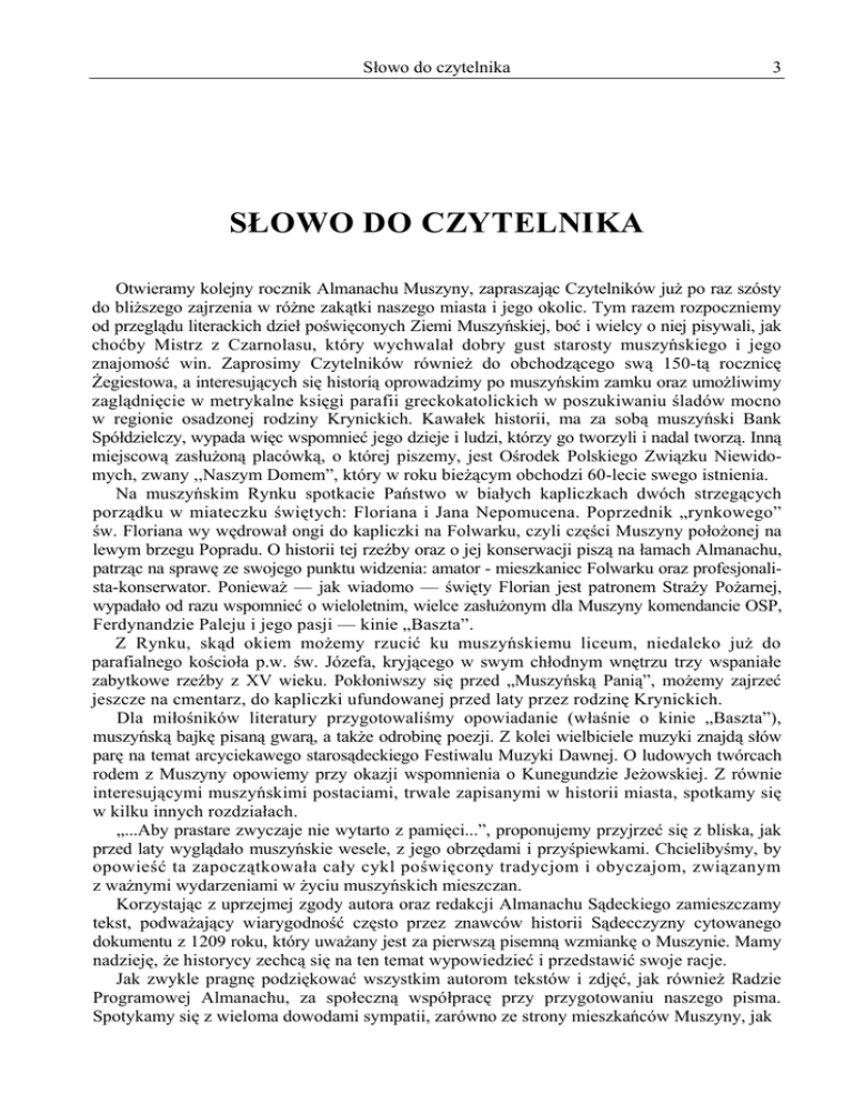 Słowo do czytelnika 3 SŁOWO DO CZYTELNIKA Otwieramy kolejny rocznik Almanachu Muszyny, zapraszając Czytelników już po raz szósty do bliższego zajrzenia w różne zakątki naszego miasta i jego okolic. Tym razem rozpoczniemy od przeglądu literackich dzieł poświęconych Ziemi Muszyńskiej, boć i wielcy o niej pisywali, jak choćby Mistrz z Czarnolasu, który wychwalał dobry gust starosty muszyńskiego i jego znajomość win. Zaprosimy Czytelników również do obchodzącego swą 150-tą rocznicę Żegiestowa, a interesujących się historią oprowadzimy po muszyńskim zamku oraz umożliwimy zaglądnięcie w metrykalne księgi parafii greckokatolickich w poszukiwaniu śladów mocno w regionie osadzonej rodziny Krynickich. Kawałek historii, ma za sobą muszyński Bank Spółdzielczy, wypada więc wspomnieć jego dzieje i ludzi, którzy go tworzyli i nadal tworzą. Inną miejscową zasłużoną placówką, o której piszemy, jest Ośrodek Polskiego Związku Niewidomych, zwany ,,Naszym Domem”, który w roku bieżącym obchodzi 60-lecie swego istnienia. Na muszyńskim Rynku spotkacie Państwo w białych kapliczkach dwóch strzegących porządku w miateczku świętych: Floriana i Jana Nepomucena. Poprzednik „rynkowego” św. Floriana wy wędrował ongi do kapliczki na Folwarku, czyli części Muszyny położonej na lewym brzegu Popradu. O historii tej rzeźby oraz o jej konserwacji piszą na łamach Almanachu, patrząc na sprawę ze swojego punktu widzenia: amator - mieszkaniec Folwarku oraz profesjonalista-konserwator. Ponieważ — jak wiadomo — święty Florian jest patronem Straży Pożarnej, wypadało od razu wspomnieć o wieloletnim, wielce zasłużonym dla Muszyny komendancie OSP, Ferdynandzie Paleju i jego pasji — kinie „Baszta”. Z Rynku, skąd okiem możemy rzucić ku muszyńskiemu liceum, niedaleko już do parafialnego kościoła p.w. św. Józefa, kryjącego w swym chłodnym wnętrzu trzy wspaniałe zabytkowe rzeźby z XV wieku. Pokłoniwszy się przed „Muszyńską Panią”, możemy zajrzeć jeszcze na cmentarz, do kapliczki ufundowanej przed laty przez rodzinę Krynickich. Dla miłośników literatury przygotowaliśmy opowiadanie (właśnie o kinie „Baszta”), muszyńską bajkę pisaną gwarą, a także odrobinę poezji. Z kolei wielbiciele muzyki znajdą słów parę na temat arcyciekawego starosądeckiego Festiwalu Muzyki Dawnej. O ludowych twórcach rodem z Muszyny opowiemy przy okazji wspomnienia o Kunegundzie Jeżowskiej. Z równie interesującymi muszyńskimi postaciami, trwale zapisanymi w historii miasta, spotkamy się w kilku innych rozdziałach. „...Aby prastare zwyczaje nie wytarto z pamięci...”, proponujemy przyjrzeć się z bliska, jak przed laty wyglądało muszyńskie wesele, z jego obrzędami i przyśpiewkami. Chcielibyśmy, by opowieść ta zapoczątkowała cały cykl poświęcony tradycjom i obyczajom, związanym z ważnymi wydarzeniami w życiu muszyńskich mieszczan. Korzystając z uprzejmej zgody autora oraz redakcji Almanachu Sądeckiego zamieszczamy tekst, podważający wiarygodność często przez znawców historii Sądecczyzny cytowanego dokumentu z 1209 roku, który uważany jest za pierwszą pisemną wzmiankę o Muszynie. Mamy nadzieję, że historycy zechcą się na ten temat wypowiedzieć i przedstawić swoje racje. Jak zwykle pragnę podziękować wszystkim autorom tekstów i zdjęć, jak również Radzie Programowej Almanachu, za społeczną współpracę przy przygotowaniu naszego pisma. Spotykamy się z wieloma dowodami sympatii, zarówno ze strony mieszkańców Muszyny, jak 4 Bożena Mściwujewska-Kruk też jej władz, a także osób spoza naszego miasta, na przykład redakcji podobnych, lokalnych wydawnictw. Ponieważ autorzy — podobnie jak w latach ubiegłych — zrezygnowali ze swych honorariów, ewentualny dochód ze sprzedaży Almanachu zostanie przekazany na konto Towarzystwa Miłośników Ziemi Muszyńskiej, z przeznaczeniem na konserwację ruin muszyńskiego Zamku. W porównaniu z poprzednimi rocznikami aktualny Almanach ma zmieniony nieco układ graficzny, dzięki czemu nazwiska autorów znajdą Państwo przed określonym rozdziałem, a także u góry każdej jego strony. Jest naszym zamierzeniem, aby Almanach w równej mierze był pismem adresowanym do turystów i wczasowiczów, jak i do rodowitych muszyniaków, którzy być może odnajdą w którymś z tekstów wzmiankę o swoich przodkach, znajomych czy sąsiadach. Życząc zatem na zakończenie wszystkim Czytelnikom sympatycznej lektury, radzimy dobrze wsłuchać się w echa historii, by lepiej zrozumieć codzienność miasta, drzemiącego u stóp zamkowego wzgórza... Bożena Mściwujewska-Kruk