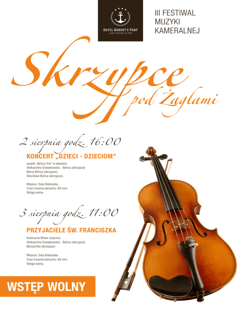 III FESTIWAL MUZYKI KAMERALNEJ Skrzypce pod Żaglami 2 sierpnia godz. 16:00 KONCERT „DZIECI - DZIECIOM” zespół „Belica Trio” w składzie: Aleksandra Szwejkowska - Belica (skrzypce) Maria Belica (skrzypce), Stanisław Belica (skrzypce), Miejsce: Sala Niebieska Czas trwania koncertu: 60 min. Wstęp wolny 3 sierpnia godz. 11:00 PRZYJACIELE ŚW. FRANCISZKA Katarzyna Wiwer (sopran), Aleksandra Szwejkowska - Belica (skrzypce) Michał Rot (fortepian) Miejsce: Sala Niebieska Czas trwania koncertu: 60 min. Wstęp wolny WSTĘP WOLNY