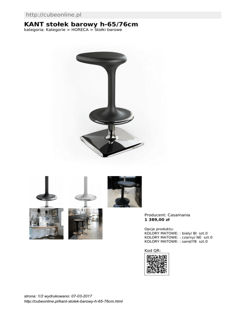 http://cubeonline.pl KANT stołek barowy h-65/76cm kategoria: Kategorie > HORECA > Stołki barowe Producent: Casamania 1 389,00 zł Opcje produktu: KOLORY MATOWE: : biały/ BI szt.0 KOLORY MATOWE: : czarny/ NE szt.0 KOLORY MATOWE: : sand/YB szt.0 Kod QR: strona: 1/2 wydrukowano: 07-03-2017 http://cubeonline.pl/kant-stolek-barowy-h-65-76cm.html KANT to futurystyczny stołek natchnionego projektanta, wykonany ze wzmocnionego antybakteryjnego tworzywa, utrzymuje ciężar aż do 200 kg. Nadaje się także do użytku na zewnątrz (taras, ogród itp.) WYMIARY (cm): wysokość całkowita- 65/76 rozmiar podstawy- 46/ 37,50 MATERIAŁ: tworzywo nieprzezroczyste, matowe- reinforced polypropylene, aluminium polerowane INNE: z regulacją wysokości może stać na zewnątrz Inne produkty Casamania: http://www.cubeonline.pl/manufacturer/casamania Inne produkty projektanta: http://www.cubeonline.pl/designer/rashid-karim strona: 2/2 wydrukowano: 07-03-2017 http://cubeonline.pl/kant-stolek-barowy-h-65-76cm.html