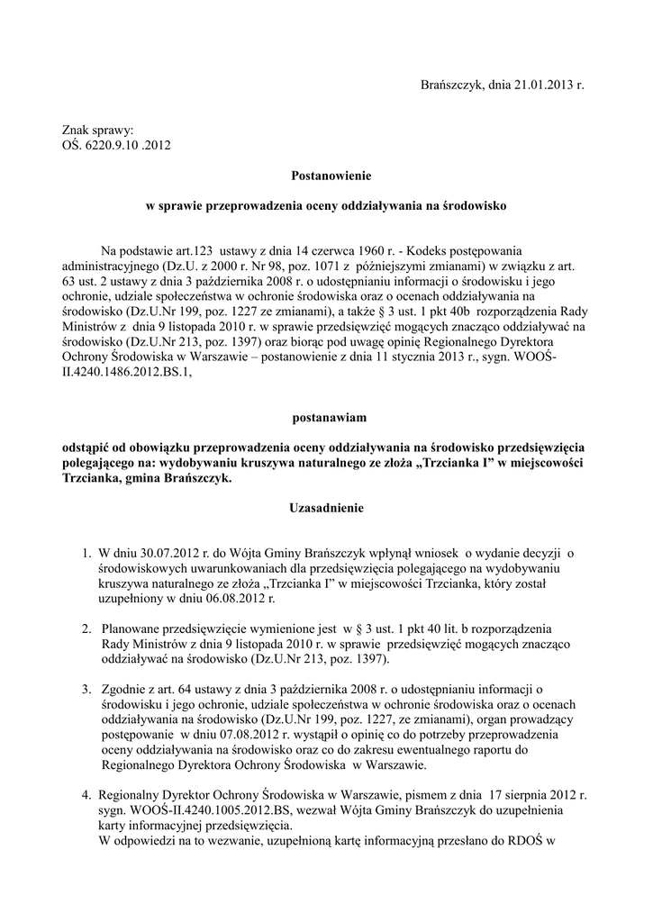 Brańszczyk, dnia 21.01.2013 r. Znak sprawy: OŚ. 6220.9.10 .2012 Postanowienie w sprawie przeprowadzenia oceny oddziaływania na środowisko Na podstawie art.123 ustawy z dnia 14 czerwca 1960 r. - Kodeks postępowania administracyjnego (Dz.U. z 2000 r. Nr 98, poz. 1071 z późniejszymi zmianami) w związku z art. 63 ust. 2 ustawy z dnia 3 października 2008 r. o udostępnianiu informacji o środowisku i jego ochronie, udziale społeczeństwa w ochronie środowiska oraz o ocenach oddziaływania na środowisko (Dz.U.Nr 199, poz. 1227 ze zmianami), a także § 3 ust. 1 pkt 40b rozporządzenia Rady Ministrów z dnia 9 listopada 2010 r. w sprawie przedsięwzięć mogących znacząco oddziaływać na środowisko (Dz.U.Nr 213, poz. 1397) oraz biorąc pod uwagę opinię Regionalnego Dyrektora Ochrony Środowiska w Warszawie – postanowienie z dnia 11 stycznia 2013 r., sygn. WOOŚII.4240.1486.2012.BS.1, postanawiam odstąpić od obowiązku przeprowadzenia oceny oddziaływania na środowisko przedsięwzięcia polegającego na: wydobywaniu kruszywa naturalnego ze złoża „Trzcianka I” w miejscowości Trzcianka, gmina Brańszczyk. Uzasadnienie 1. W dniu 30.07.2012 r. do Wójta Gminy Brańszczyk wpłynął wniosek o wydanie decyzji o środowiskowych uwarunkowaniach dla przedsięwzięcia polegającego na wydobywaniu kruszywa naturalnego ze złoża „Trzcianka I” w miejscowości Trzcianka, który został uzupełniony w dniu 06.08.2012 r. 2. Planowane przedsięwzięcie wymienione jest w § 3 ust. 1 pkt 40 lit. b rozporządzenia Rady Ministrów z dnia 9 listopada 2010 r. w sprawie przedsięwzięć mogących znacząco oddziaływać na środowisko (Dz.U.Nr 213, poz. 1397). 3. Zgodnie z art. 64 ustawy z dnia 3 października 2008 r. o udostępnianiu informacji o środowisku i jego ochronie, udziale społeczeństwa w ochronie środowiska oraz o ocenach oddziaływania na środowisko (Dz.U.Nr 199, poz. 1227, ze zmianami), organ prowadzący postępowanie w dniu 07.08.2012 r. wystąpił o opinię co do potrzeby przeprowadzenia oceny oddziaływania na środowisko oraz co do zakresu ewentualnego raportu do Regionalnego Dyrektora Ochrony Środowiska w Warszawie. 4. Regionalny Dyrektor Ochrony Środowiska w Warszawie, pismem z dnia 17 sierpnia 2012 r. sygn. WOOŚ-II.4240.1005.2012.BS, wezwał Wójta Gminy Brańszczyk do uzupełnienia karty informacyjnej przedsięwzięcia. W odpowiedzi na to wezwanie, uzupełnioną kartę informacyjną przesłano do RDOŚ w Warszawie w dniu 30.08.2012 r. oraz w dniu 11 września 2012r. ` 5 . W dniu 20 września 2012 r. do Wójta Gminy Brańszczyk wpłynęło postanowienie Regionalnego Dyrektora Ochrony Środowiska w Warszawie z dnia 13 września 2012 r. sygn. WOOŚ- II.4240.1005.2012.BS, stwierdzające brak potrzeby przeprowadzenia oceny oddziaływania na środowisko dla powyższego przedsięwzięcia. 6. Wójt Gminy Brańszczyk, biorąc pod uwagę brak akceptacji mieszkańców Trzcianki co do przebiegu drogi dojazdowej do złoża, wskazanej w „Karcie informacyjnej przedsięwzięcia” załączonej do wniosku, nieprzystosowanie tej drogi do ruchu ciężkich pojazdów, a także deklaracje Wnioskodawcy przed zmianą planu zagospodarowania przestrzennego dot. przebiegu trasy dojazdowej do złoża, w piśmie z dnia 08.10.2012 r. zwrócił się z prośbą o wskazanie przez Wnioskodawcę innej drogi dojazdowej do złoża niż droga asfaltowa od drogi krajowej nr 8 przez wieś Trzcianka. W odpowiedzi na to pismo, w dniu 19.10.2012 r. Wnioskodawca złożył poprawioną „Kartę informacyjną przedsięwzięcia” ze wskazaną nową trasą dojazdu do złoża. 7. W dniu 22.10.2012 r. pismem, znak: OŚ.6220.9.5.2012 Wójt Gminy Brańszczyk wystąpił do Regionalnego Dyrektora Ochrony Środowiska w Warszawie z prośbą o podtrzymanie postanowienia – znak: WOOŚ-II.4240.1005.2012.BS z dnia 13 września 2012 r., załączając zmieniony pkt 1 „Karty informacyjnej przedsięwzięcia” i mapę z zaznaczoną nową trasą dojazdu do złoża. W odpowiedzi na pismo Wójta Gminy Brańszczyk z dnia 22.10.2012 r., Regionalny Dyrektor Ochrony Środowiska w Warszawie , w piśmie z dnia 29.10.2012 r. , znak: WOOŚII.4240.1005.2012.BS stwierdził, iż brak jest możliwości podtrzymania opinii zawartej w w/w postanowieniu, gdyż wnioskowane zmiany istotnie wpływają na zakres planowanego przedsięwzięcia i w związku z tym, dla przedmiotowej inwestycji należy wystąpić do Regionalnego Dyrektora Ochrony Środowiska w Warszawie o wydanie nowej opinii w tej sprawie. 8. W dniu 27.11.2012 r. Wójt Gminy Brańszczyk ponownie wystąpił do Regionalnego Dyrektora Ochrony Środowiska w Warszawie o wydanie opinii w sprawie konieczności przeprowadzenia oceny oddziaływania na środowisko dla przedmiotowej inwestycji, załączając całą zmienioną dokumentację sprawy. 9. Regionalny Dyrektor Ochrony Środowiska w Warszawie, pismem z dnia 14.12.2012 r., znak: WOOŚ-II.4240.1486.2012.BS wezwał Wójta Gminy Brańszczyk do uzupełnienia wniosku. Wniosek został uzupełniony w dniu 03.01.2013 r., pismem znak: OŚ.6220.9.9.2012. 10. Regionalny Dyrektor Ochrony Środowiska w Warszawie w dniu 11.01.2013 r. wydał postanowienie – znak: WOOŚ.II.4240.1486.2012.BS.1, w którym wyraził opinię o braku konieczności przeprowadzenia oceny oddziaływania przedmiotowego przedsięwzięcia na środowisko. 11. Wójt Gminy Brańszczyk, po przeanalizowaniu dostarczonych wraz z wnioskiem materiałów, uwzględniając łącznie uwarunkowania wymienione w art. 63 ust. 1 ustawy z dnia 3 października 2008 r. o udostępnianiu informacji o środowisku i jego ochronie, udziale społeczeństwa w ochronie środowiska oraz o ocenach oddziaływania na środowisko, podzielił opinię wyrażoną przez Regionalnego Dyrektora Ochrony Środowiska w Warszawie co do braku konieczności przeprowadzenia oceny oddziaływania przedsięwzięcia na środowisko, Wójt Gminy Brańszczyk nie stwierdził potrzeby przeprowadzenia oceny oddziaływan