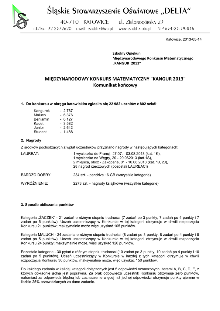 Śląskie Stowarzyszenie Oświatowe „DELTA“ 40-710 KATOWICE tel./fax.: 32 2572620 ul. Zielonogórska 23 e-mail: [email protected] www.ssodelta.edu.pl NIP 634-23-59-836 Katowice, 2013-05-14 Szkolny Opiekun Międzynarodowego Konkursu Matematycznego „KANGUR 2013” MIĘDZYNARODOWY KONKURS MATEMATYCZNY "KANGUR 2013" Komunikat końcowy 1. Do konkursu w okręgu katowickim zgłosiło się 22 982 uczniów z 802 szkół Kangurek Maluch Beniamin Kadet Junior Student - 2 767 6 376 6 127 3 582 2 642 1 488 2. Nagrody Z środków pochodzących z wpłat uczestników przyznano nagrody w następujących kategoriach: LAUREAT: 1 wycieczka do Francji, 27.07. - 03.08.2013 (kat. 1K), 1 wycieczka na Węgry, 20 - 29.062013 (kat.1S), 2 miejsca, obóz - Zakopane, 01 - 10.08.2013 (kat. 1J, 2J), 28 nagród rzeczowych (pozostali LAUREACI) BARDZO DOBRY: 234 szt. - pendrive 16 GB (wszystkie kategorie) WYRÓŻNIENIE: 2273 szt. - nagrody książkowe (wszystkie kategorie) 3. Sposób obliczania punktów Kategoria „ŻACZEK” - 21 zadań o różnym stopniu trudności (7 zadań po 3 punkty, 7 zadań po 4 punkty i 7 zadań po 5 punktów). Uczeń uczestniczący w Konkursie w tej kategorii otrzymuje w chwili rozpoczęcia Konkursu 21 punktów; maksymalnie może więc uzyskać 105 punktów. Kategoria MALUCH - 24 zadania o różnym stopniu trudności (8 zadań po 3 punkty, 8 zadań po 4 punkty i 8 zadań po 5 punktów). Uczeń uczestniczący w Konkursie w tej kategorii otrzymuje w chwili rozpoczęcia Konkursu 24 punkty; maksymalnie może, więc uzyskać 120 punktów. Pozostałe kategorie - 30 pytań o różnym stopniu trudności (10 zadań po 3 punkty, 10 zadań po 4 punkty i 10 zadań po 5 punktów). Uczeń uczestniczący w Konkursie w każdej z tych kategorii otrzymuje w chwili rozpoczęcia Konkursu 30 punktów, maksymalnie może, więc uzyskać 150 punktów. Do każdego zadania w każdej kategorii dołączonych jest 5 odpowiedzi oznaczonych literami A, B, C, D, E, z których dokładnie jedna jest poprawna. Za brak odpowiedzi uczestnik Konkursu otrzymuje zero punktów, natomiast za odpowiedz błędną lub zaznaczenie więcej niż jednej odpowiedzi otrzymuje punkty ujemne w liczbie 25% przewidzianych za dane zadanie. 4. Tabela poprawnych odpowiedzi (dostępna jest na stronach Śląskiego Stowarzyszenia Oświatowego DELTA w Katowicach - www.ssodelta.edu.pl) 1 2 3 4 5 6 7 8 9 10 11 12 13 14 15 16 17 18 19 20 21 22 23 24 25 26 27 28 29 30 ŻA M B K J C D E A D D D C D B B B C B C B C B C C D D E D C C B B D E B E B C C B B D C E B E C C C D D C C D E D C E B B A C A D E E E C D E B B E D C B D E D D D B B D C C D B A E B A D C D D C B D D C D B E D E A A D B D B C B C D C C B C E A C D D B B B A D B D C D B C B C B S C C E D C E E B E D C D D A C D A E E C A D B C E D C D E B 5. Kryteria przyznawania dyplomów i nagród w poszczególnych kategoriach przedstawia tabela: Klasa Laureat Bardzo dobry Wyróżnienie od pkt. od pkt. ZA ≥ 95 81,75 68,00 1M ≥ 115 98,75 77,50 2M 120 108,00 90,75 1B ≥ 135 111,25 80,00 2B ≥ 143 124,00 95,00 1K ≥ 135 111,00 86,25 2K ≥ 143 123,75 97,25 1J ≥ 125 100,00 81,00 2J ≥ 130 110,00 88,50 1S ≥ 135 102,00 75,25 2S ≥ 145 111,25 83,50 Szczegółowe informacje o odbiorze nagród umieszczone zostaną na stronie www.ssodelta.edu.pl do 25 maja br. BRAK UCZESTNIKA na liście wyników, oznacza że błędnie wypełnił on kartę odpowiedzi. W przypadku błędnie podanej kategorii wiekowej lub jej braku, a także błędnego kodu szkoły lub jego braku nie istniała możliwość poprawnego obliczenia punktów oraz przypisania ucznia do konkretnej szkoły. Dodatkowe informacje można uzyskać drogą elektroniczną - e-mail: [email protected] Komitet Organizacyjny Konkursu „KANGUR 2013” w Katowicach serdecznie dziękuje za pracę wszystkim osobom biorącym udział w przeprowadzeniu i organizacji konkursu. Zapraszamy do udziału w przyszłorocznym konkursie "Kangur 2014" Komitet Organizacyjny Konkursu Kangur i Kangurek Matematyczny 2013 w Katowicach